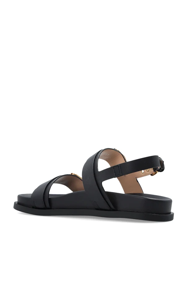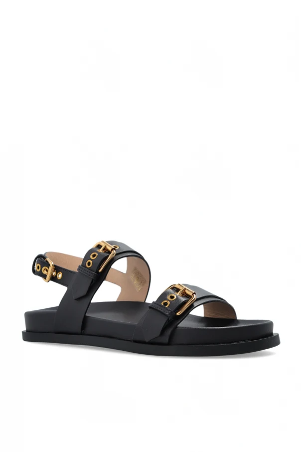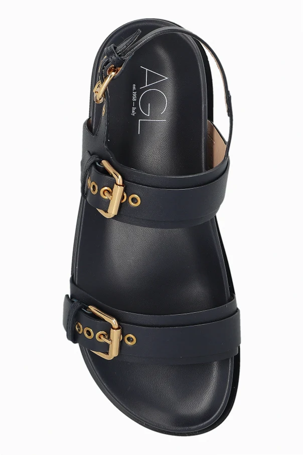 Embodying refined minimalism, the ‘Cristina’ sandals by AGL exude understated elegance in black . Crafted in Italy from supple, high-grade leather, these flats blend contemporary sophistication with enduring comfort. The classic silhouette features a closed heel and generously cushioned outsole for all-day ease. Two wide, adjustable straps cross the foot, each accented by opulent gold-tone buckles that add a touch of polish while enhancing functionality. A streamlined ankle strap, finished with a matching golden clasp and discreet metal detailing, ensures a secure, customizable fit.