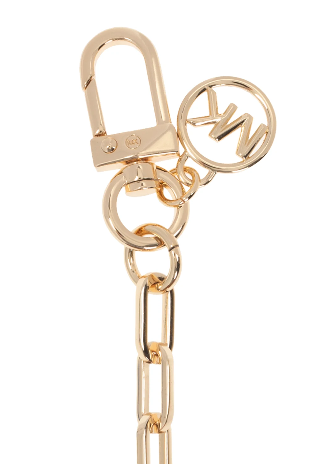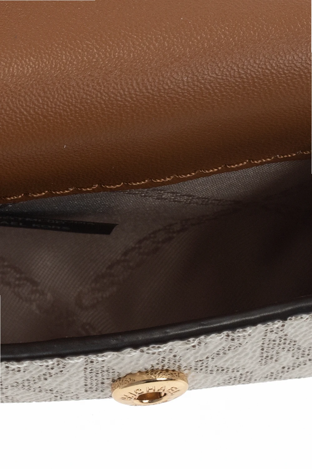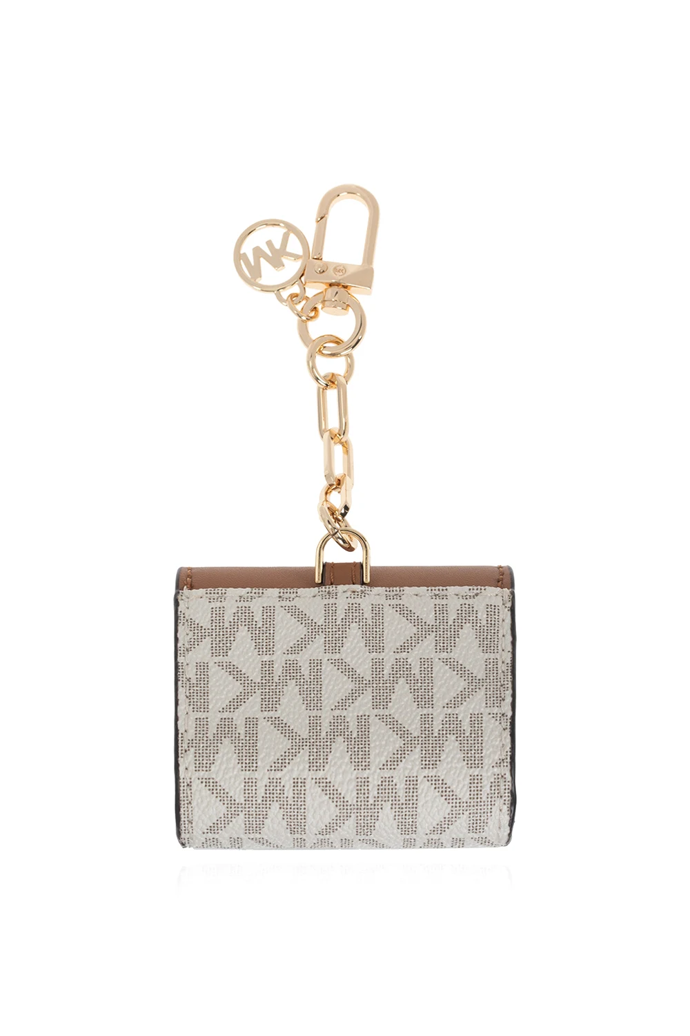 Brown and cream Apple AirPods case from Michael Michael Kors. Crafted from canvas with a monogram pattern, this item features a snap closure, metal logo appliqué, detachable snap hook and gold-tone metal hardware.
