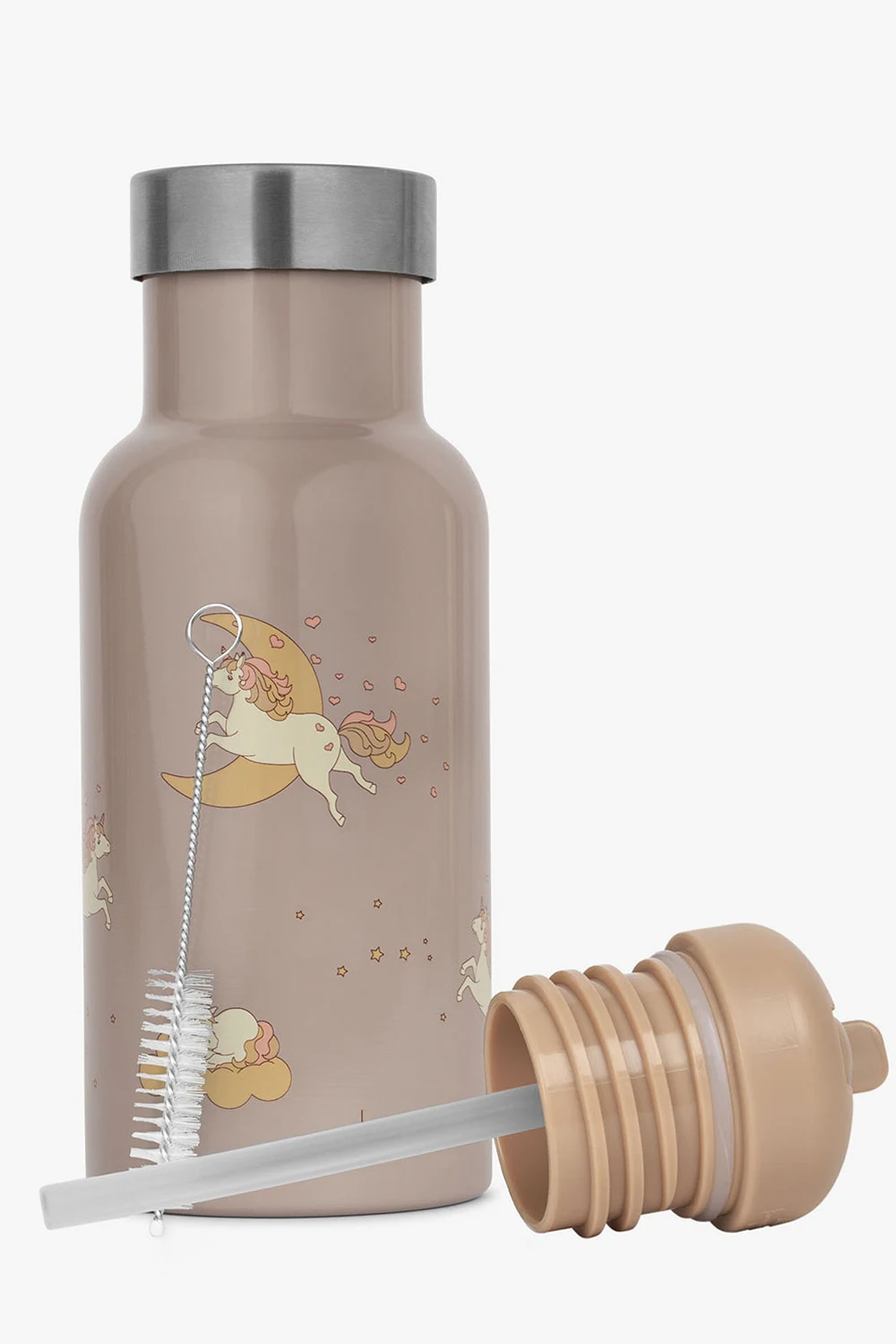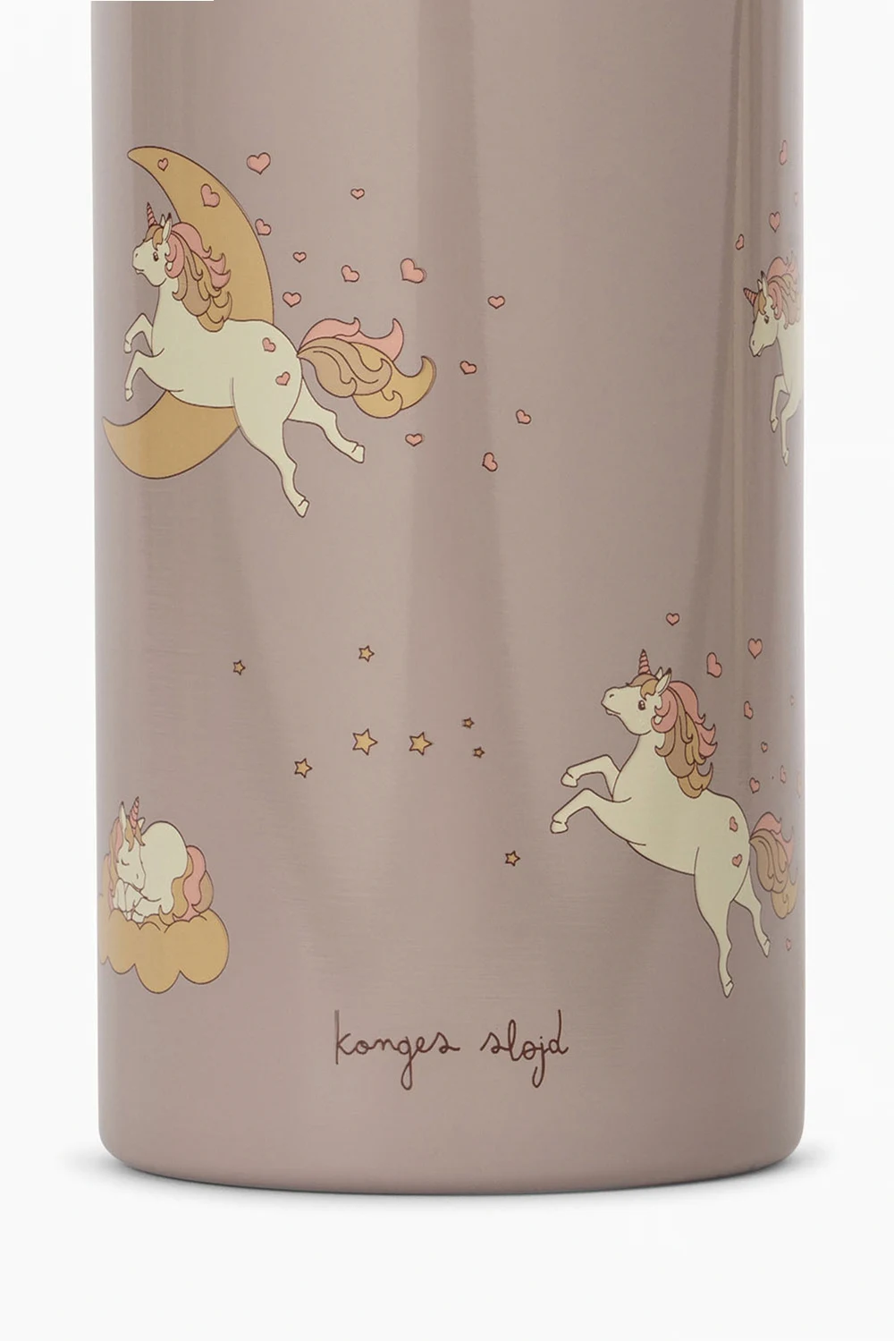Purple thermo bottle from Konges Slojd. Produced from stainless steel, this item features a silver-tone metal lid, plastic lid with beige elements, multicolored unicorn pattern and logo detail. Comes with a straw and cleaner. Preserves the temperature of beverages, which stay warm for 6 hours and cold for 12 hours.