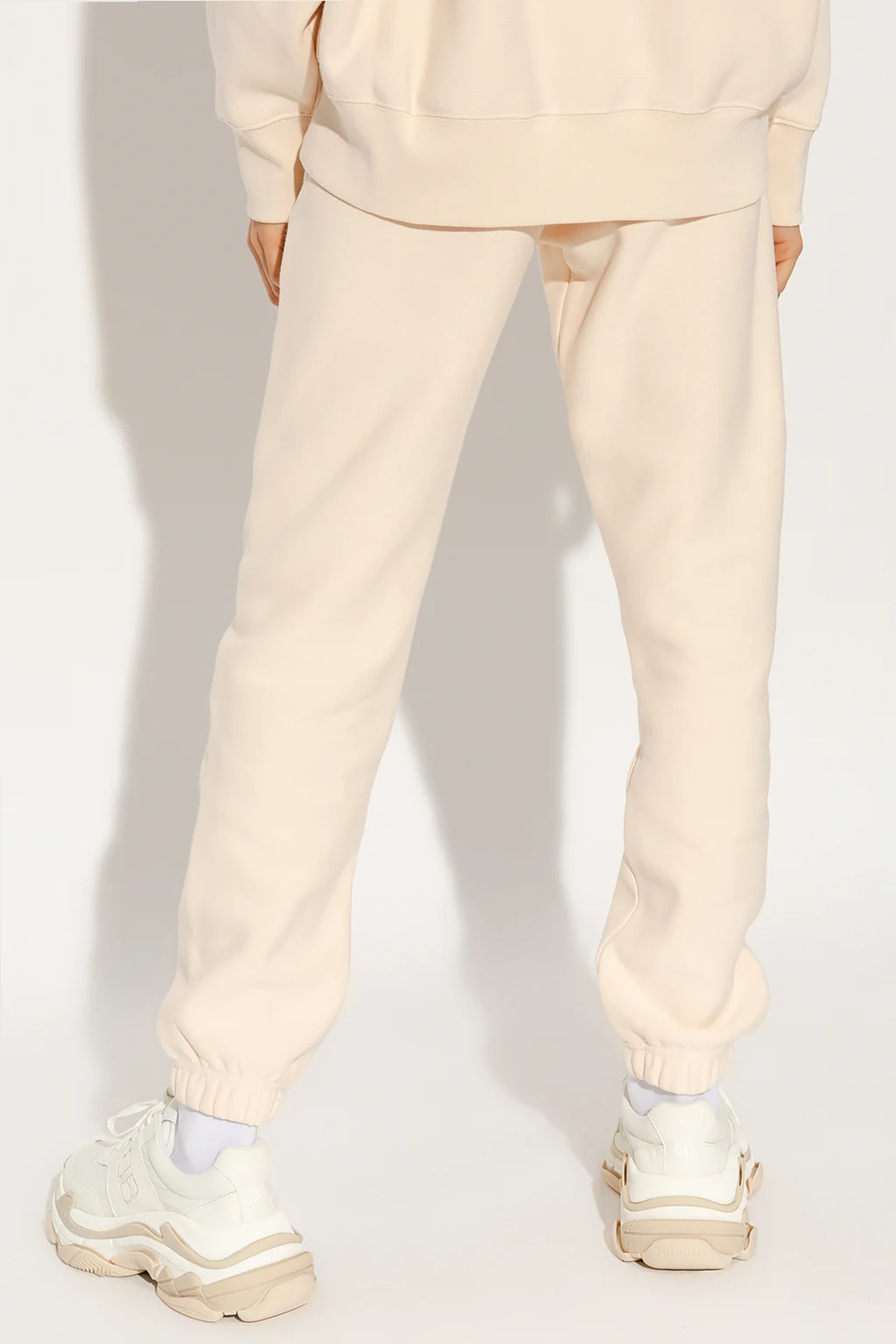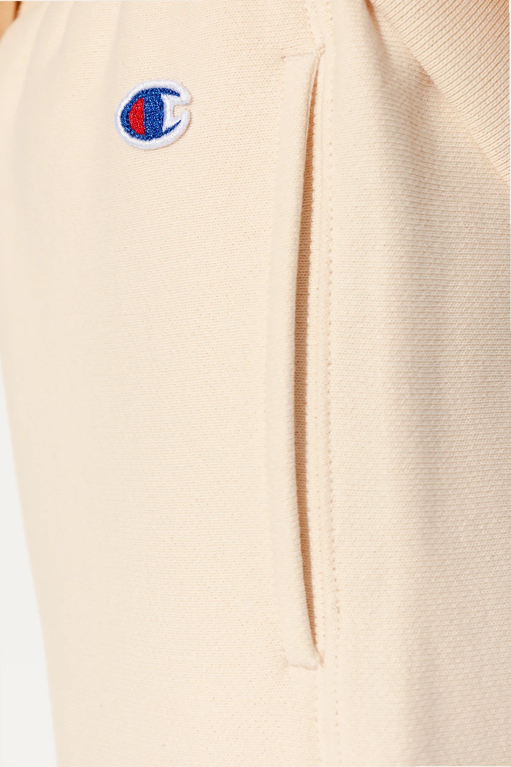 Cream sweatpants from Champion. Crafted from cotton, this pair features an elastic drawstring waistband, logo patch, two slip pockets and ribbed cuffs.