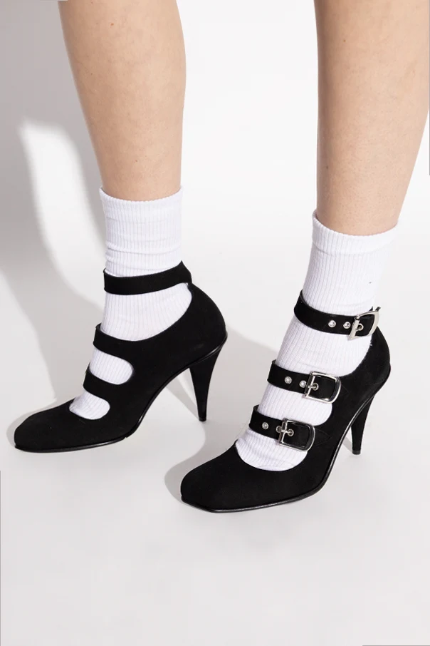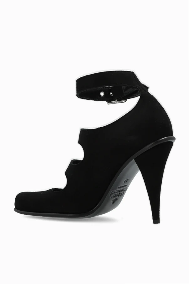 A trio of wide straps, meticulously adorned with oversized silver-toned buckles, cross the arch and encircle the ankle, striking a harmonious balance between functionality and avant-garde allure. Tasteful metallic details and a discreet designer logo accentuate the exclusive character of these shoes, encapsulating Westwood’s rebellious legacy in modern form.