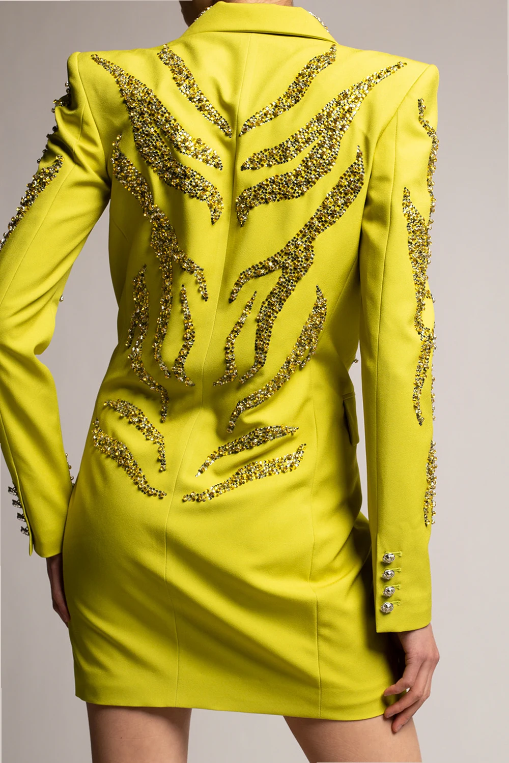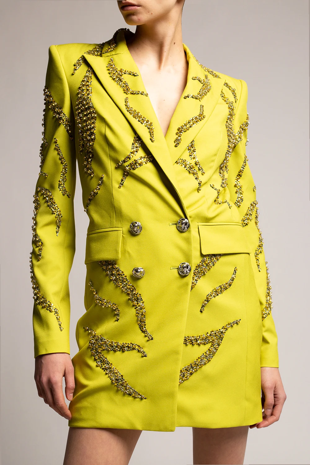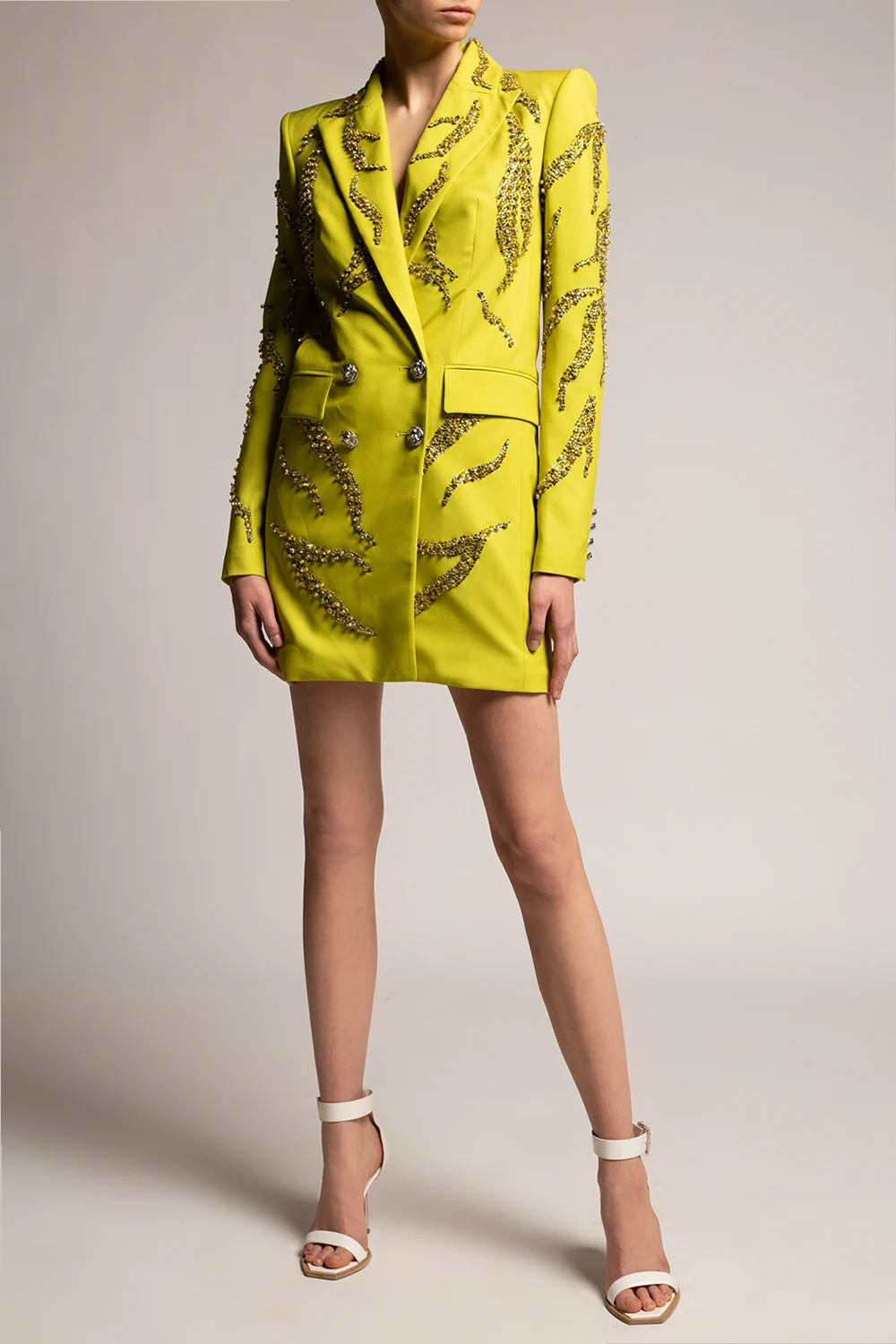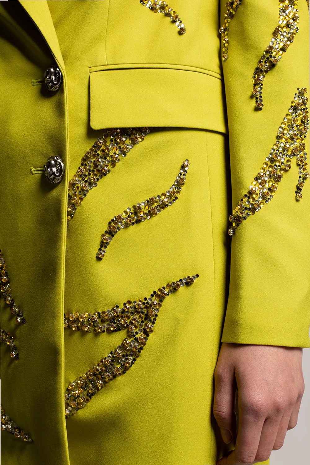 Long green double-breasted dress from Philipp Plein. Fastened with decorative buttons, this design features zebra pattern rhinestone applications in yellow, white and black, two flap pockets and padded shoulders.