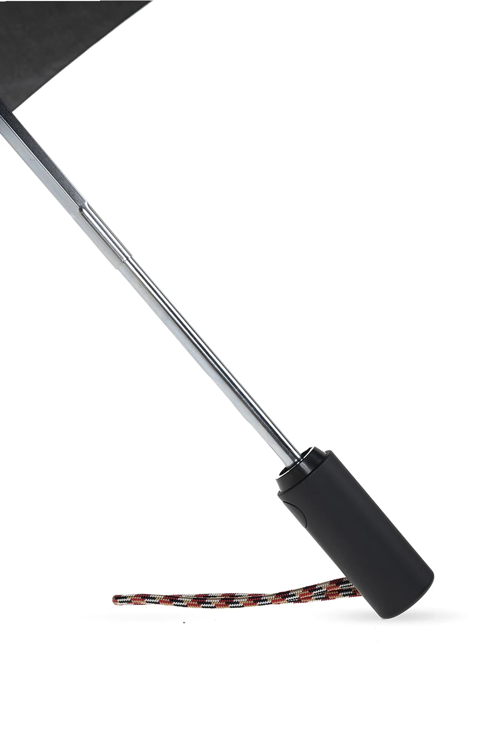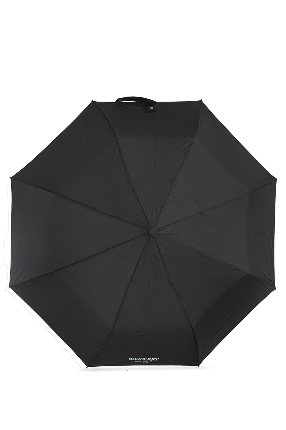 Black folding umbrella from Burberry. This item showcases a white logo print for brand recognition. It comes with a dust cover.