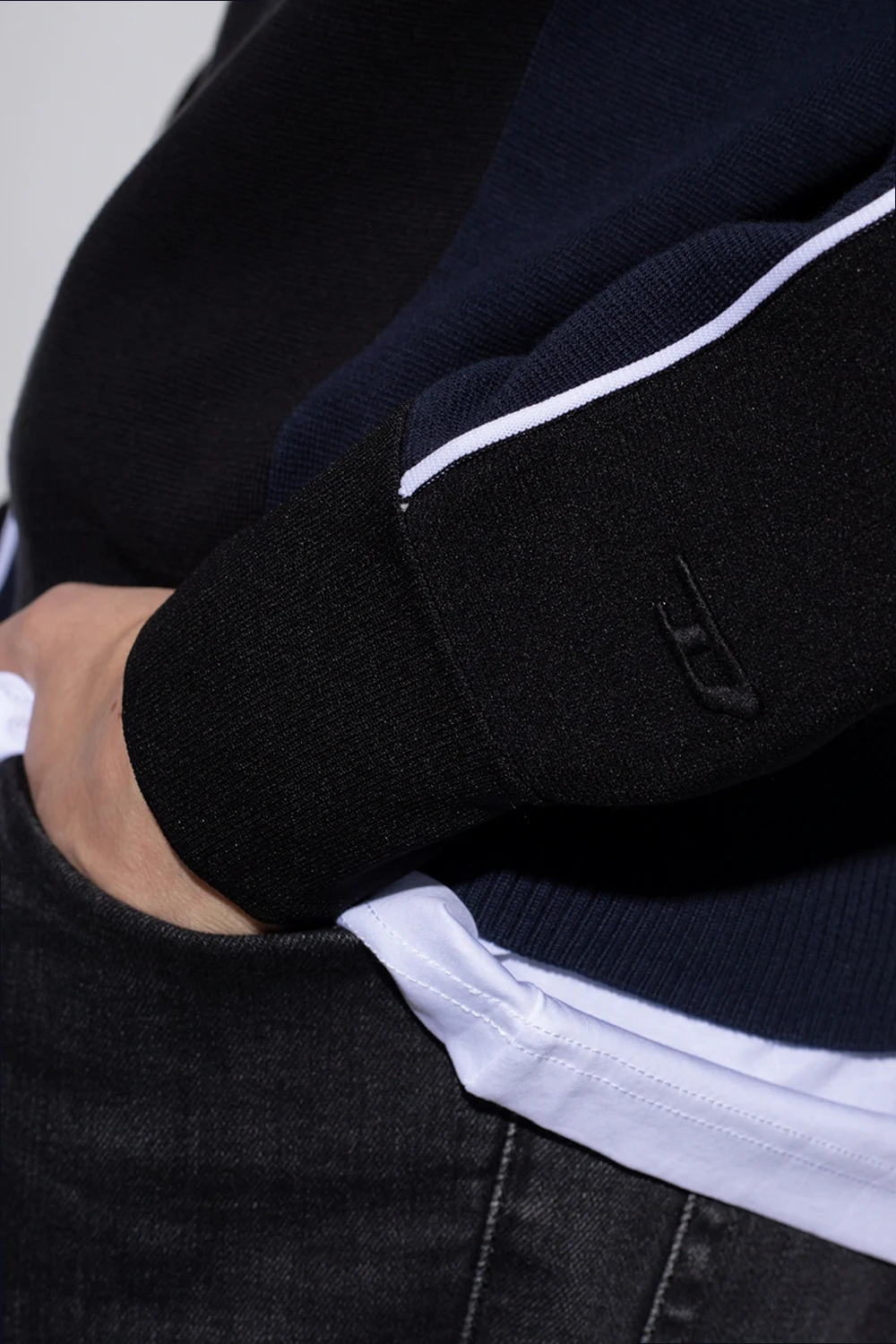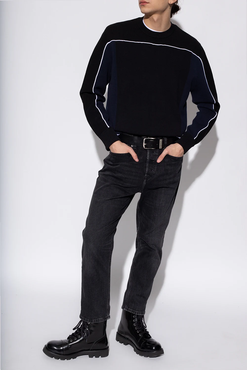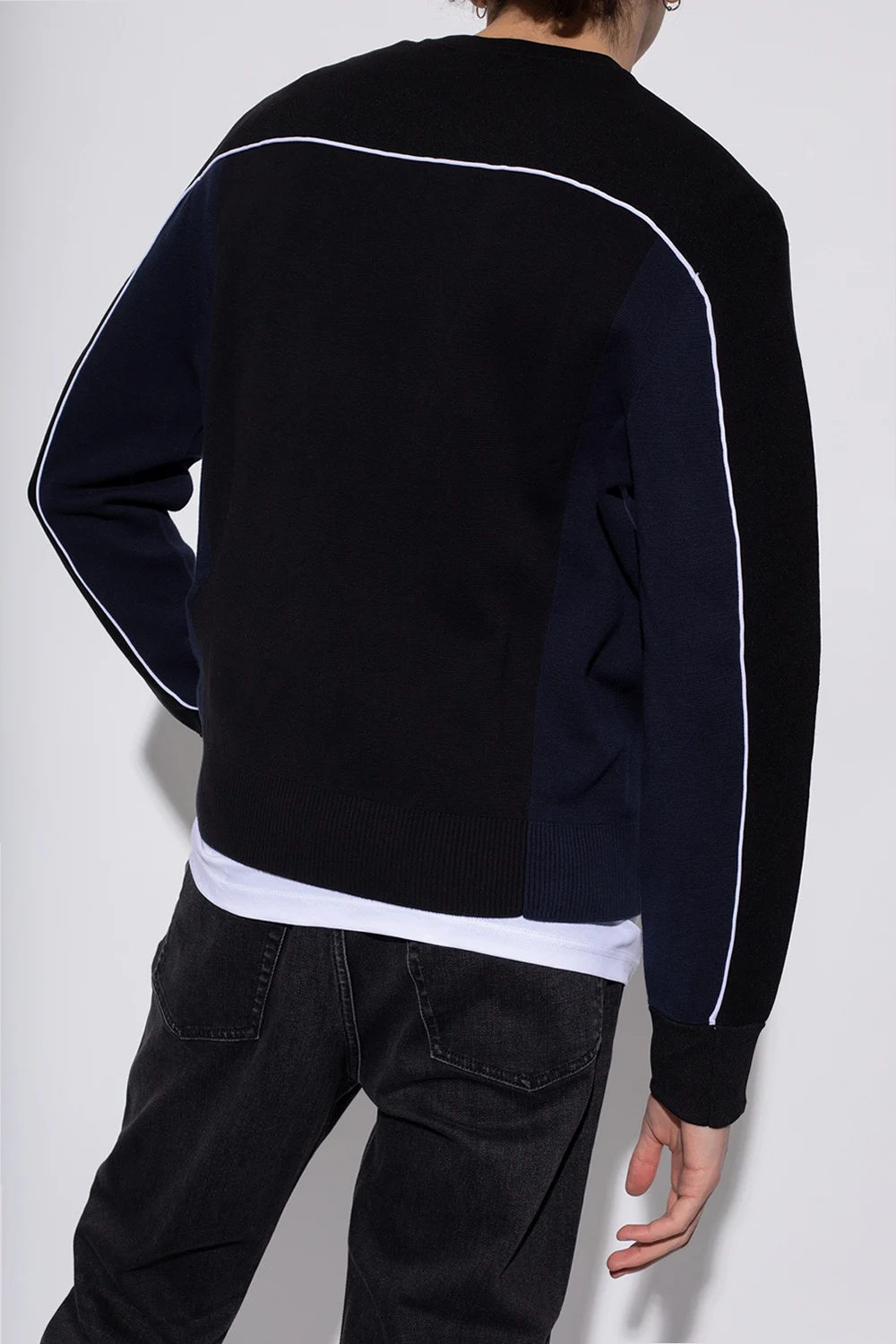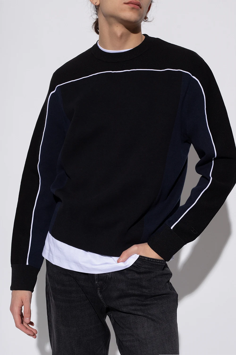 Black and navy blue 'K-Wichita' crewneck sweater from Diesel. Enriched by navy blue inserts and white piping, this style features ribbed trims on the collar, bottom hem and cuffs.