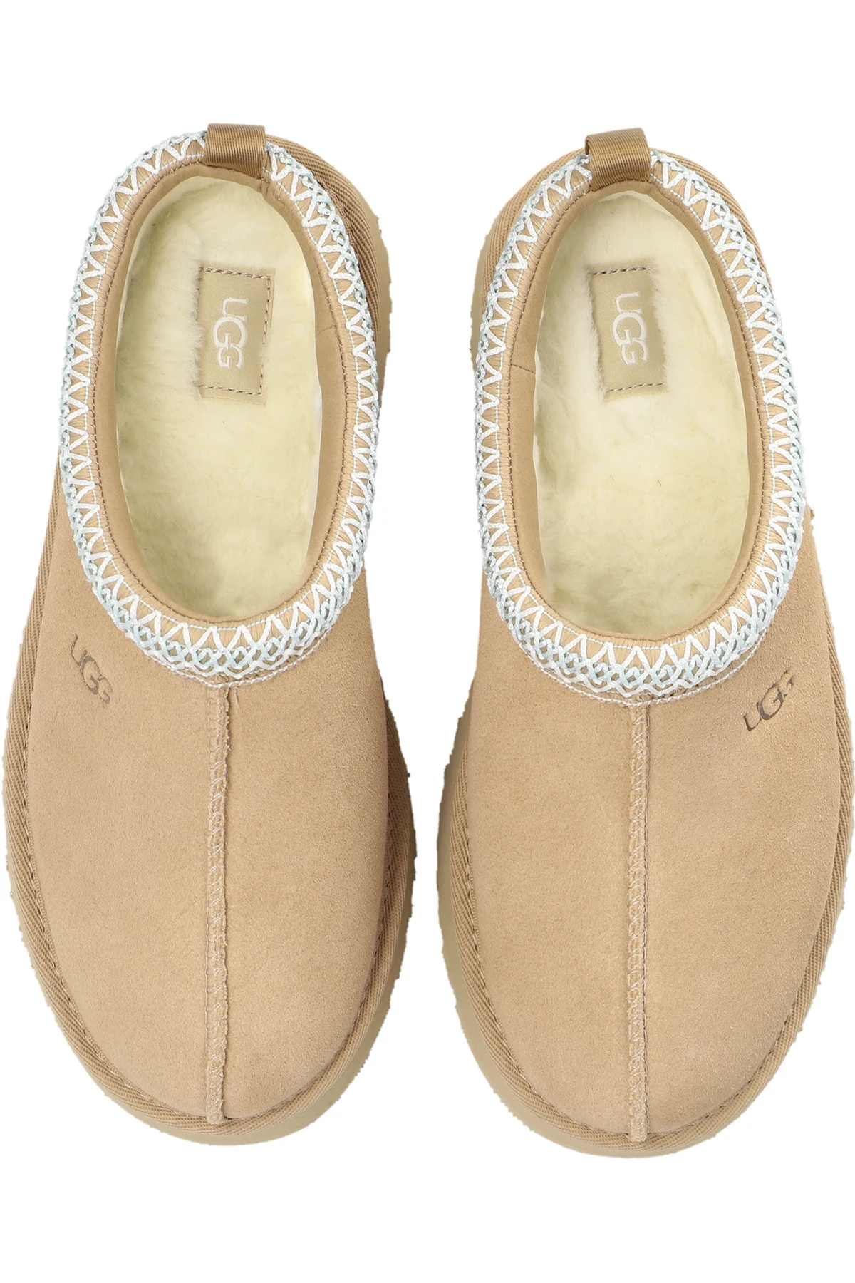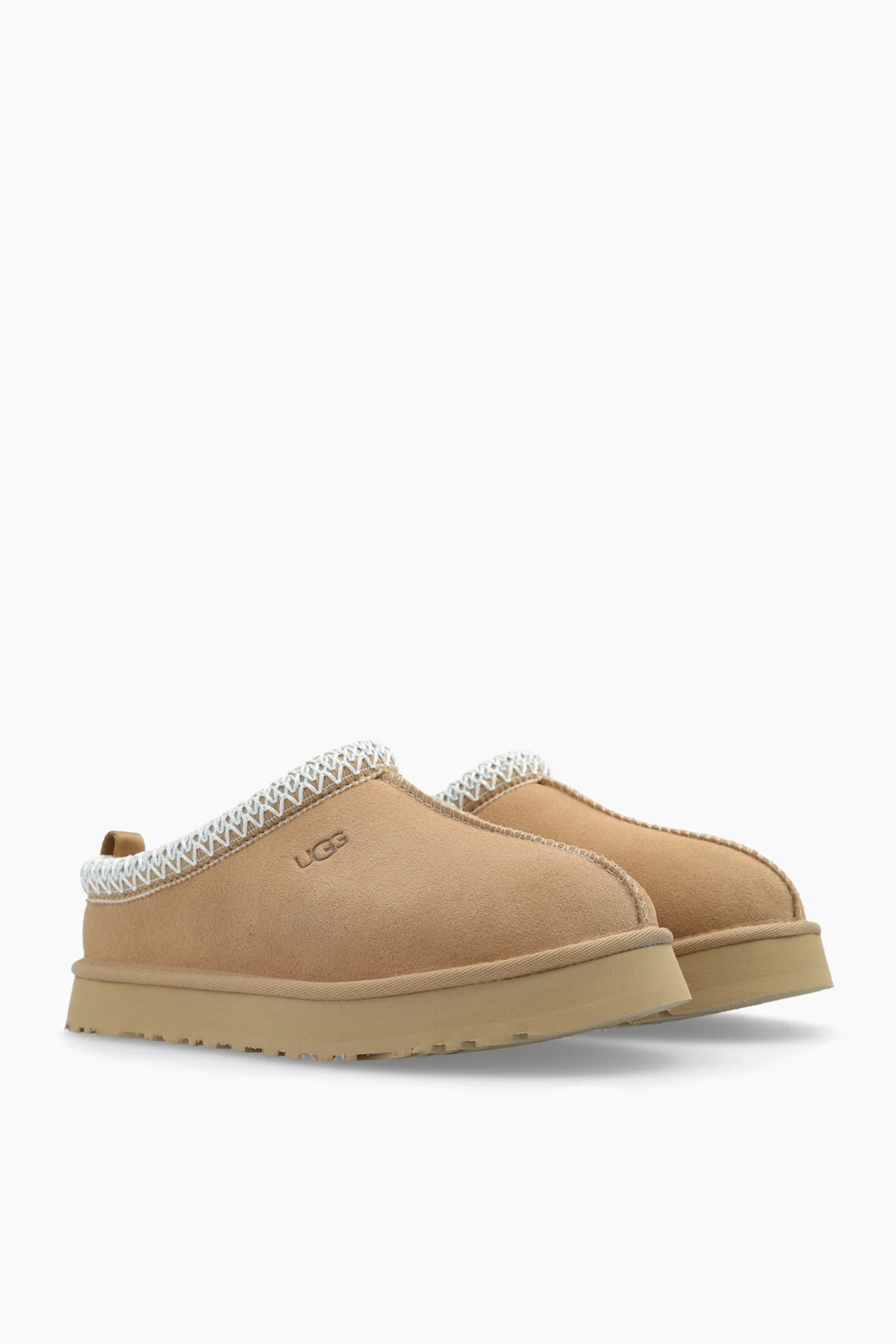 Beige ‘Tazz’ slides from UGG Kids. Made of suede, this pair features decorative stitches in white and blue, dark brown embossed logo, UGGplush™ insulation and light brown textured EVA sole.