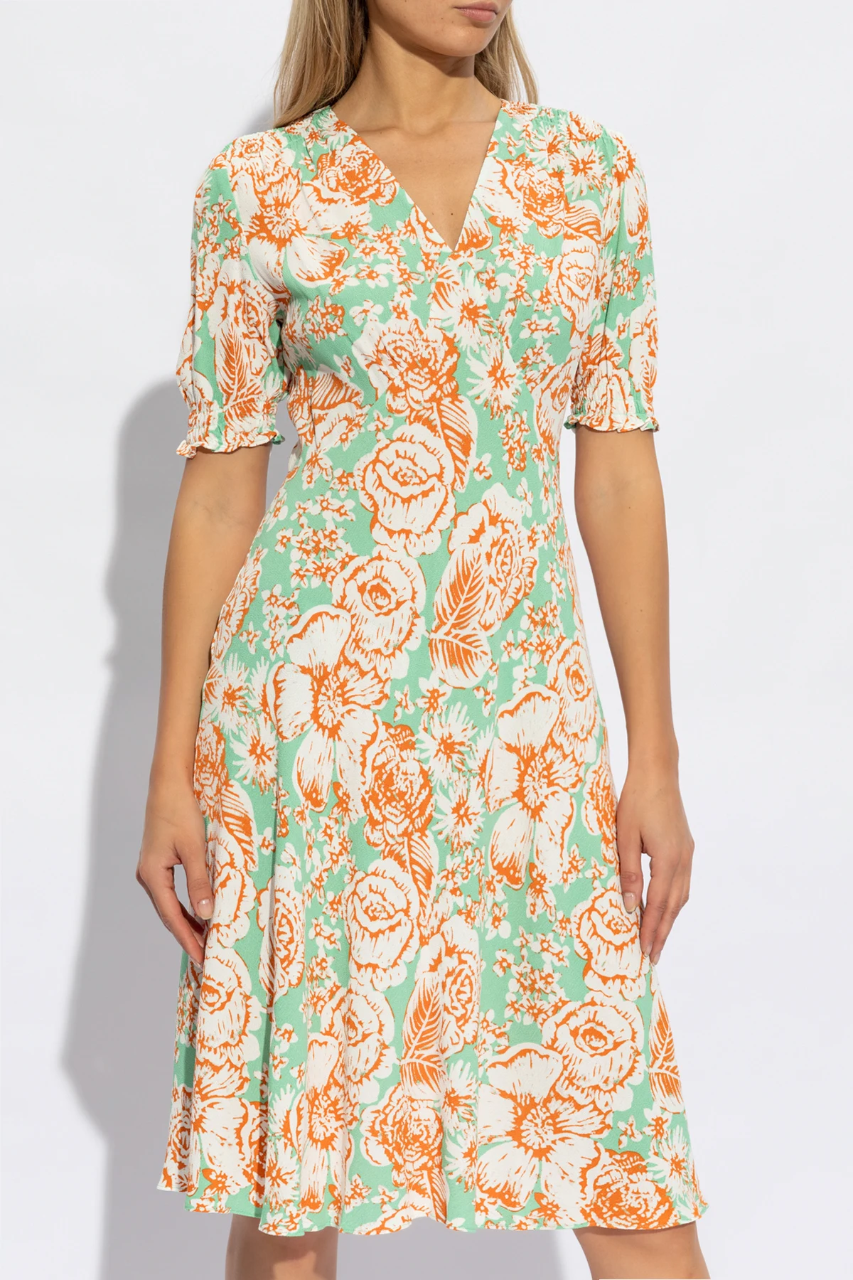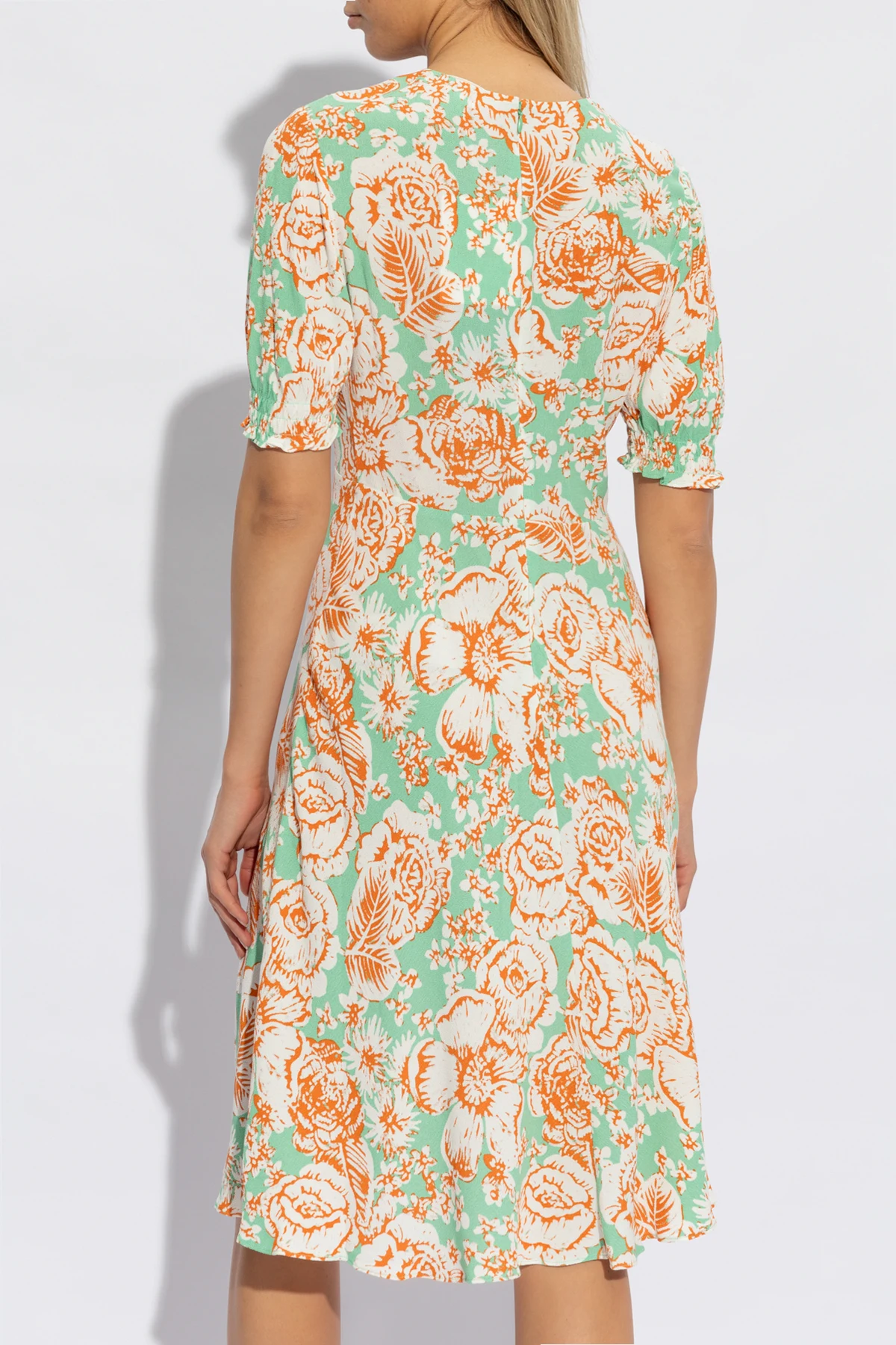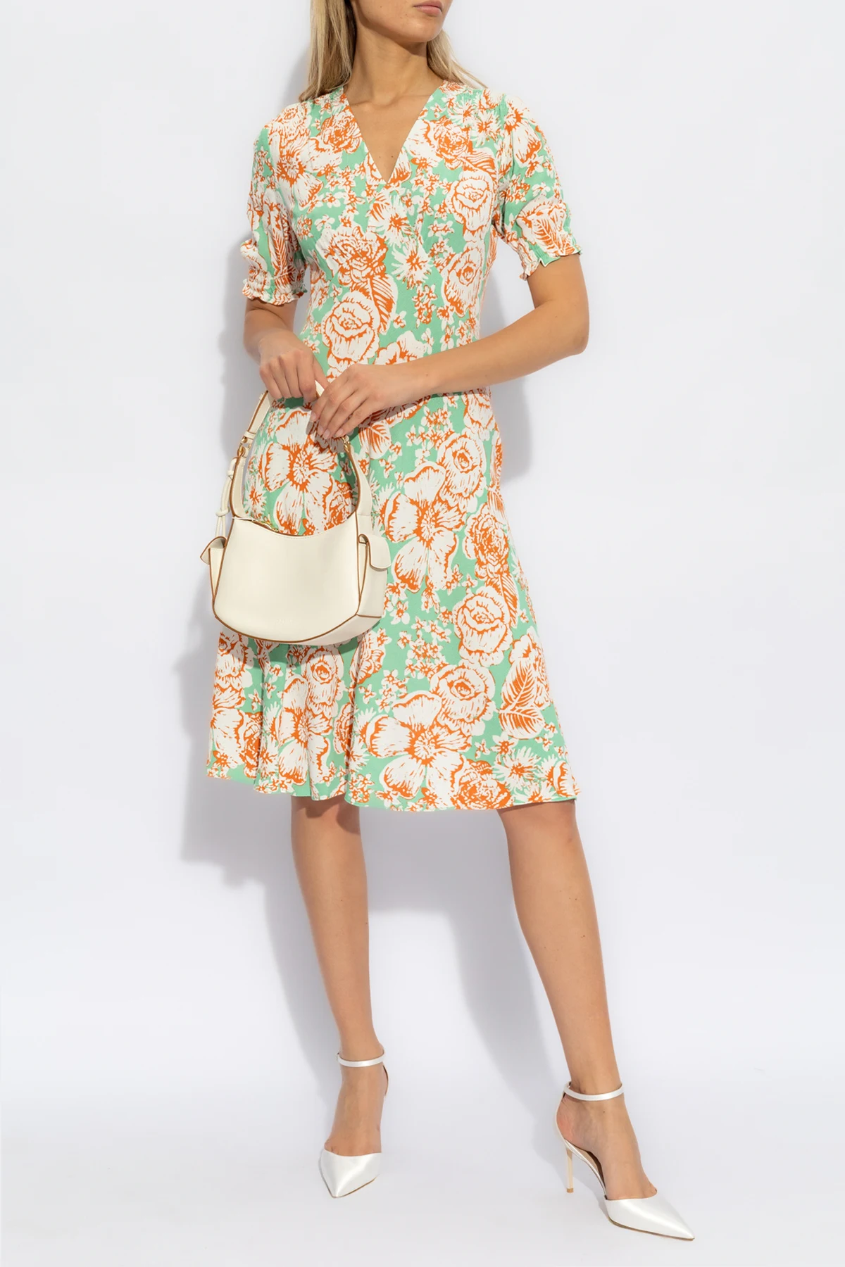 Introducing the 'Jemma' Dress by the illustrious Diane Von Furstenberg, a testament to the confluence of grace and botanical beauty. This piece, with its verdant green canvas accented by lavish floral motifs in shades of orange and white, exudes an aura of sophistication and vibrant elegance. Crafted from the finest 100% Viscose, the fabric presents a subtly lustrous finish, reminiscent of the luxurious touch of silk or satin, adding a hint of allure to your ensemble. The 'Jemma' dress is meticulously designed with a flattering silhouette, featuring a cinched waist that gently flares into an A-line skirt, cascading to a demure midi length. Short sleeves, reaching approximately to the elbow, and a tastefully closed round neckline complement the dress's stately charm, making it a perfect choice for both esteemed formal occasions and refined everyday wear. Concealed at the back with a discreet zipper and hook closure, this dress champions an understated elegance, free from overt branding, embodying the designer's penchant for sophistication. Why Purchase This Dress? Exquisite design by Diane Von Furstenberg, a beacon of high fashion. Luxuriously smooth fabric, offering both comfort and a polished appearance. Unique floral pattern, setting a tone of botanical elegance. Versatile silhouette suitable for formal and casual chic occasions. Commitment to quality craftsmanship, ensuring lasting wear.