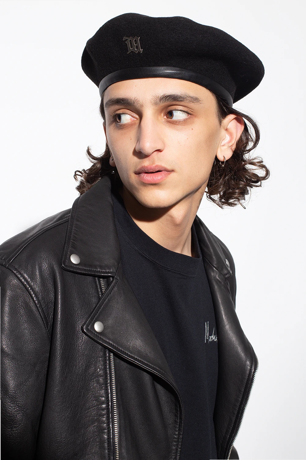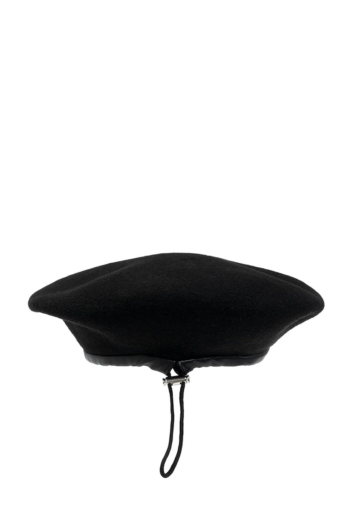 Black beret from MISBHV. Crafted from wool, this item showcases a silver-tone metal logo plaque on the front and a drawstring adjuster.