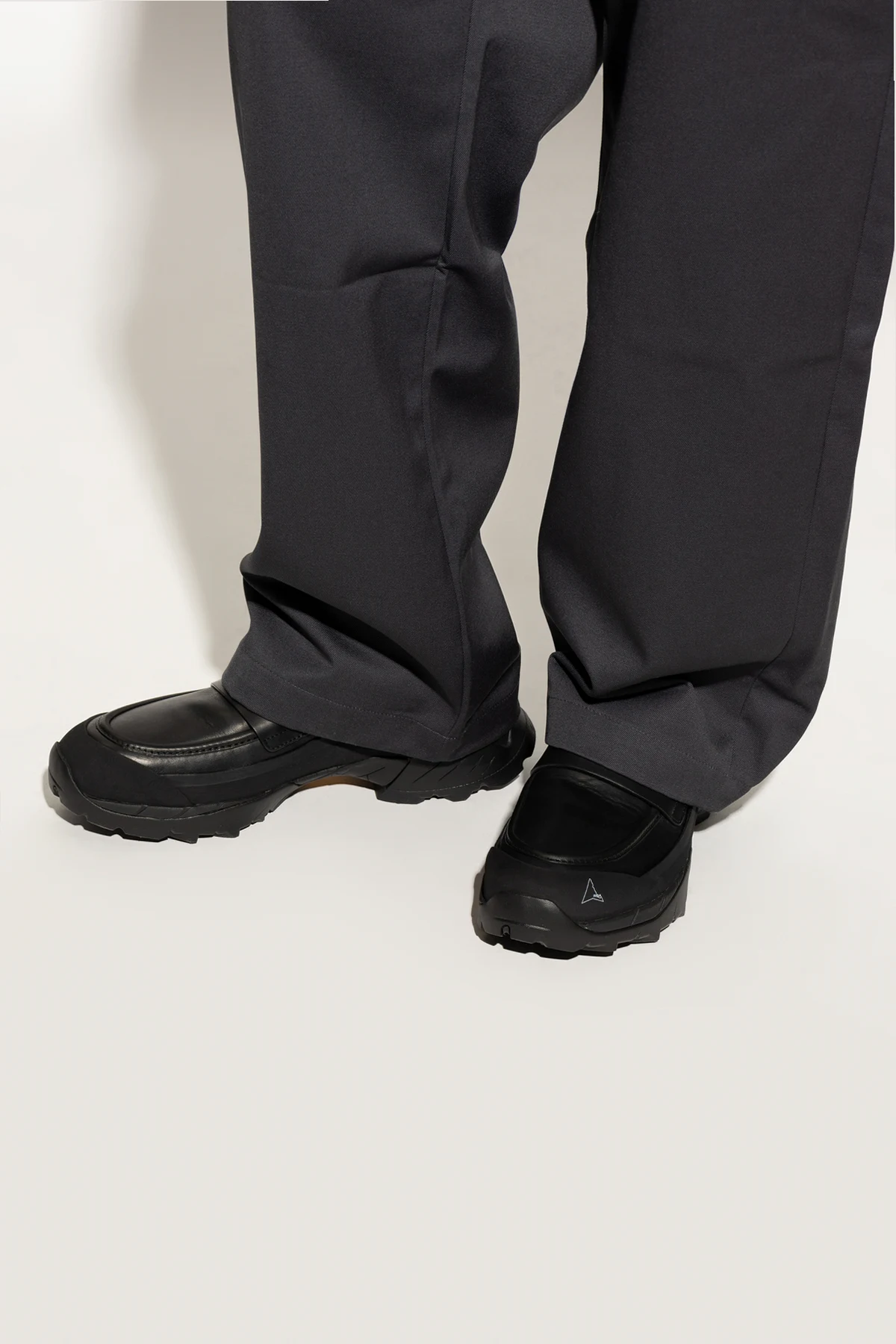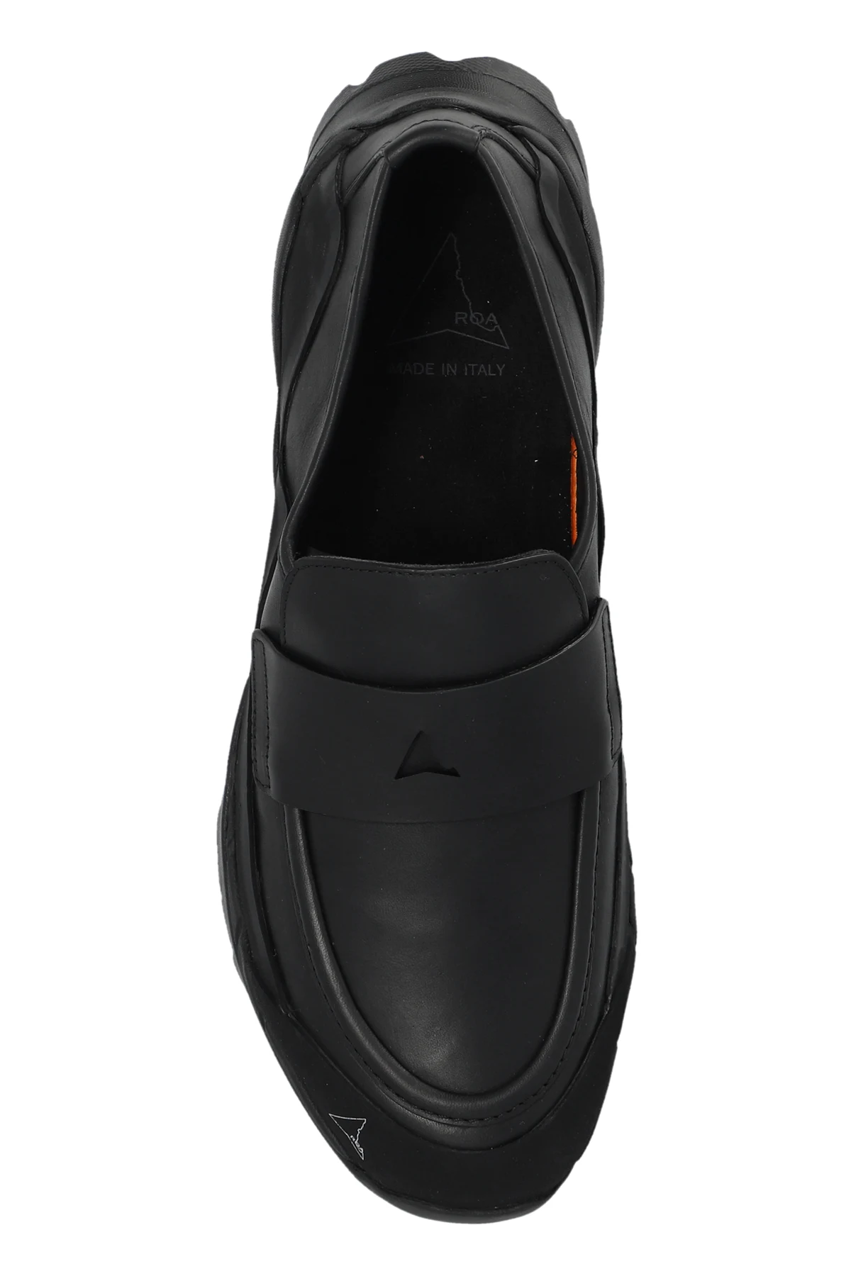 Introducing the epitome of refined footwear: the exclusive Loafer Shoes by ROA. These men's loafers seamlessly blend classic elegance with a contemporary, athletic twist, making them a distinguished choice for the modern gentleman. Crafted from premium smooth leather, the upper part of these loafers exhibits an impeccable finish, exuding sophistication. The robust rubber sole, inspired by sports footwear, not only enhances their unique aesthetic but also ensures durability and superior traction. The aggressive tread pattern suggests that these loafers can handle various terrains with ease. Adorned with a subtle triangular emblem on the front and a broad strap across the instep, these loafers offer a touch of elegance that is both understated and captivating. The dominant black color enhances their versatility, ensuring they complement any wardrobe effortlessly. Additional noteworthy details include the discreet yellow "Vibram" logo on the side of the sole, indicating the use of high-quality materials, and the "Made in Italy" inscription inside, affirming their luxurious origin. These loafers are not merely a pair of shoes; they are a statement of style and comfort. Why Choose This Product? Classic yet modern design High-quality leather construction Durable rubber sole with excellent grip Elegant details and subtle branding Versatile black color Made in Italy