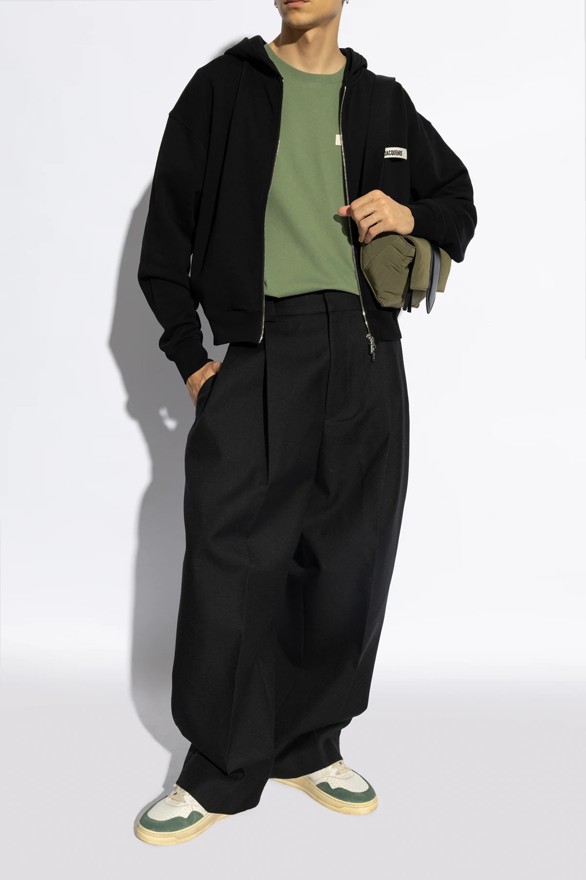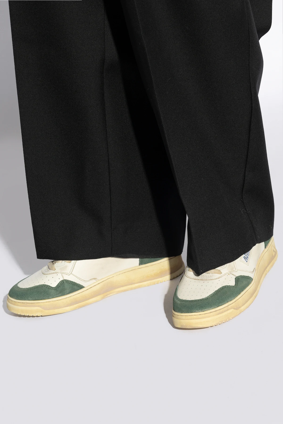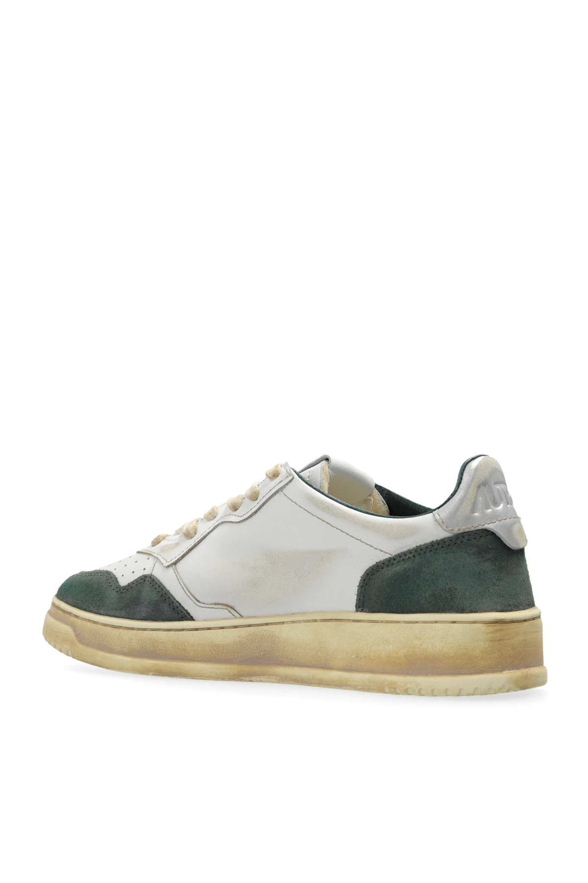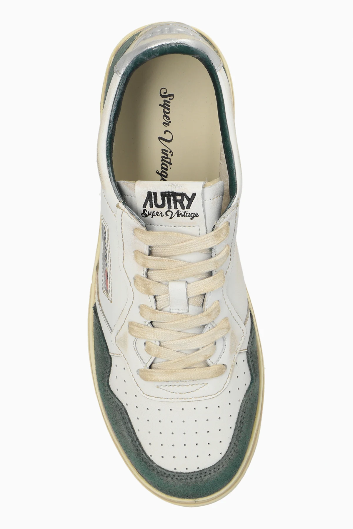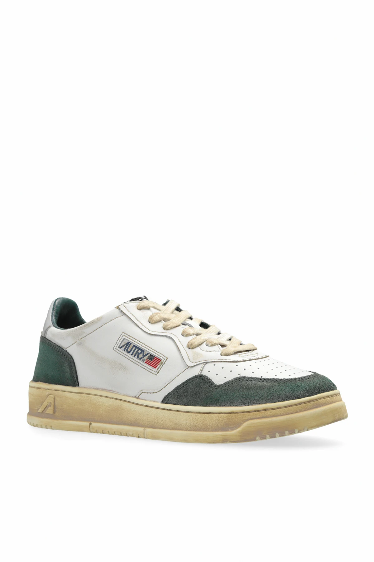 Introducing the Supvin Low sneakers from the renowned designer Autry, a quintessential blend of retro charm and modern flair. These exclusive low-top sneakers boast a classic silhouette, meticulously crafted from premium white leather and accented with dark green suede panels around the toes, heels, and side panels. The distinctive AUTRY logo, accompanied by a small American flag, is elegantly embroidered on the side, while the leather tongue also showcases the brand's iconic insignia. Perforations on the tongue and near the toe area ensure superior ventilation, enhancing the overall comfort. The bejeweled beige sole, embodying a vintage aesthetic, features an embossed logo along the side, adding a touch of sophistication. Cream-colored laces perfectly complement the retro-inspired design, while the interior, lined with soft material, promises unparalleled comfort with every step. Why Choose This Product? Classic Design: A timeless low-top sneaker silhouette. Premium Materials: Top-grade white leather and dark green suede. Exceptional Comfort: Soft interior lining and ventilated toe area. Unique Details: Embroidered logos and embossed sole. Retro Appeal: Beige soles and cream laces exude a vintage look.