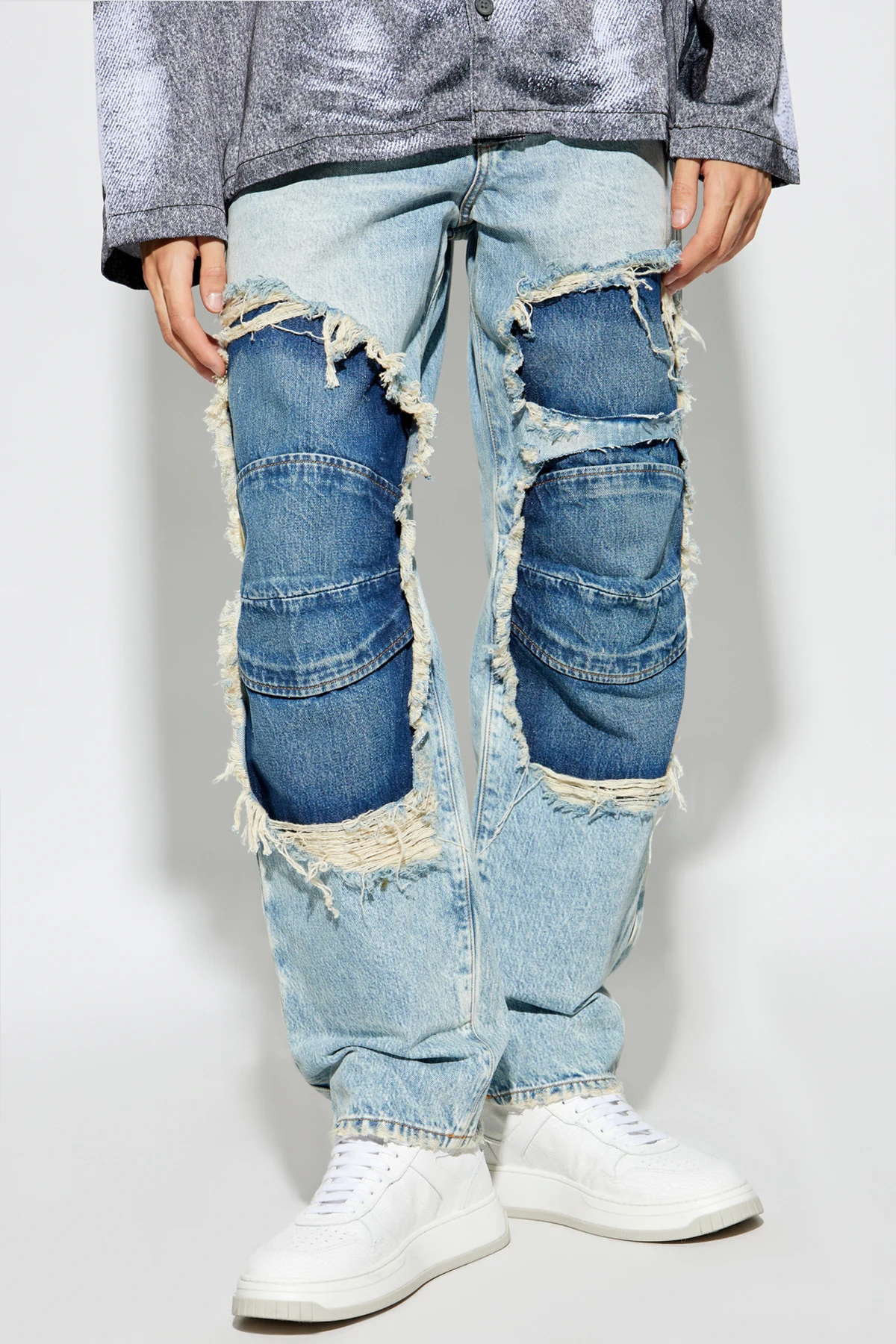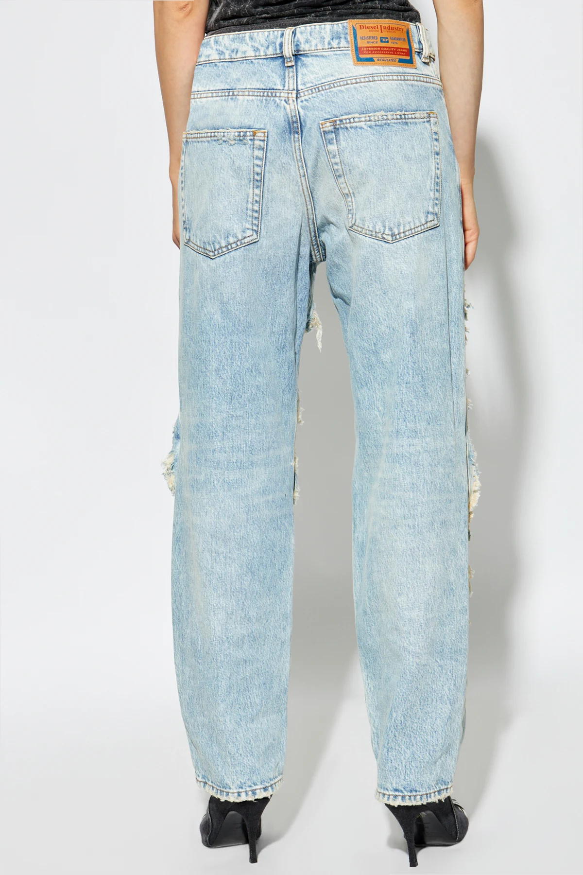 Introducing the exquisite D-FIRE-FSF jeans from our exclusive men's collection, a masterpiece by the renowned Italian designer, Diesel. Crafted from pure, classic denim, these jeans embody a raw, vintage allure with their distinctive frayed edges and irregular abrasions. The regular fit design boasts a comfortable, relaxed cut around the thighs, maintaining a straight silhouette along the legs. The light blue hue, accentuated by darker patches peeking through the distressed areas, exudes a rugged yet sophisticated charm. Thoughtful details, such as the leather patch on the waistband and the two traditional back pockets, enhance the jeans' authenticity and premium quality. The zipper fly and button closure ensure practicality, while the absence of elastane guarantees a true denim experience. Why Choose This Product? High-quality craftsmanship by Diesel, a leader in the fashion industry. Unique, distressed design for a bold, casual look. Comfortable, regular fit suitable for everyday wear. Timeless vintage appeal with modern touches. Durable, 100% cotton material for long-lasting wear.