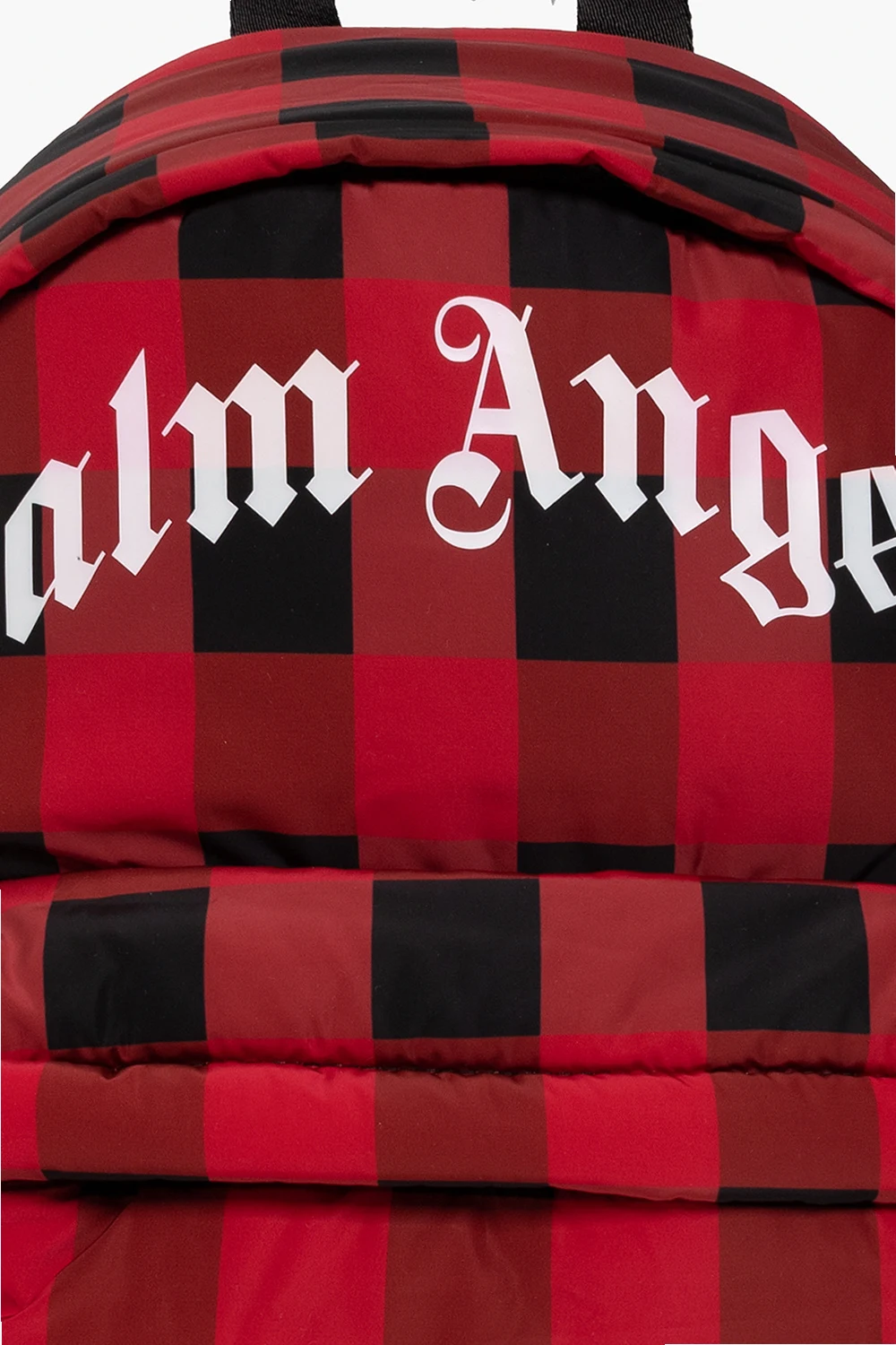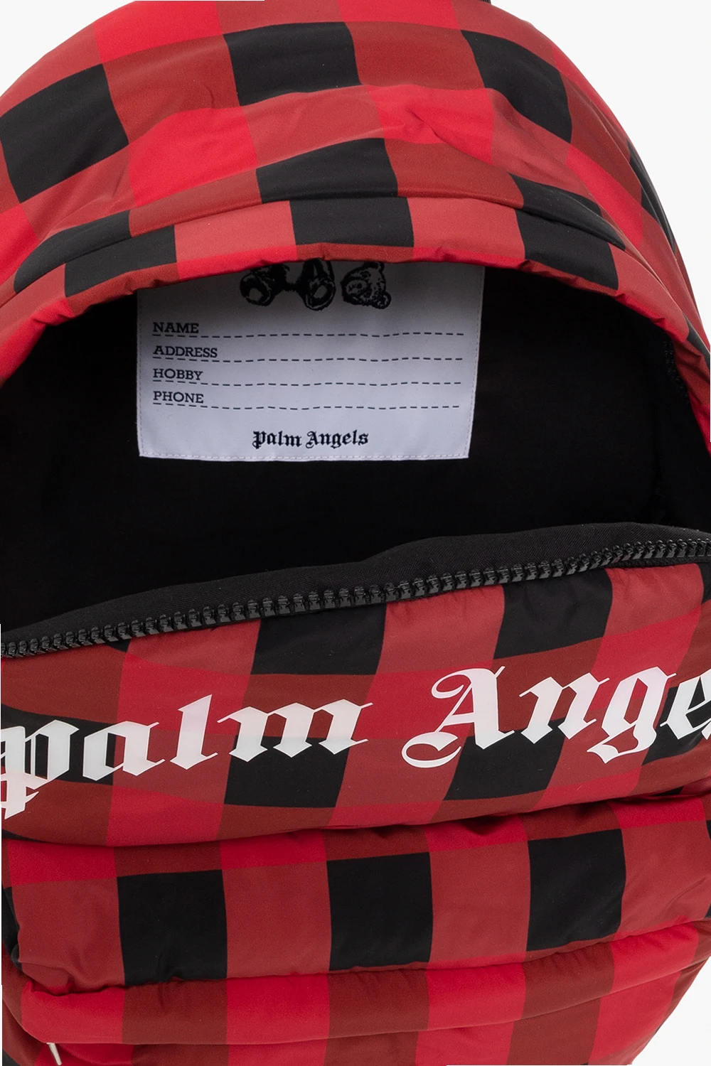 Red and black backpack from Palm Angels Kids. Made of fabric, this design features a check pattern, zip fastening, front zip pocket, white logo print, short handle and adjustable shoulder straps.