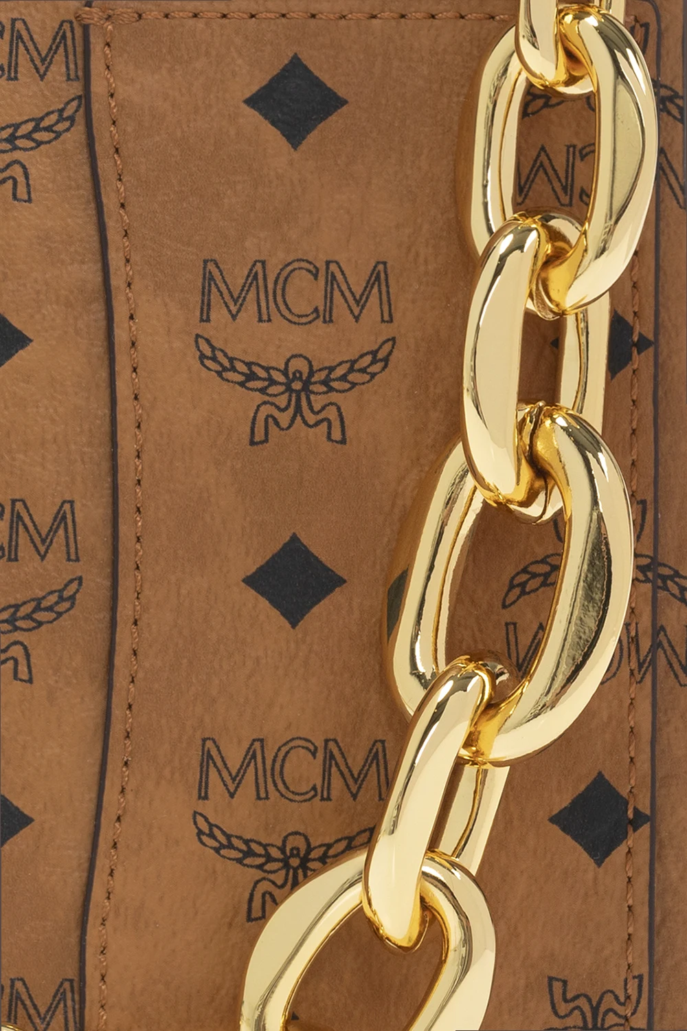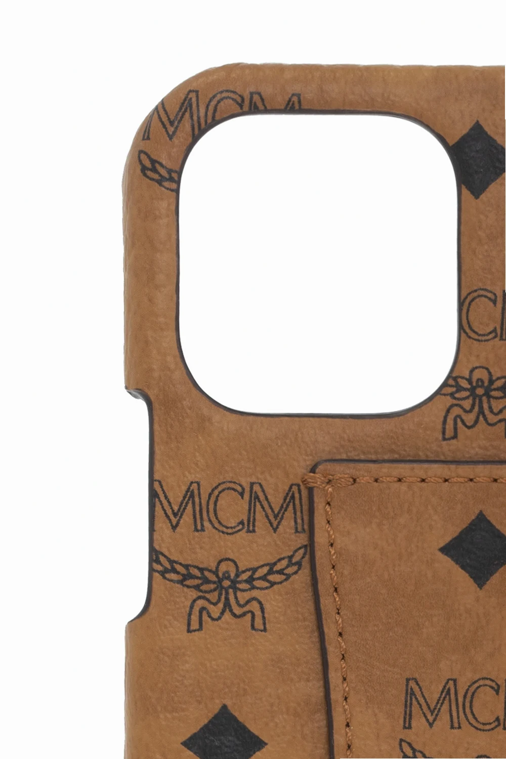 Brown iPhone 12/12 Pro case from MCM. Decorated with a black Visetos pattern, this item is complete with a gold-tone chain handle and a slip pocket.