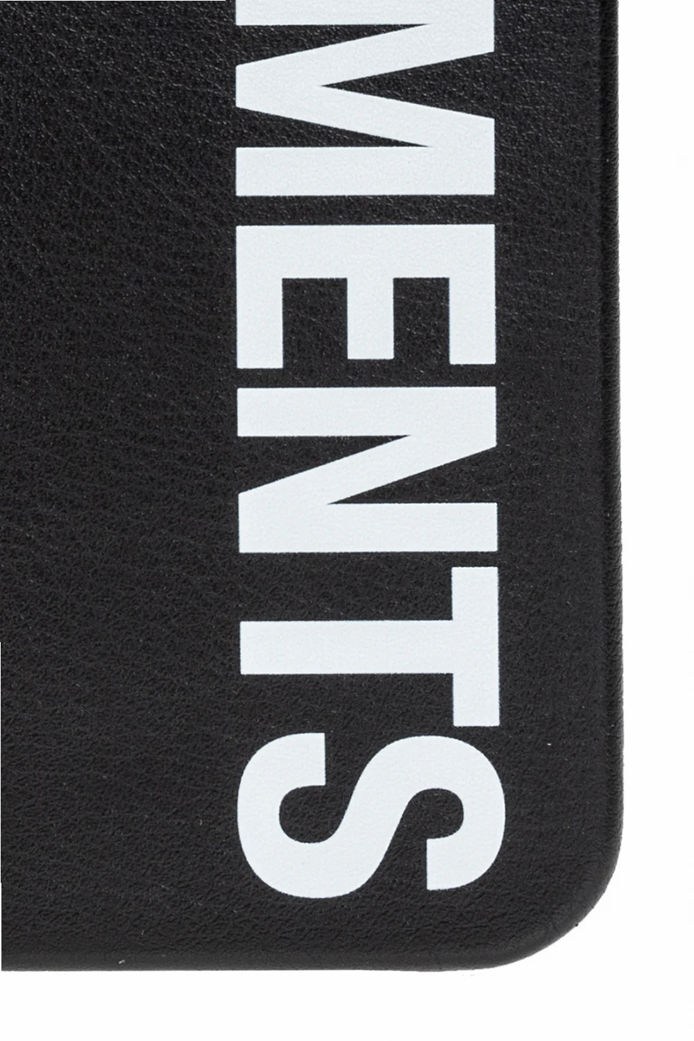 Black iPhone 12 Pro case with a white logo from VETEMENTS.