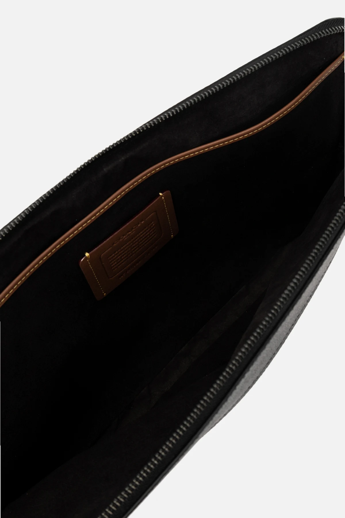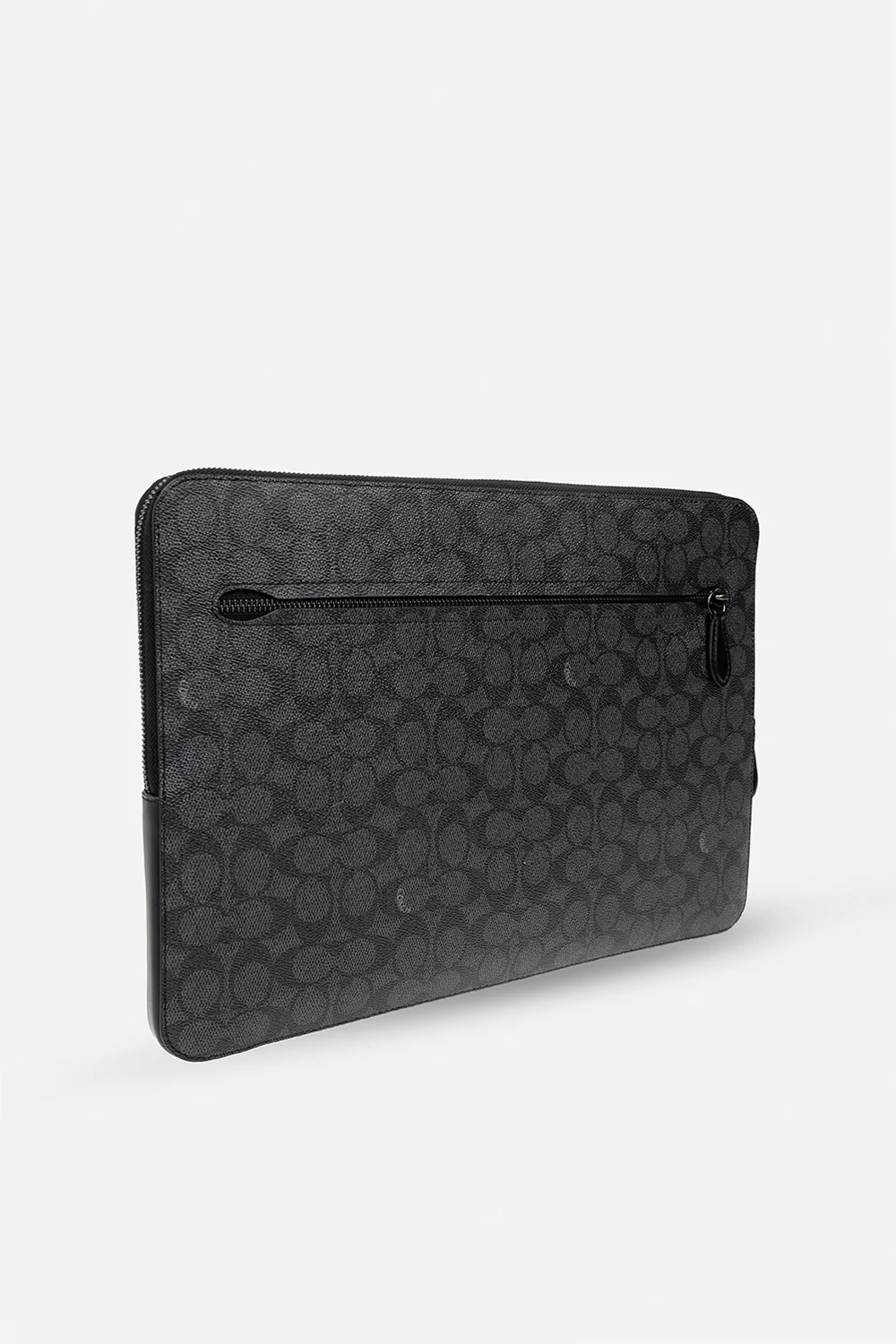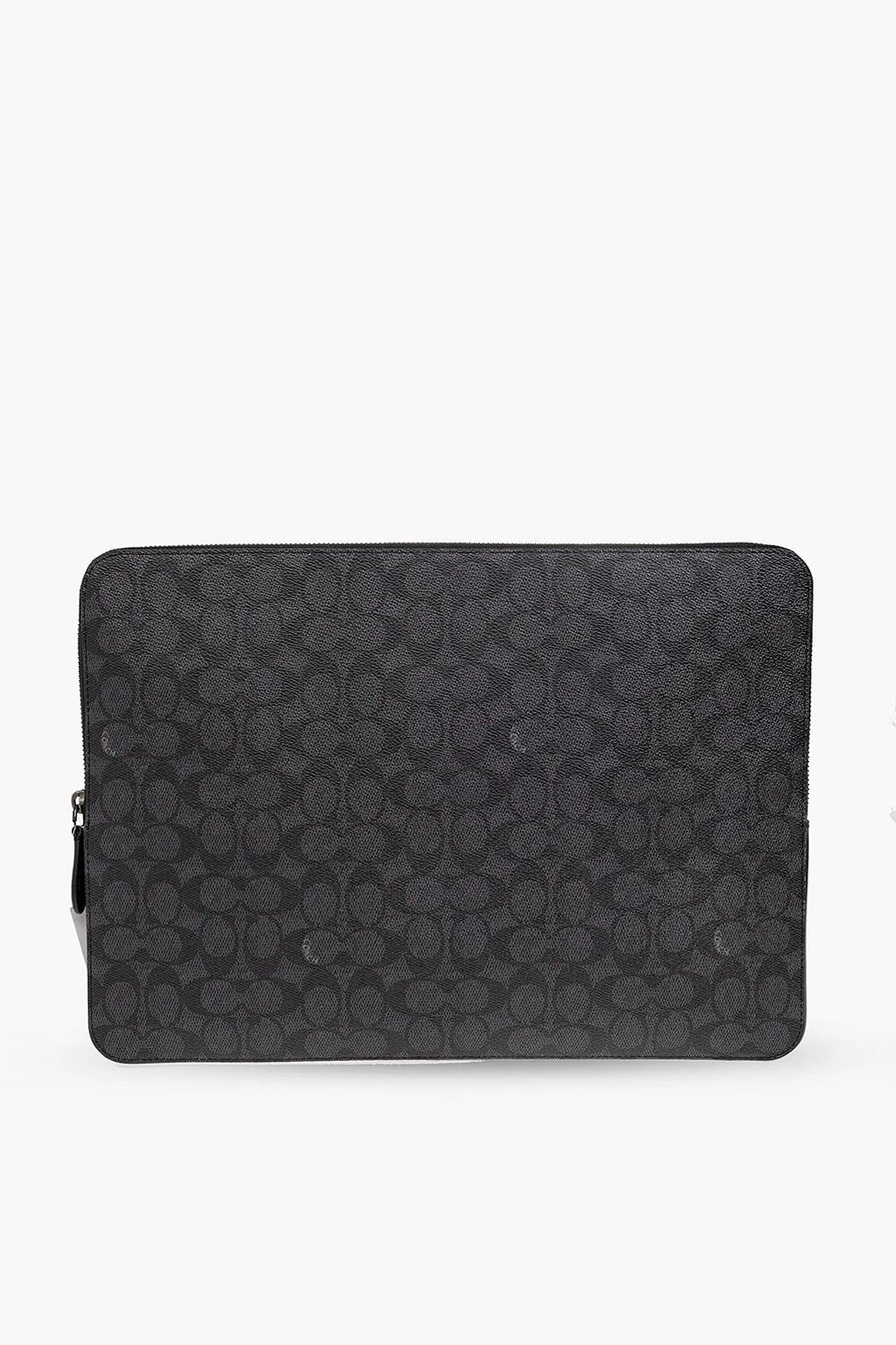 Black laptop case from Coach. Crafted from coated canvas, this design fastens with a zip and showcases a monogram pattern. It is complete with a back zip pocket, silver-tone metal hardware and one internal compartment with a slip pocket.