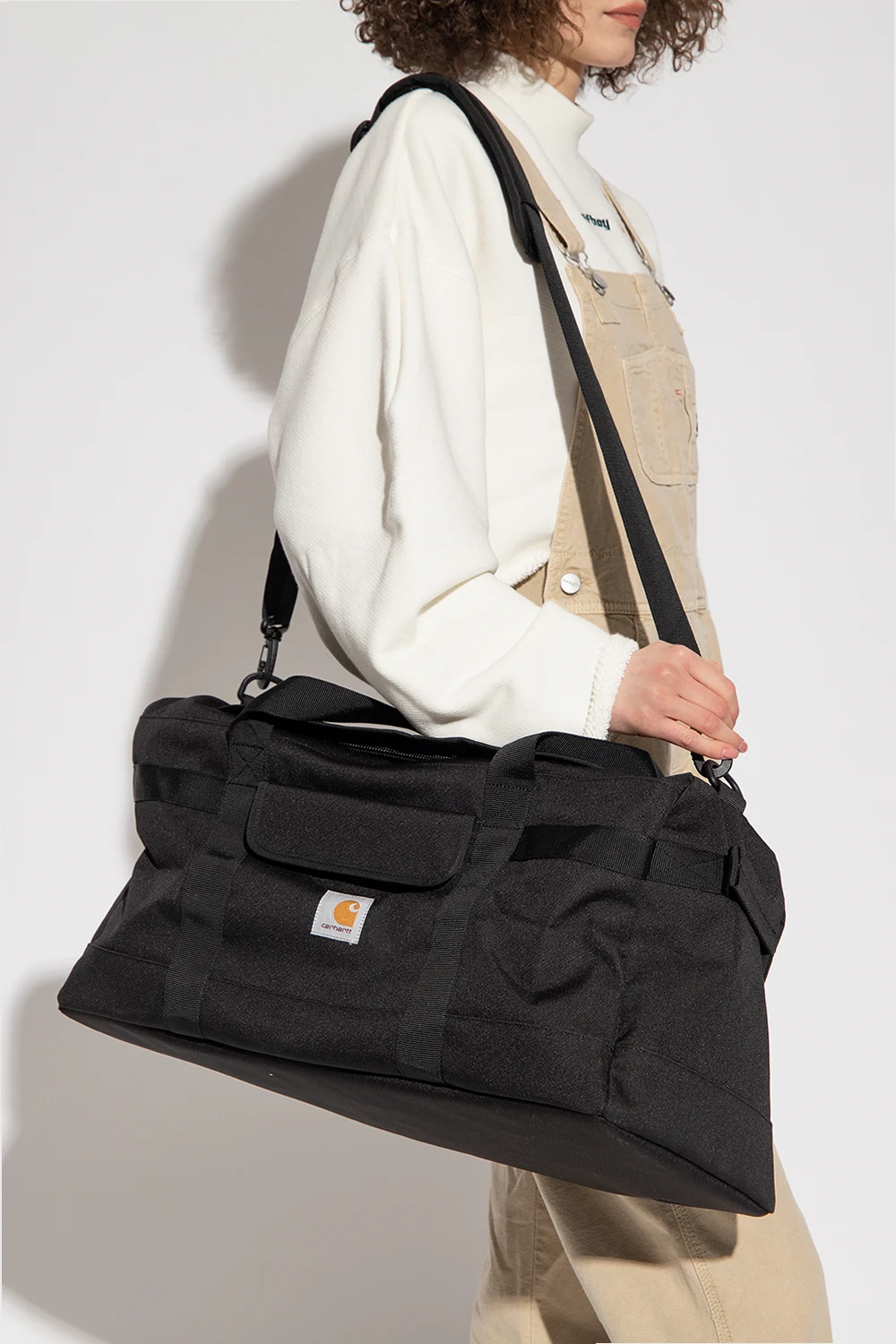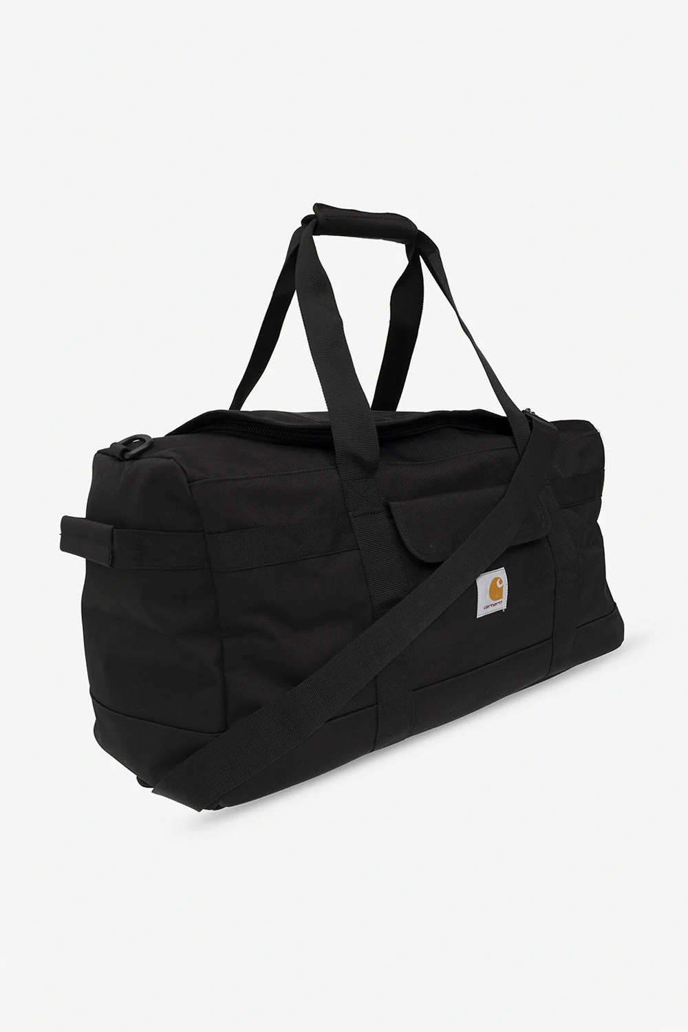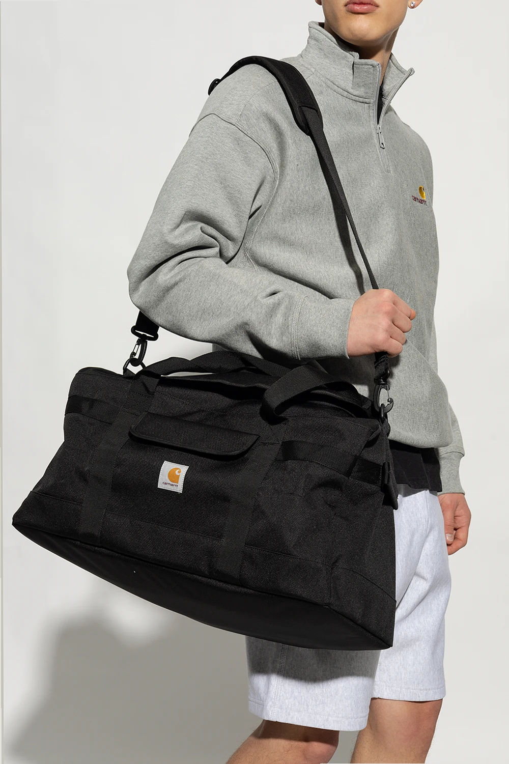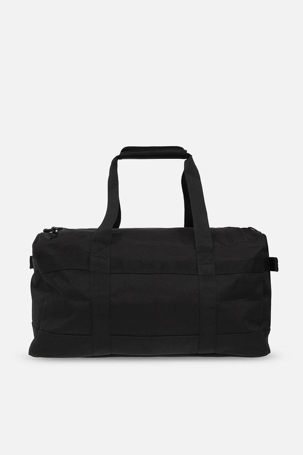 Black duffel bag from Carhartt WIP. Crafted from recycled material, this design fastens with a zipper and features a logo patch, a velcro-fastened pocket with a flap, two half-round handles, a detachable and adjustable shoulder strap and one internal compartment with two zip pockets.