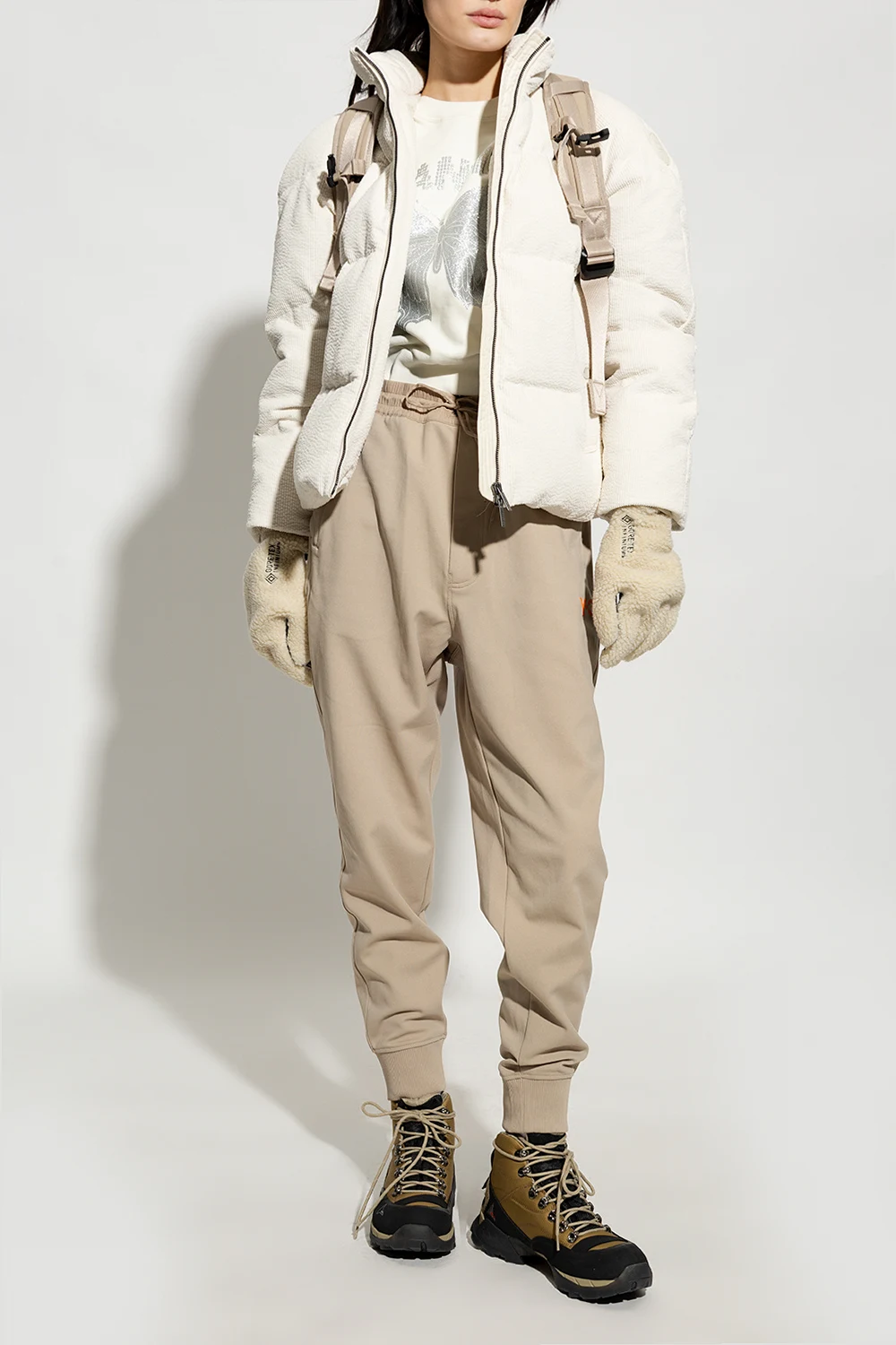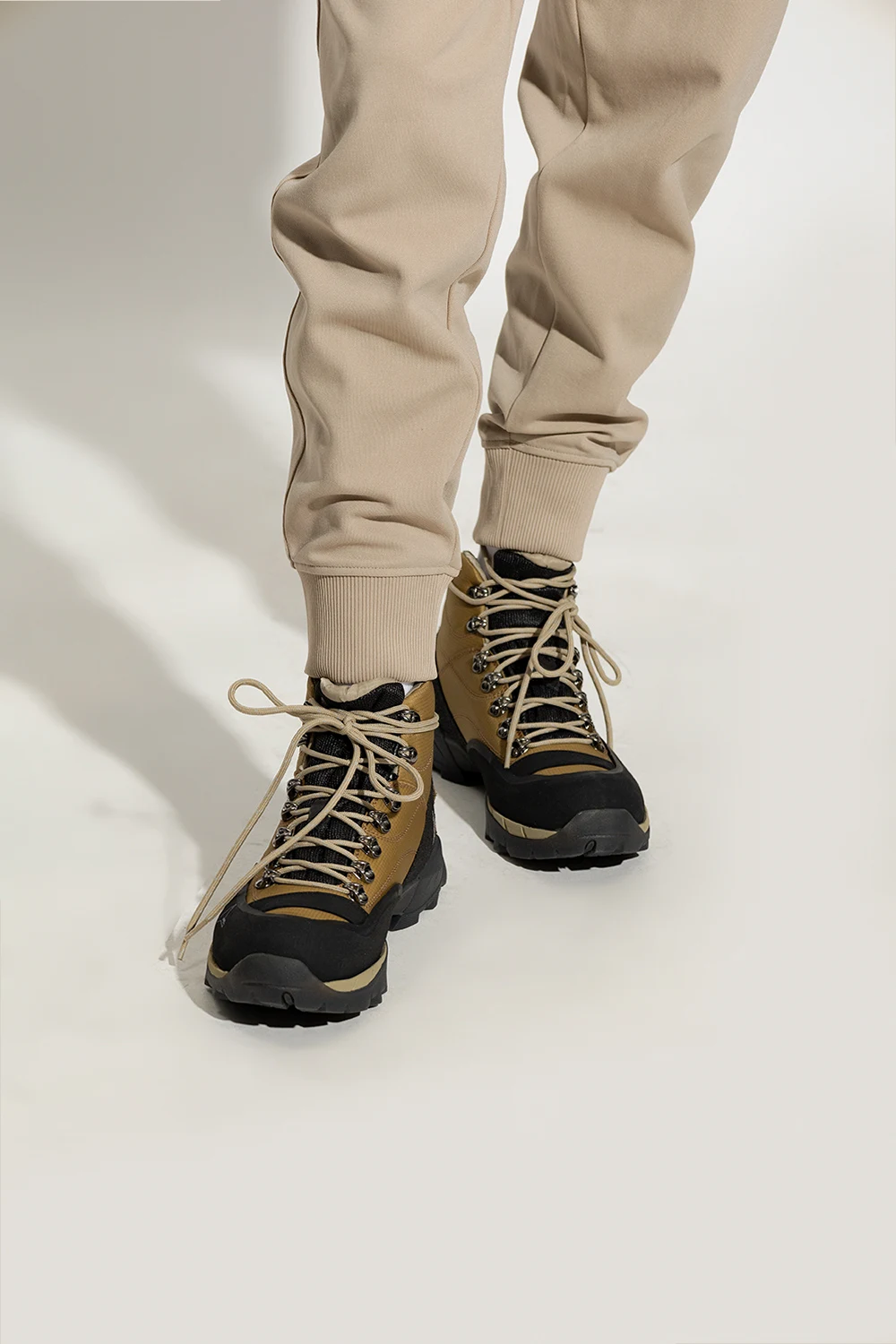 Beige, black and brown ‘Andreas’ hiking boots from Roa. Made of leather and fabric, this lace-up pair features a logo detail, rubber trims and black Vibram® Megagrip toothed tread pattern sole designed for optimal traction that ensures high resistance to use on roughest surfaces.