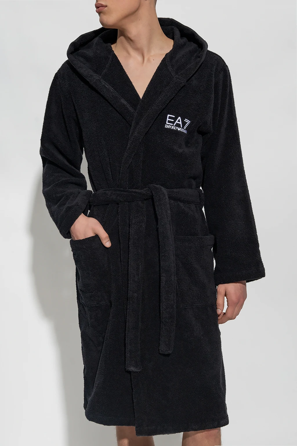 Black hooded bathrobe from EA7 Emporio Armani. Crafted from cotton, this design features a drawstring waist, white logo print and two slip pockets.
