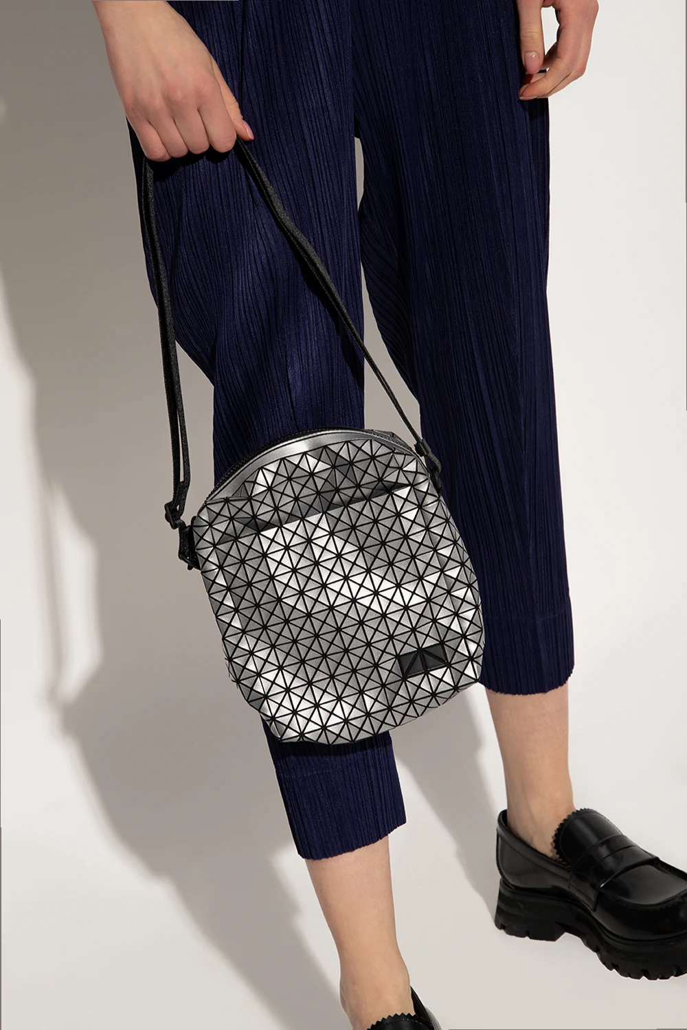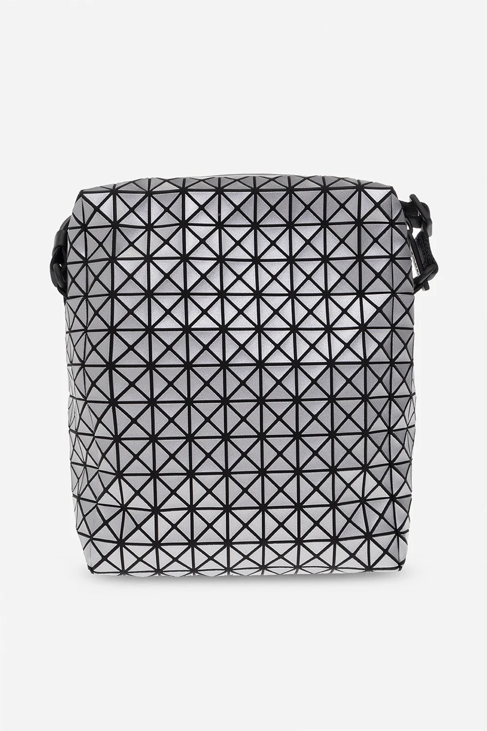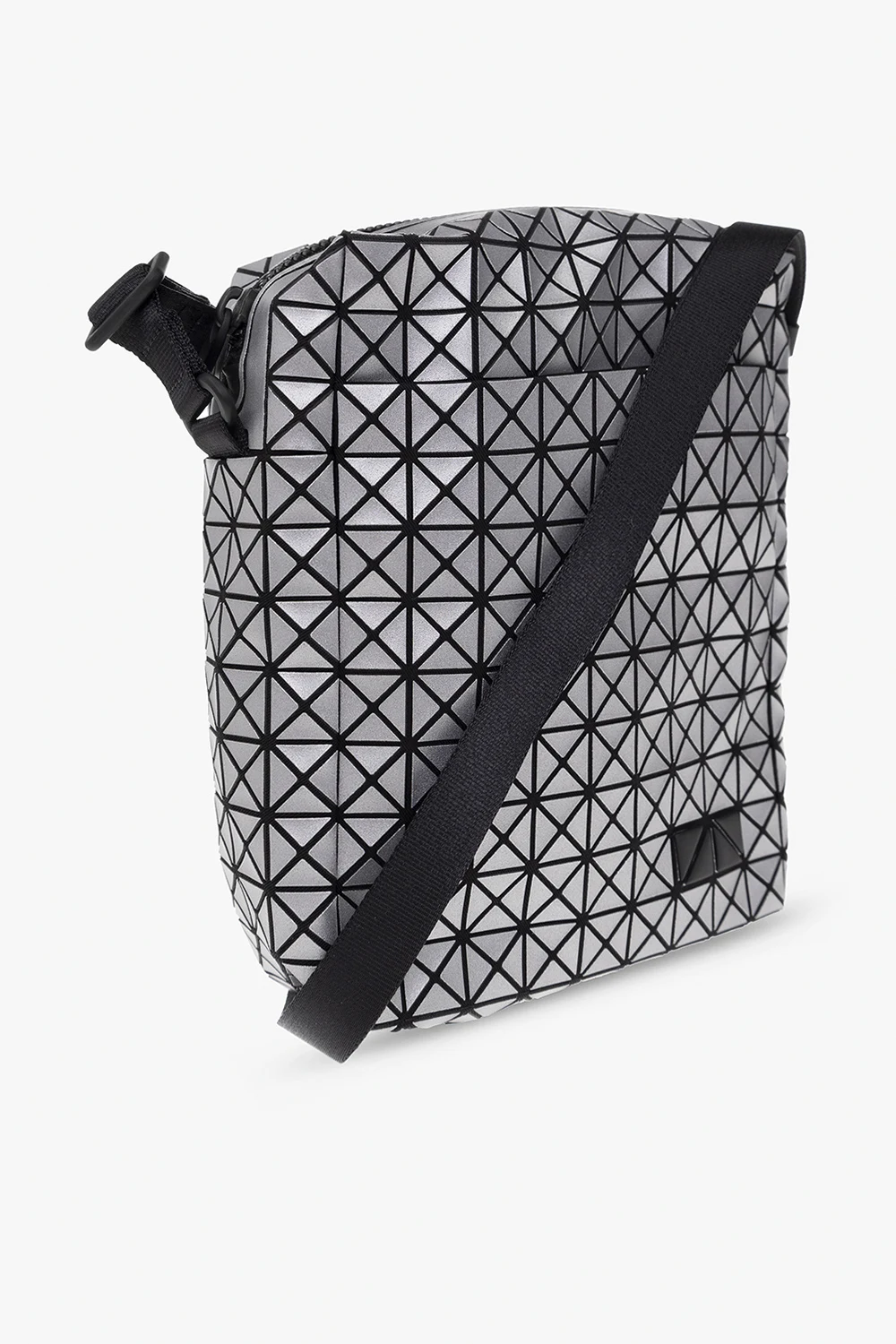 Black and silver-tone ‘Voyager’ shoulder bag from Issey Miyake Bao Bao. Crafted from cotton canvas with a series of rubber applications creating a geometrical pattern, this design fastens with a zipper and features a snap-fastened pocket on the front, an adjustable strap and one internal compartment with a slip pocket.