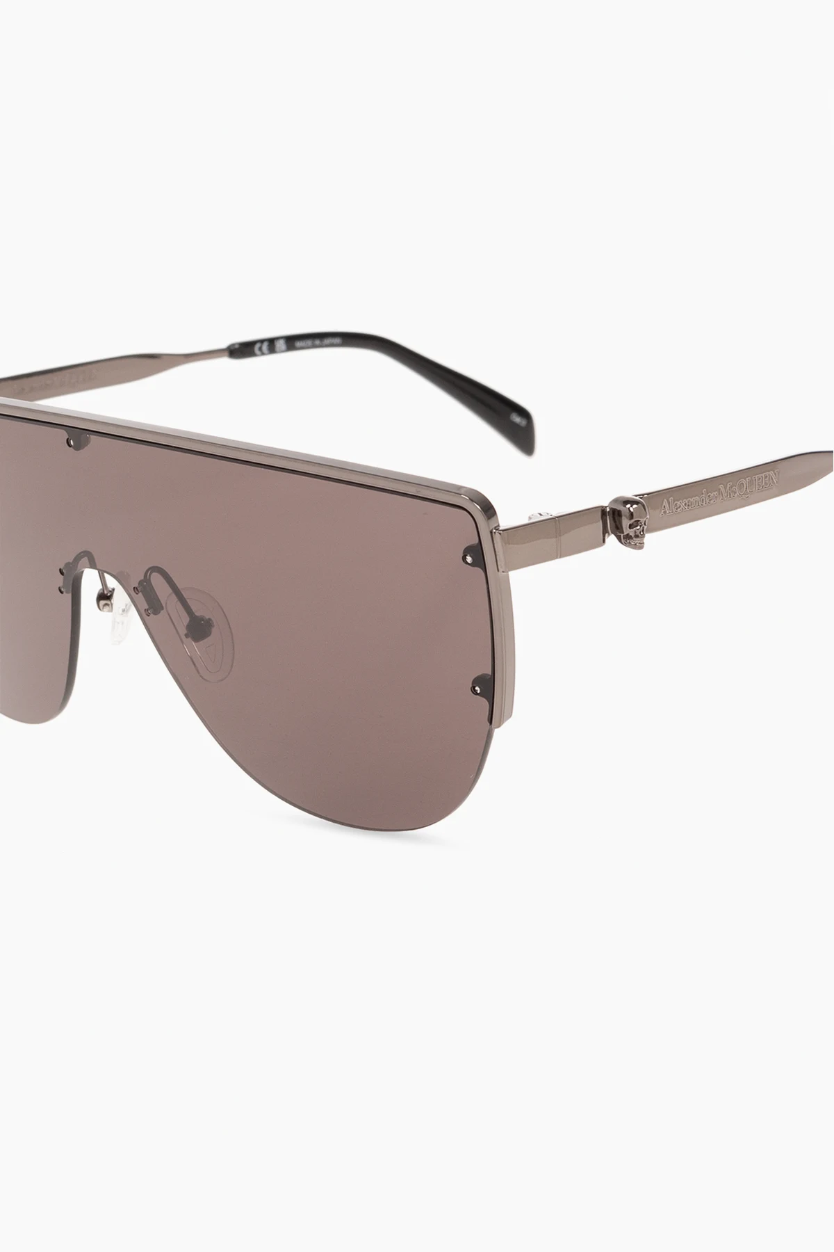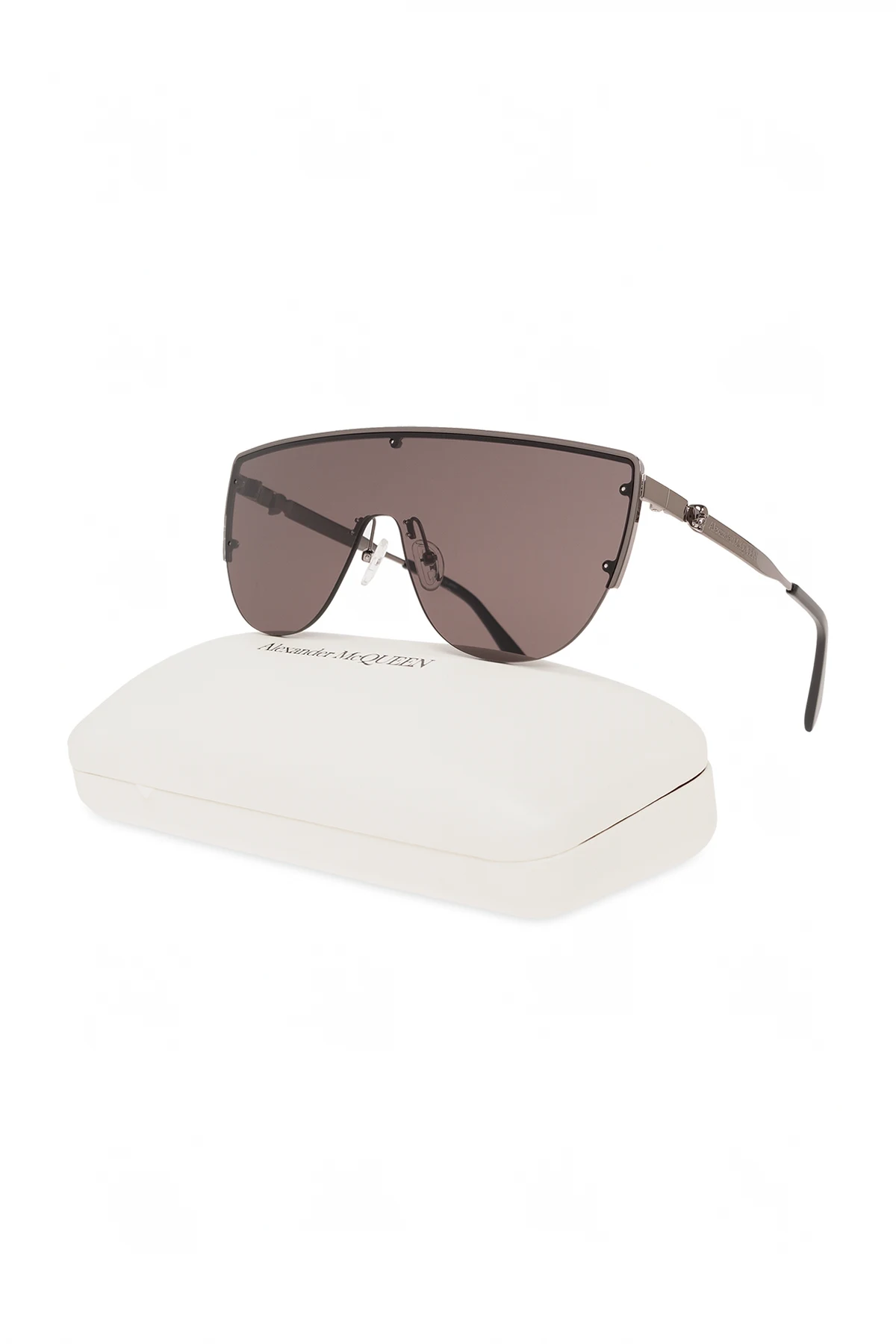 Dark silver-tone sunglasses from Alexander McQueen. This pair features the brand’s signature skull motif, engraved logo and grey lenses with a mirror effect and UV (cat. 3) protection. Case included.
