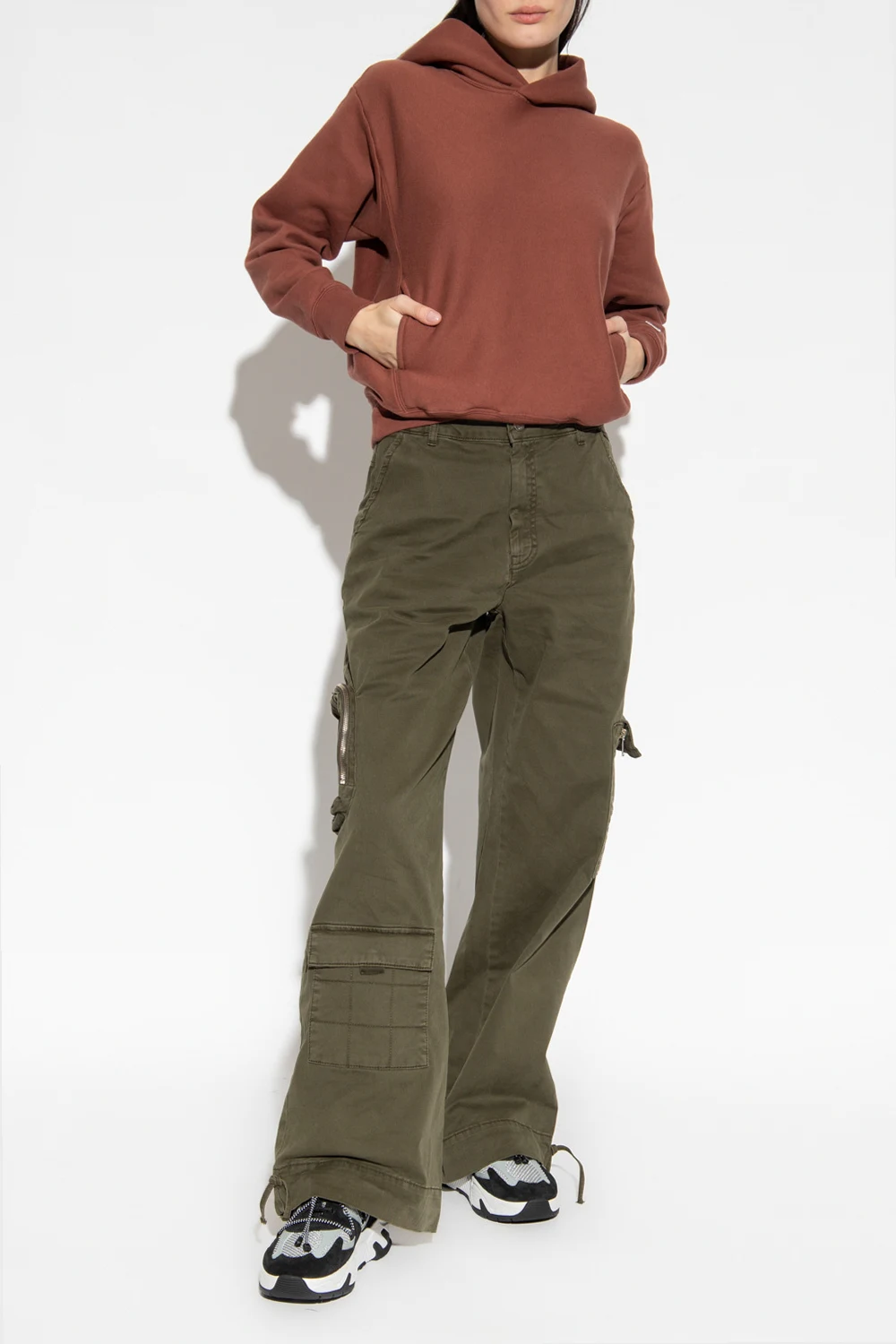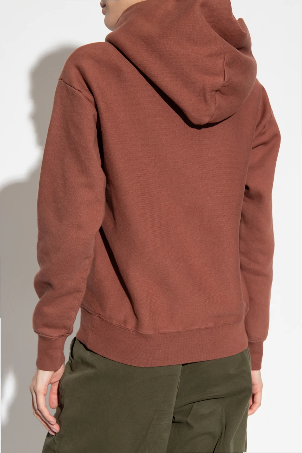 Brown hoodie from Champion. Crafted from cotton jersey with a relaxed fit, this style features two slip pockets, long sleeves, a logo patch on the cuff and ribbed trims on the edges.