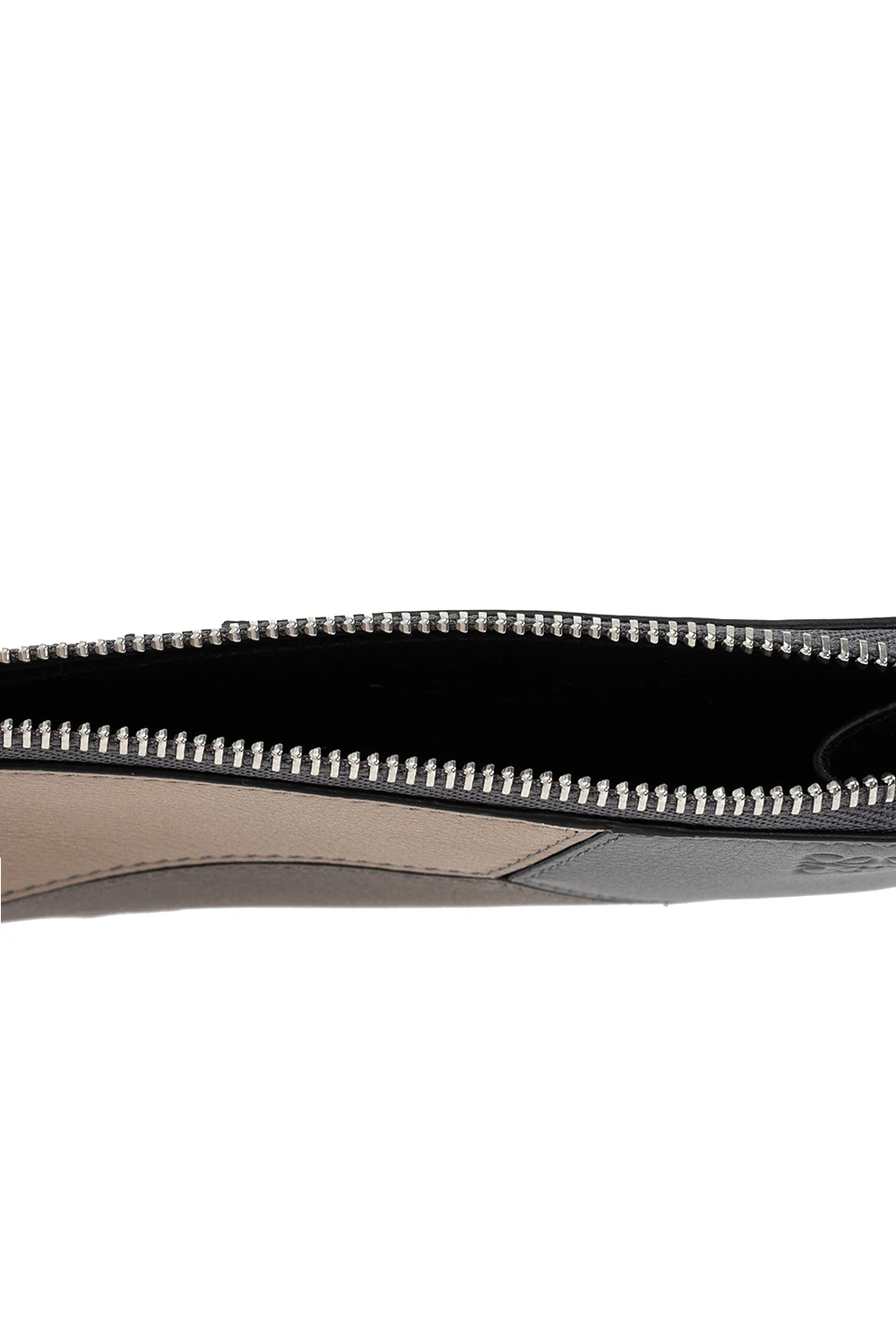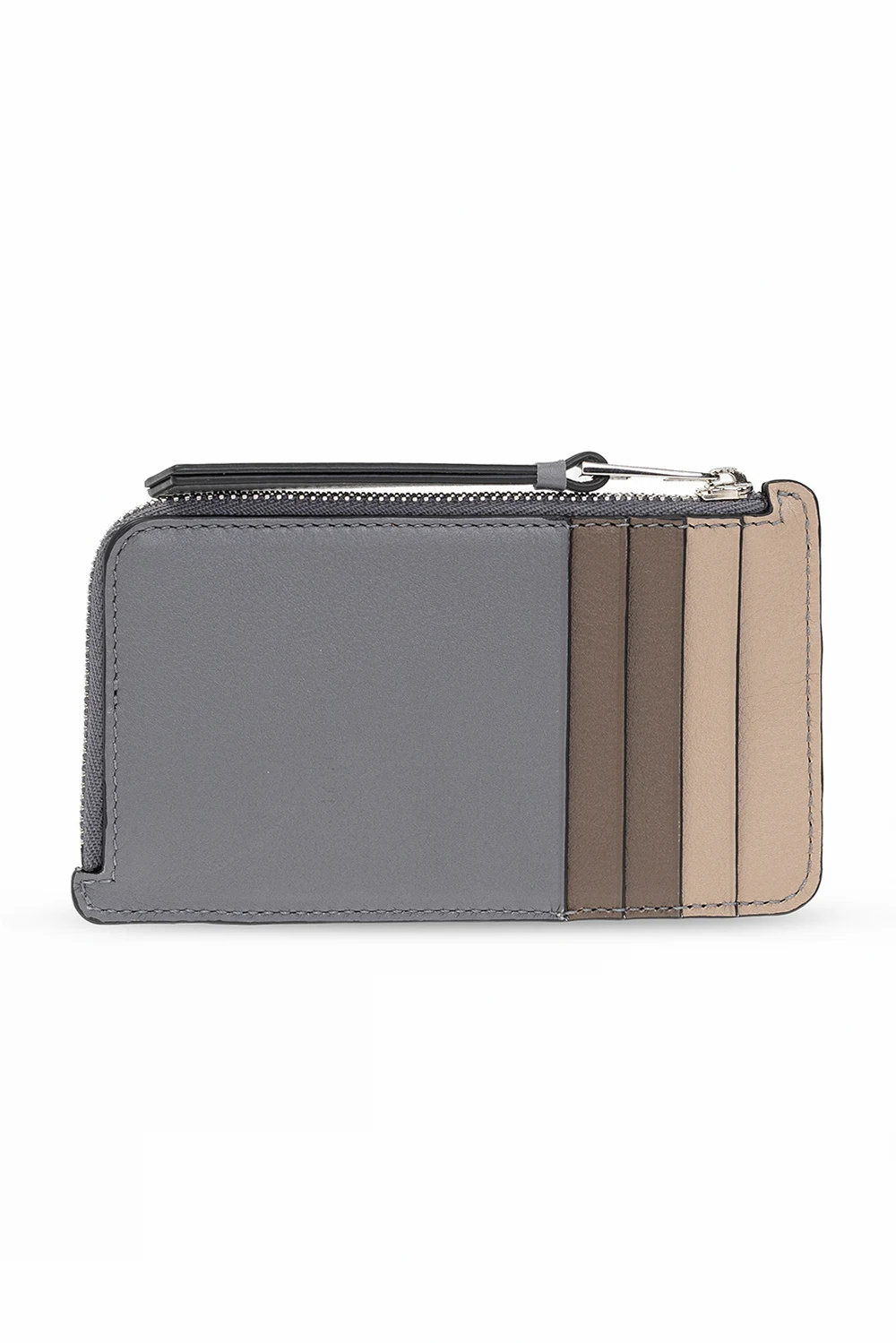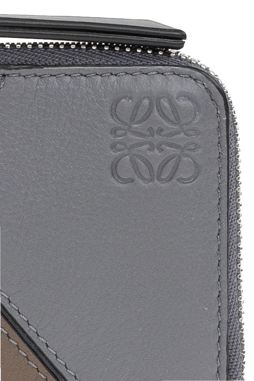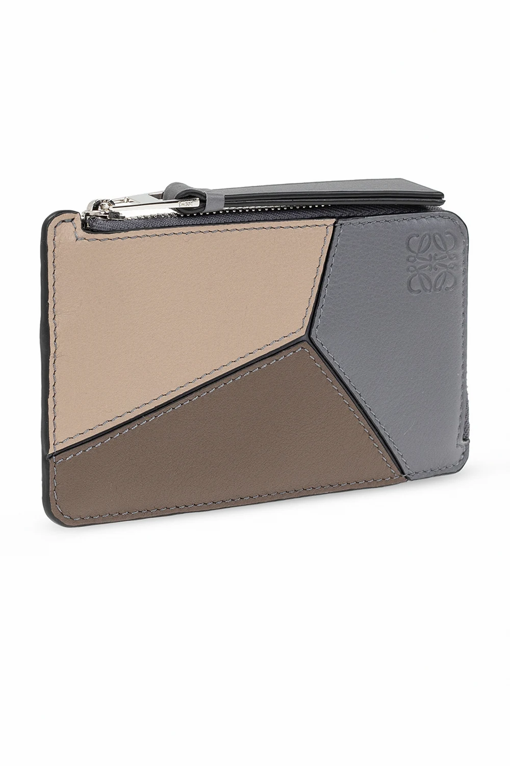 Grey, brown and beige ‘Puzzle’ card case from Loewe. Crafted from calf leather, this item fastens via a zip and showcases an embossed logo, four card slots on the back and a strapped keyring on the inside.