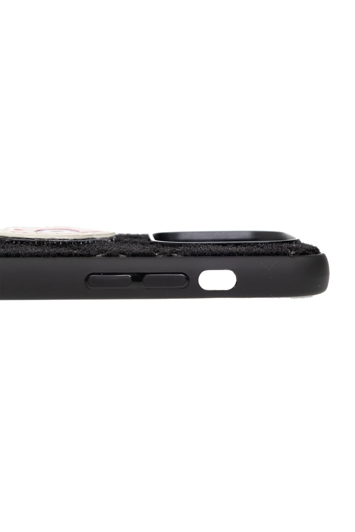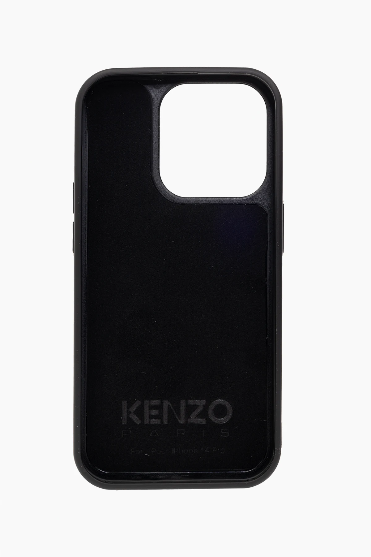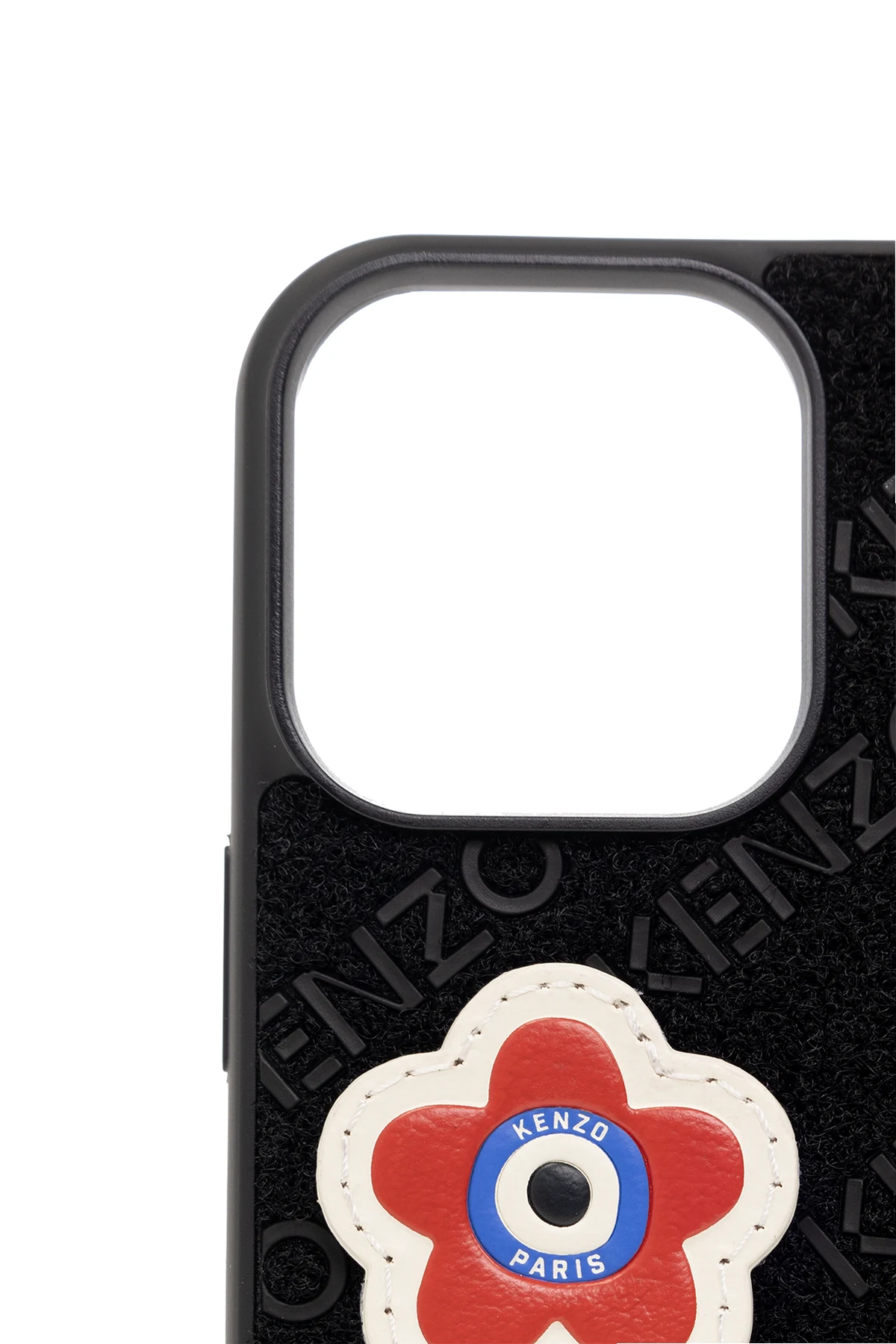 Black iPhone 14 Pro case with detachable, multicolored logo pins from Kenzo.
