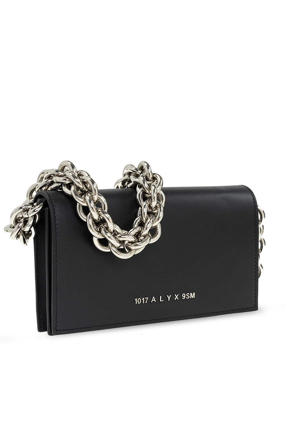 Black shoulder bag 'Giulia' from 1017 ALYX 9SM. Crafted from leather, this model fastens with a magnetic snap and is complete with a metal logo appliqué, detachable and adjustable chain, silver-tone metal hardware and one internal compartment with one card slot.