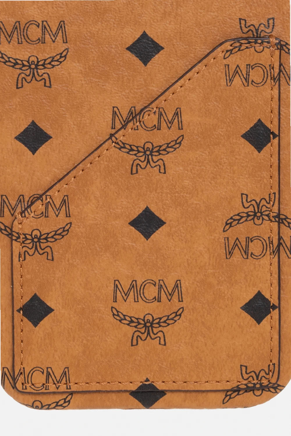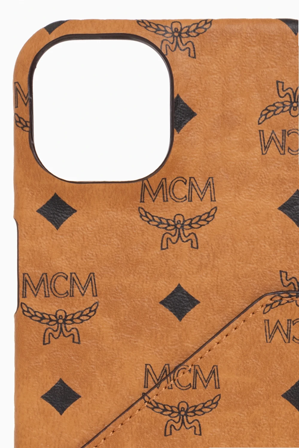 Brown iPhone 13 case from MCM. Made of faux leather, this item is decorated with the label’s signature Visetos logo pattern in black and has one card slot.