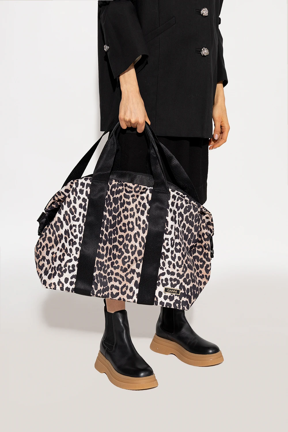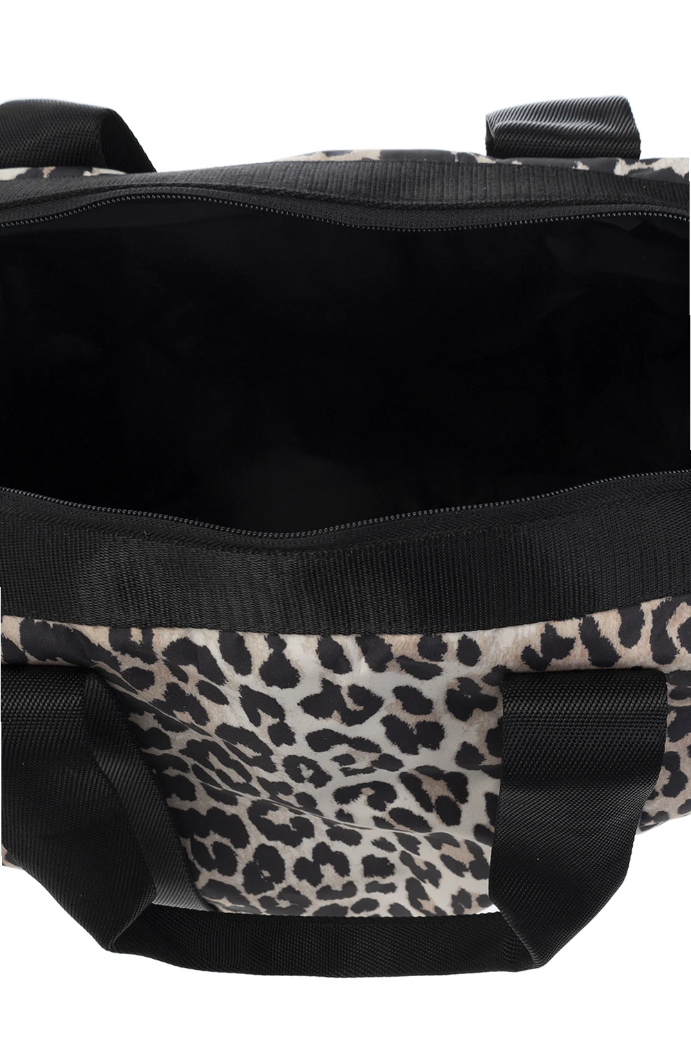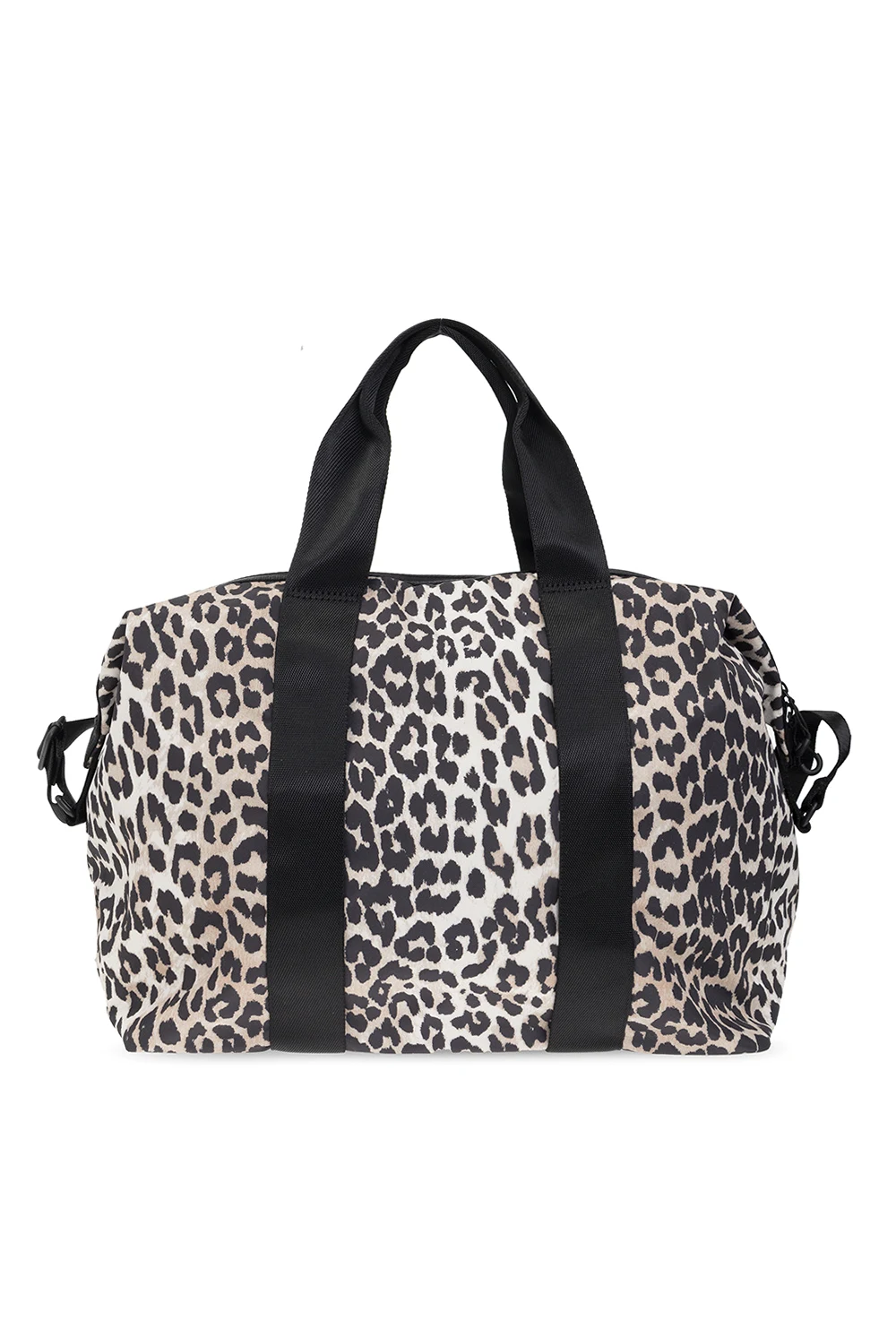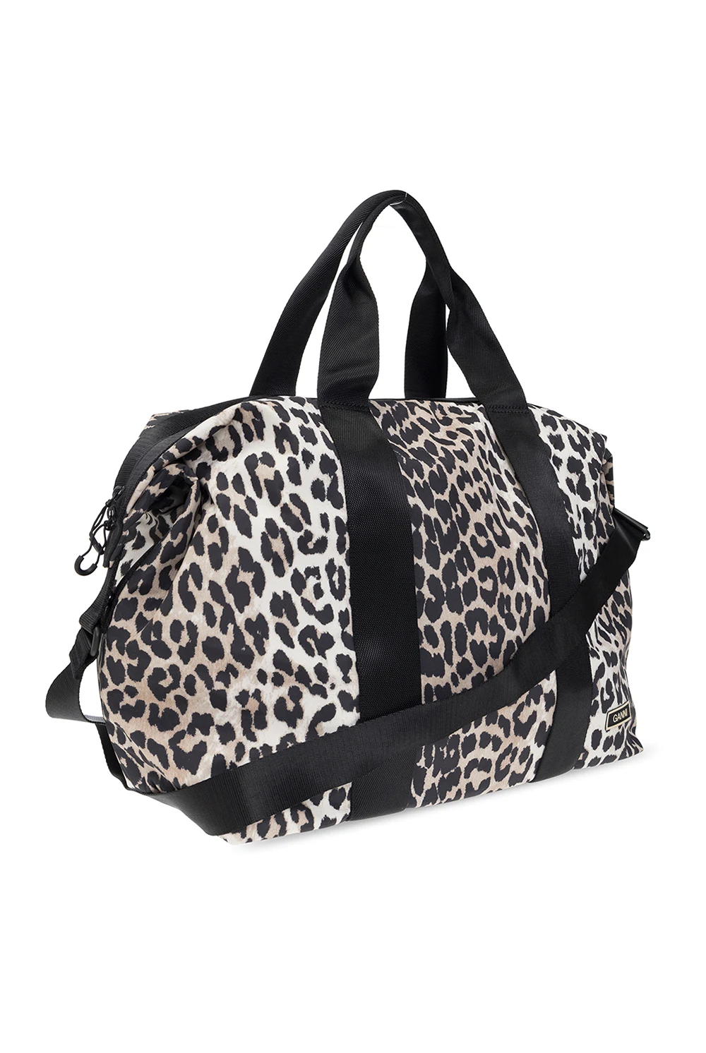 Brown, cream and black holdall bag from Ganni. Fastened with a zip, this model is decorated with an animal motif and logo detail. It is complete with a front zip pocket, two half-round handles, shoulder strap, black metal hardware and one internal compartment with one zip pocket.