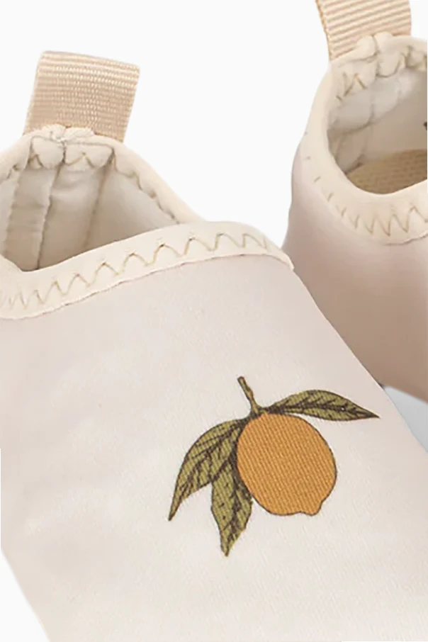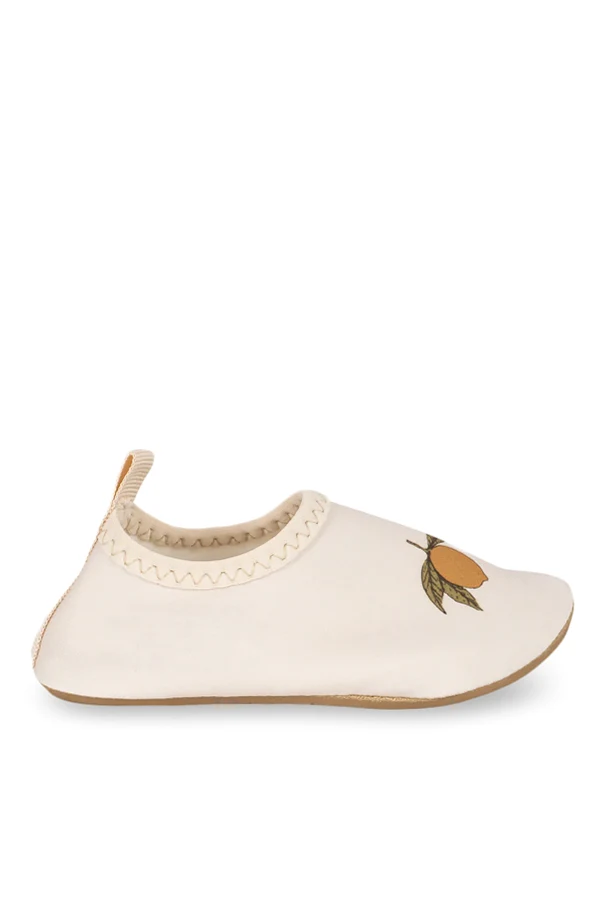 Each pair is enhanced with a delightful lemon motif and delicately scalloped stitching along the collar, infusing subtle whimsy and attentive artistry. Finished with a convenient back loop, these shoes slip on with ease—perfect for play at poolside or sandy shores.