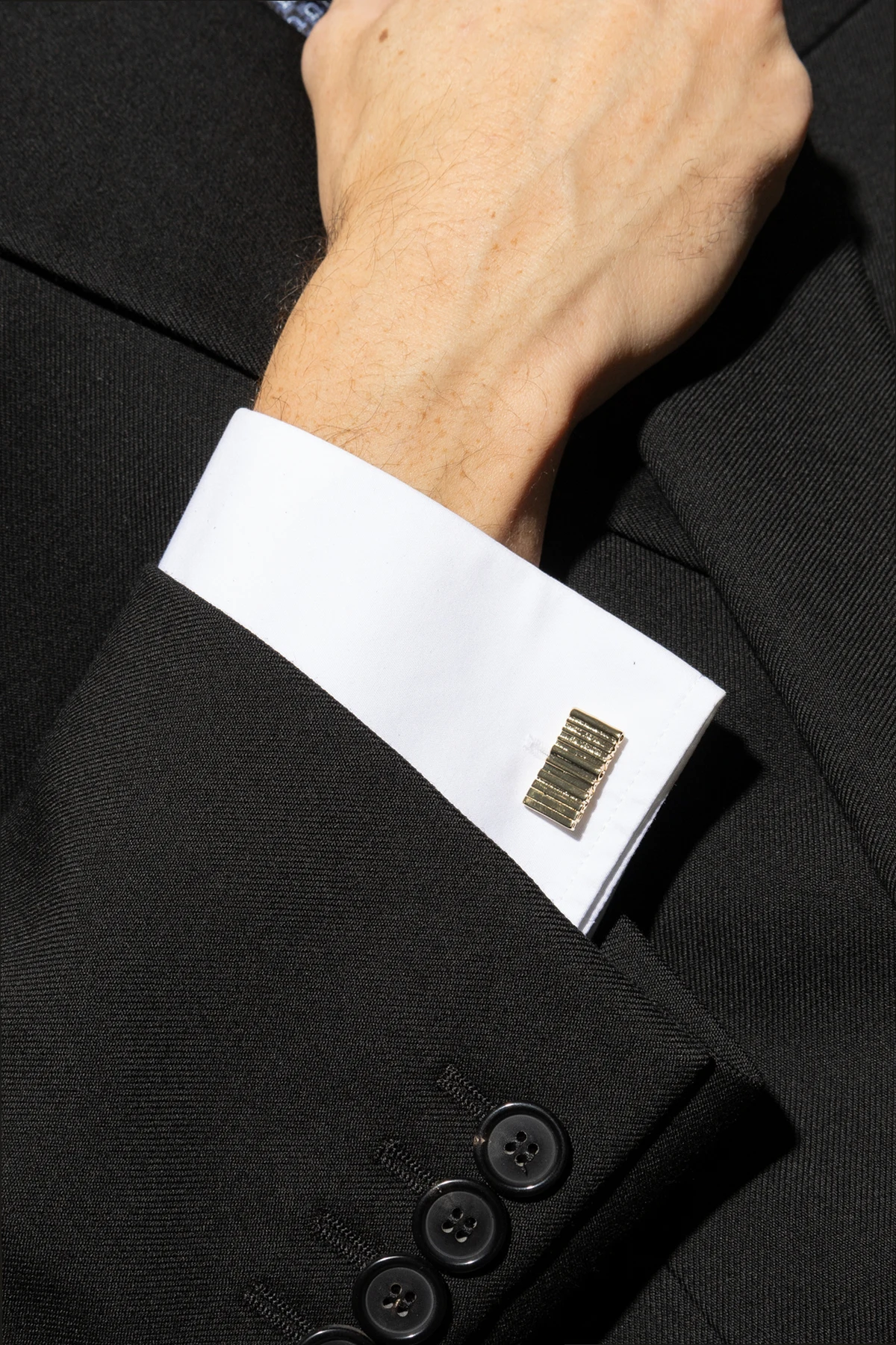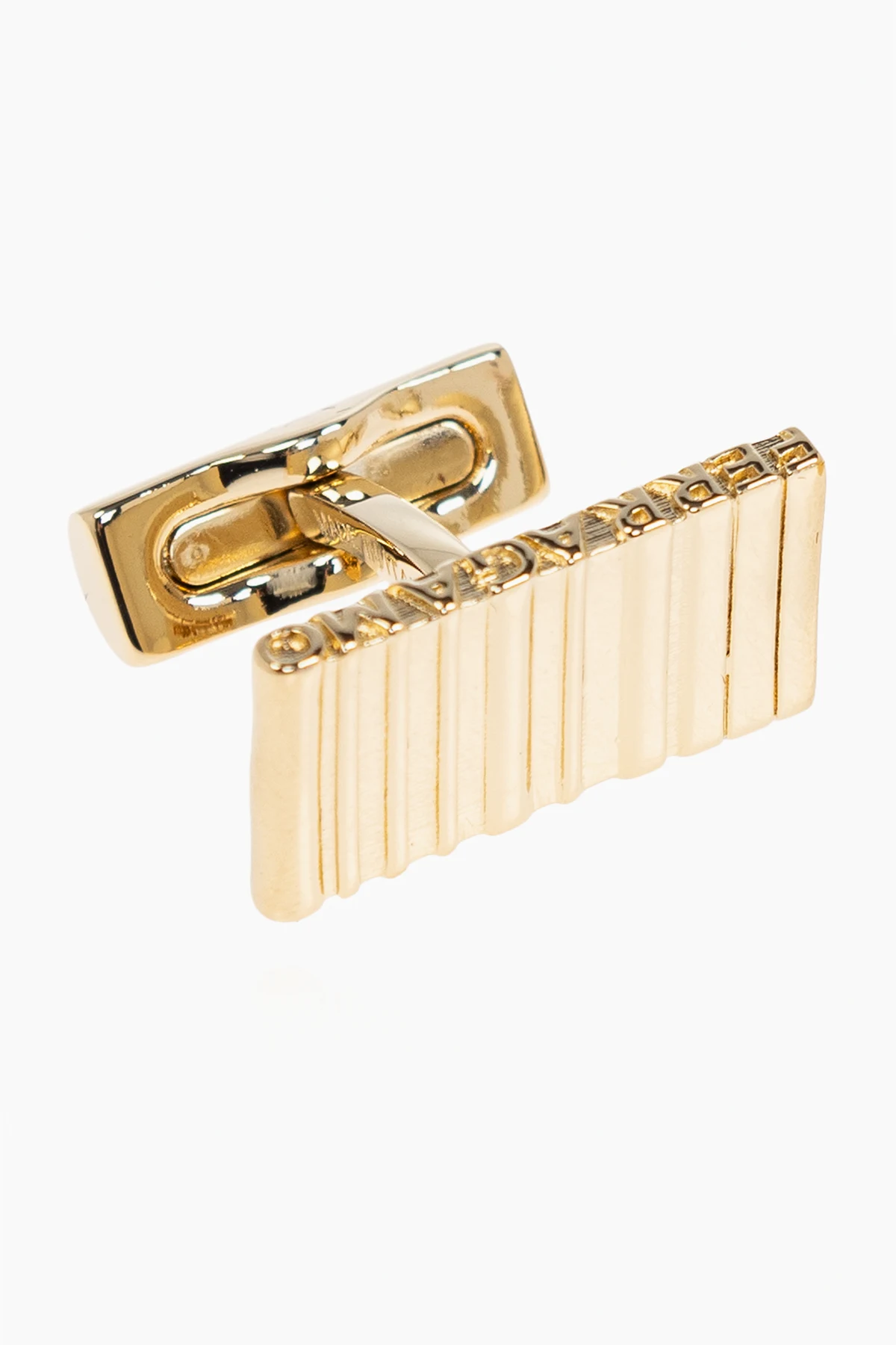 Behold the epitome of sophistication with the Gold Cufflinks with Engraved Logo by FERRAGAMO. Masterfully crafted from lustrous metal, these cufflinks exude an aura of opulence and modernity. Their rectangular silhouette is accentuated by vertical grooves, offering a distinctive and stylish aesthetic. The luxurious golden hue, coupled with a polished finish, elevates these cufflinks to an unparalleled level of elegance. A discreetly engraved designer logo on the edge further attests to their exclusivity and prestigious brand heritage. The classic closure ensures ease of use, making them a perfect complement to any elegant shirt. Why Choose This Product? Exquisite design with vertical grooves for a modern look. Crafted from high-quality brass for enduring luxury. Exclusive FERRAGAMO branding for a touch of prestige. Classic closure for effortless elegance. Perfect accessory to enhance any formal attire.
