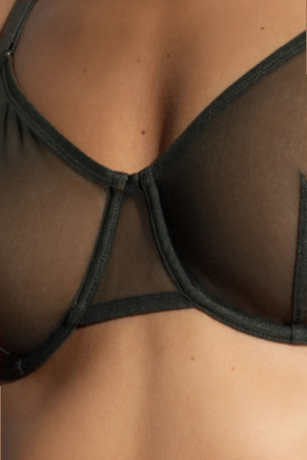 Dark green ‘Eden’ tulle bra from Eres. Fastened at the back with adjustable hooks, this design features underwires and adjustable shoulder straps.