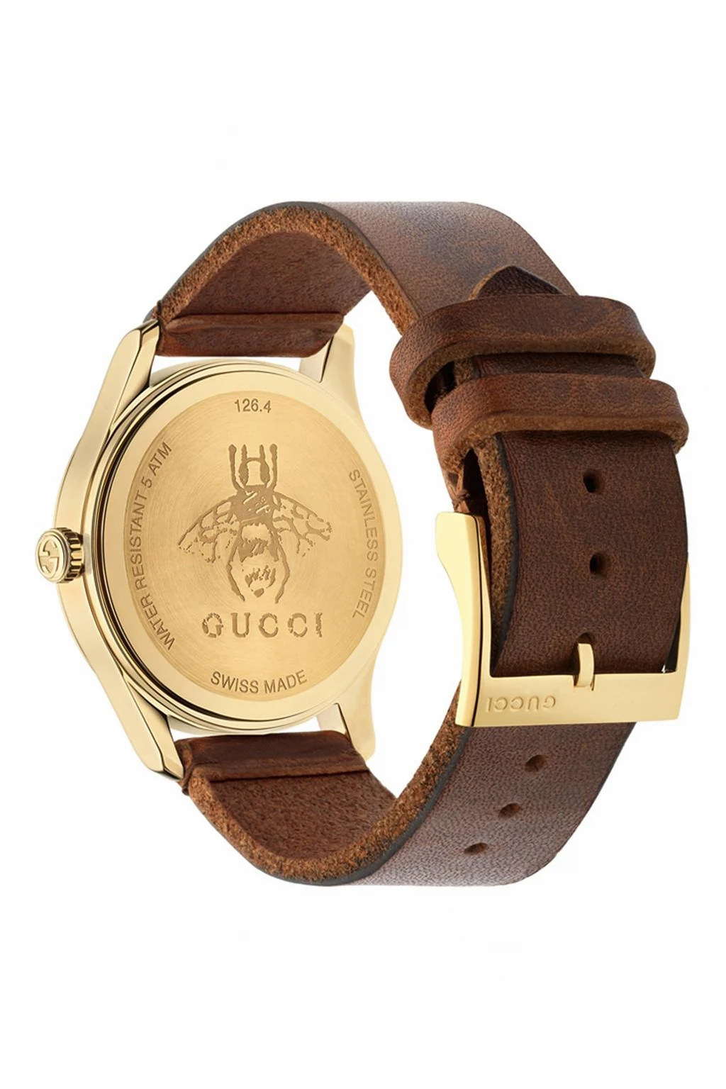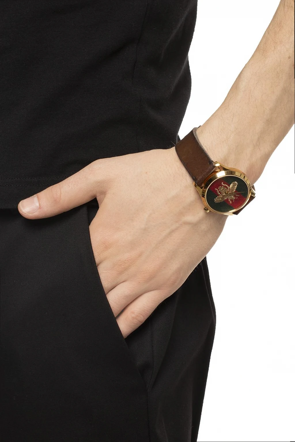 Gold-tone ‘Le Marché des Merveilles’ quartz watch from Gucci. Made of stainless steel and brown leather. Fastened with a logo-engraved buckle. Dial decorated with a gold-tone embroidered bee motif and a ‘Web’ stripe in green, red and green. Water-resistant up to 50 metres.