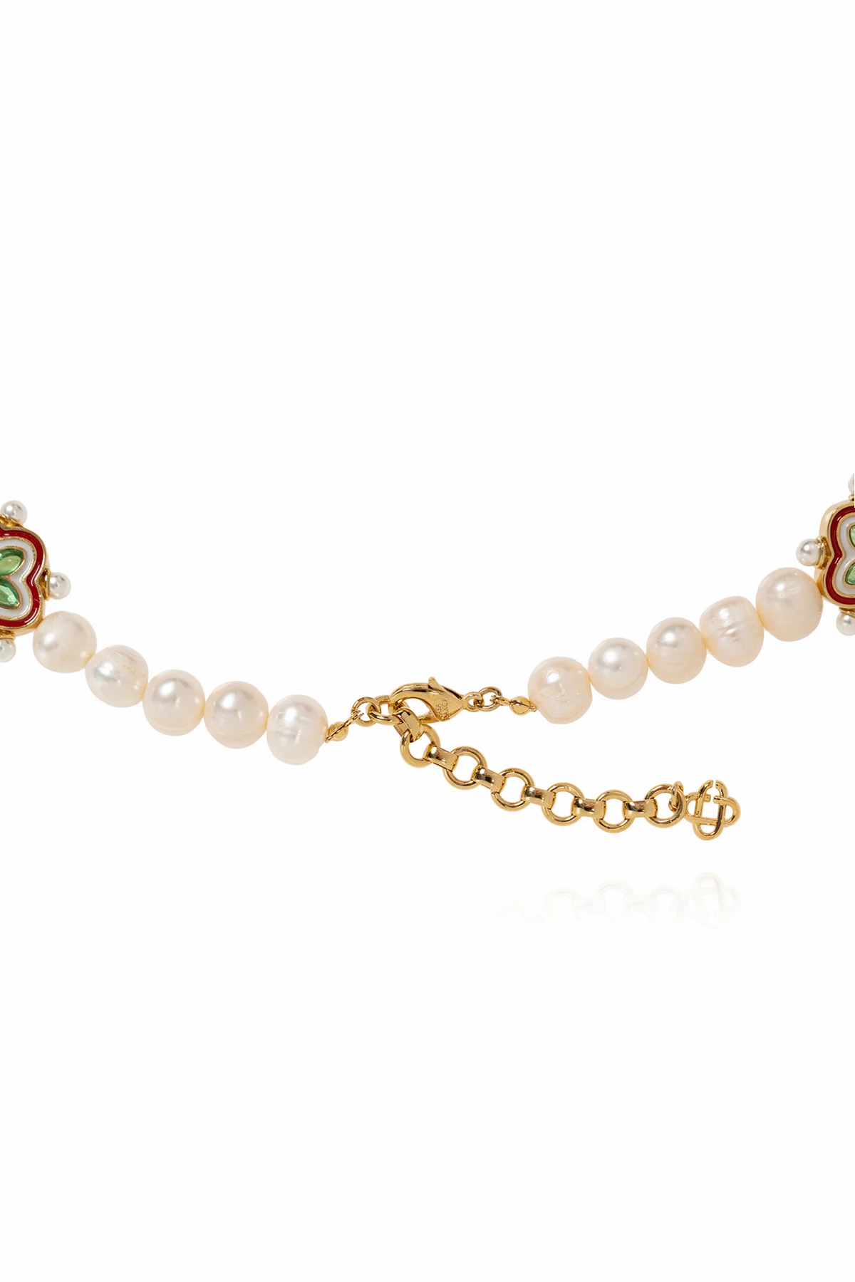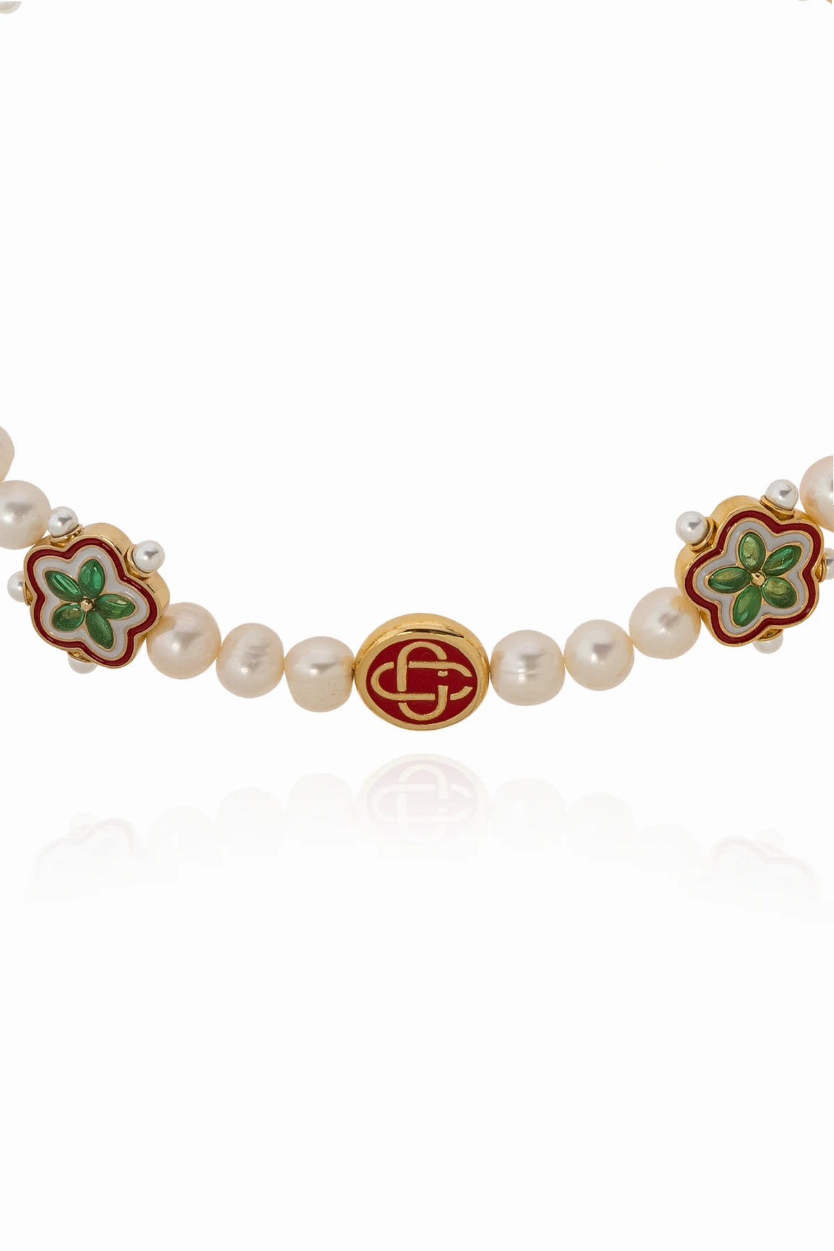 Introducing the Casablanca Pearl Necklace: a masterpiece of elegance and sophistication. This exquisite piece is composed of lustrous, white pearls, each meticulously selected for its classic, round shape and smooth, shimmering surface. The pearls are interlinked, creating a continuous, graceful strand that encapsulates the beauty of the natural world or the highest quality of imitation. Embedded within this pristine string of pearls are decorative elements shaped like flowers, adding a splash of color with green petals, red accents, and golden outlines. The necklace features a centrally located, larger element adorned with the iconic logo, round in shape, and finished in a striking red with gold details. This signature piece not only serves as a focal point but also as a testament to the distinguished brand Casablanca. The necklace is complemented by a golden chain near the clasp, indicating an adjustable design to ensure a perfect fit for any wearer. The traditional lobster claw clasp adds a touch of classic practicality, making it both a versatile and stylish choice. Crafted from glass, enamel, and gold-plated brass, this necklace is a symphony of white and gold, blending classic pearl elegance with bold, modern accents. It stands as a unique accessory that can elevate any attire, embodying the blend of traditional charm and contemporary boldness. Why Purchase This Product? Signature Design: Uniquely incorporates Casablanca\'s elegant aesthetic with modern flair. Adjustable Comfort: Features an adjustable gold chain and a lobster claw clasp for a customizable fit. Exquisite Craftsmanship: Made from high-quality materials such as glass, enamel, and gold-plated brass, ensuring durability and lasting beauty. Versatile Elegance: Perfect for both formal and casual occasions, adding a touch of sophistication to any outfit.