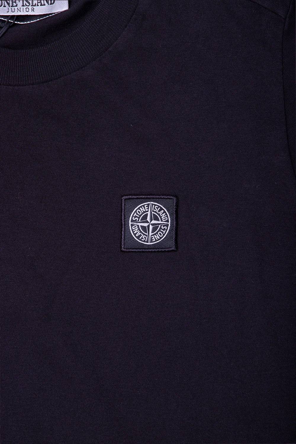 Black crewneck T-shirt from Stone Island Kids. Made from cotton, this style features short sleeves, an elasticated collar and a black and cream logo patch on the front.