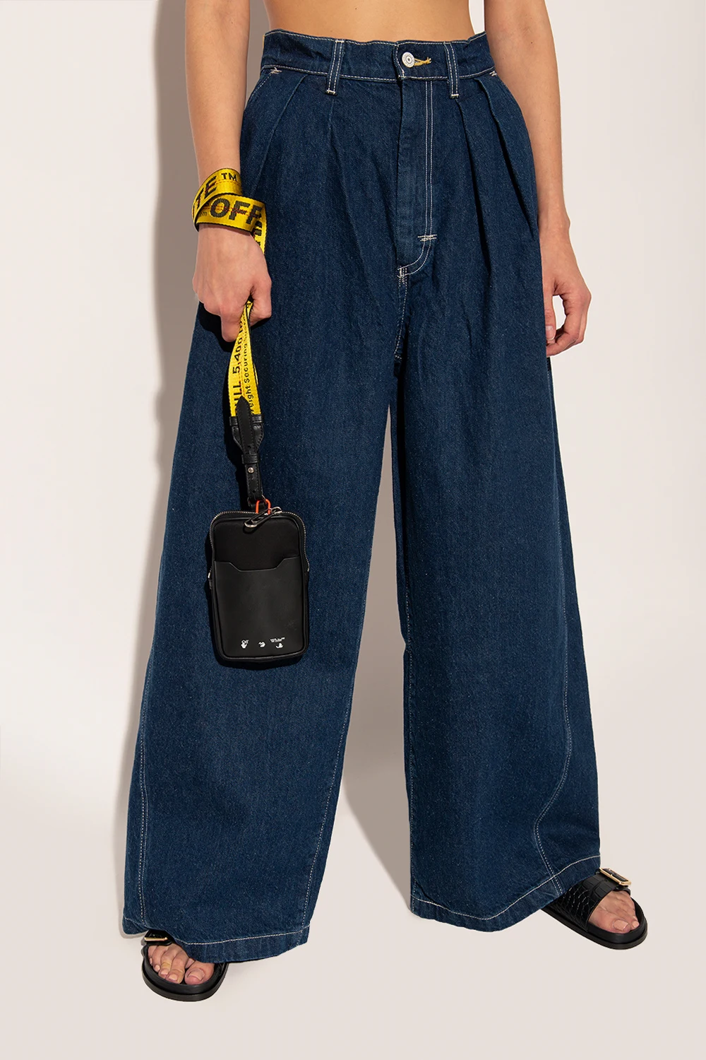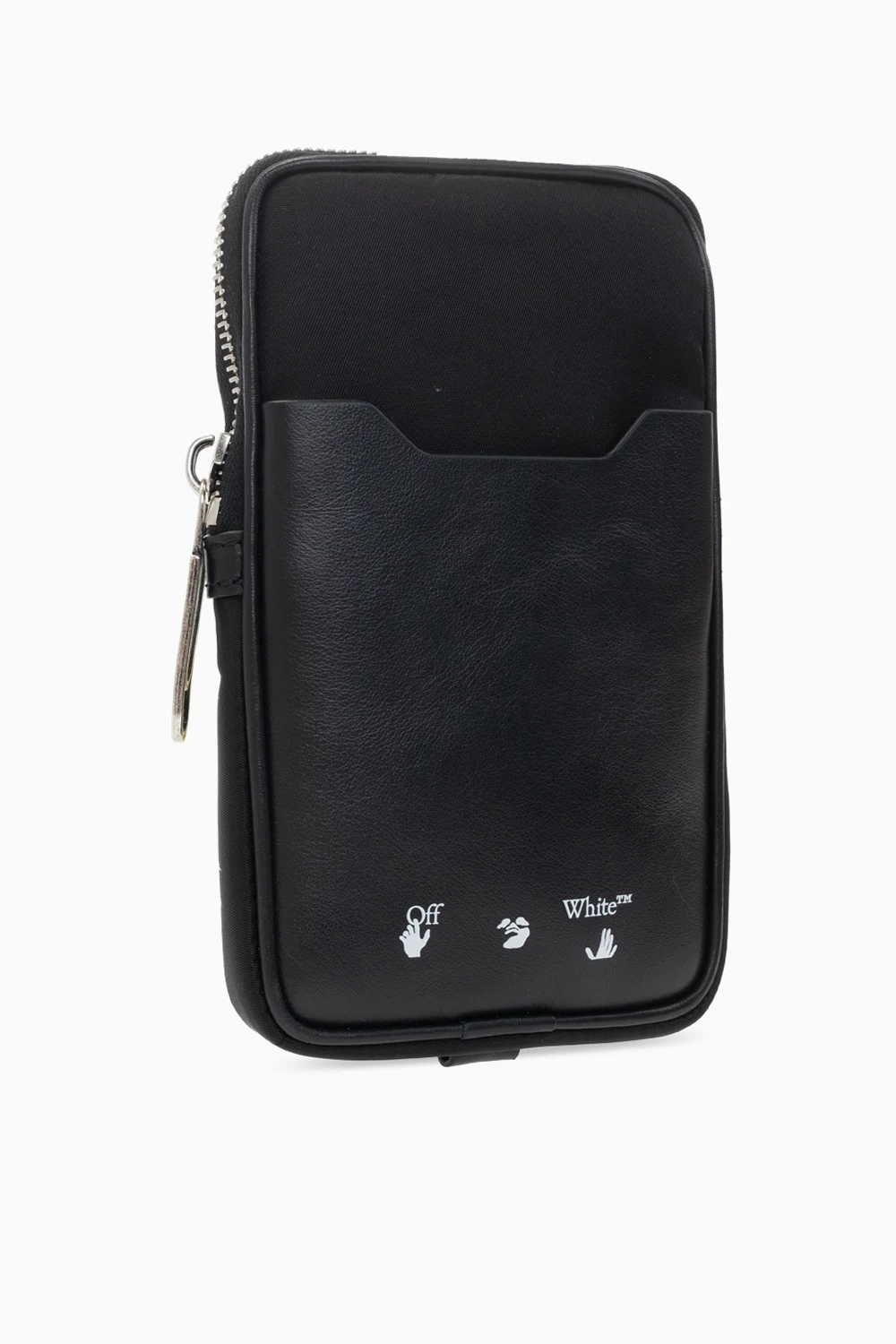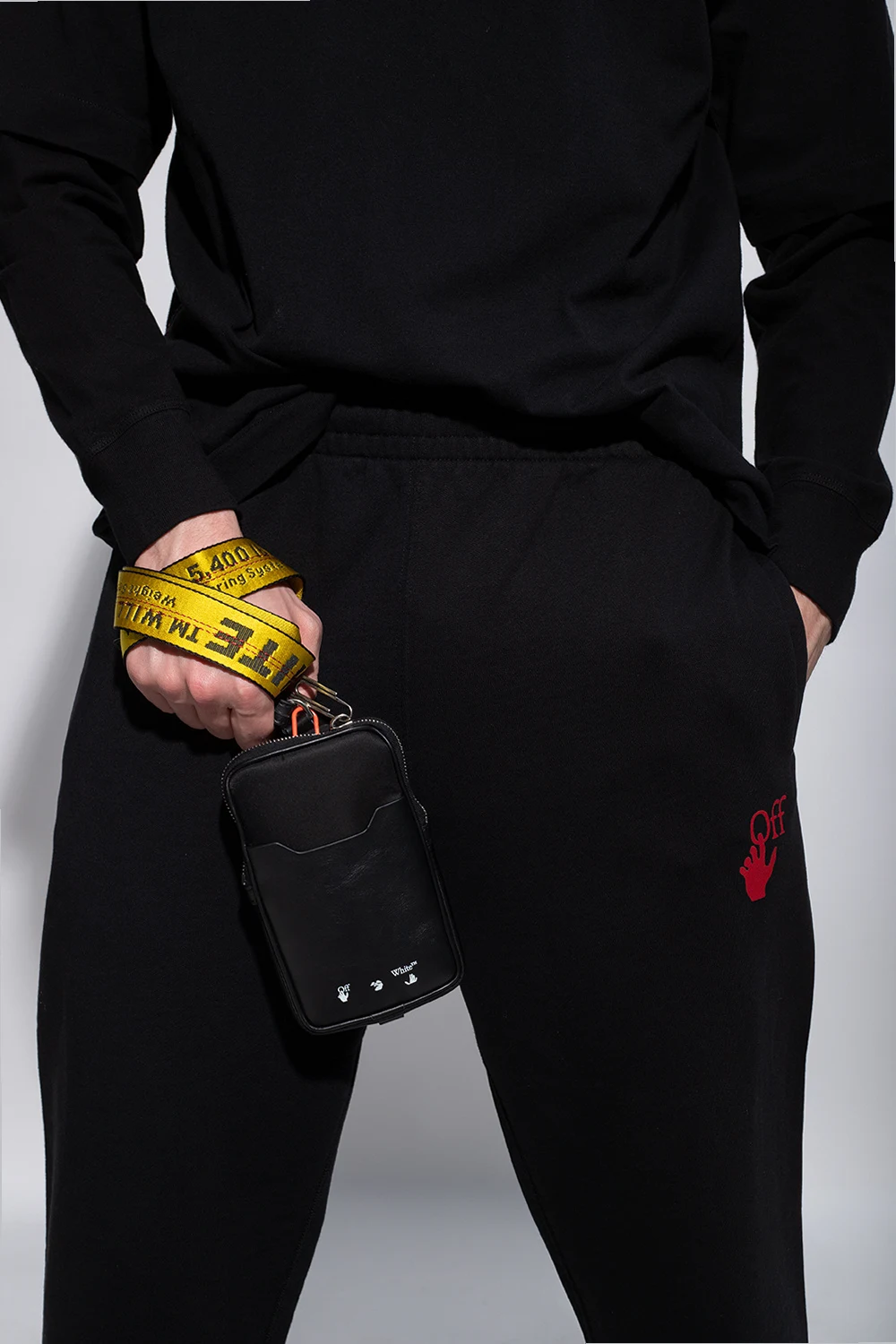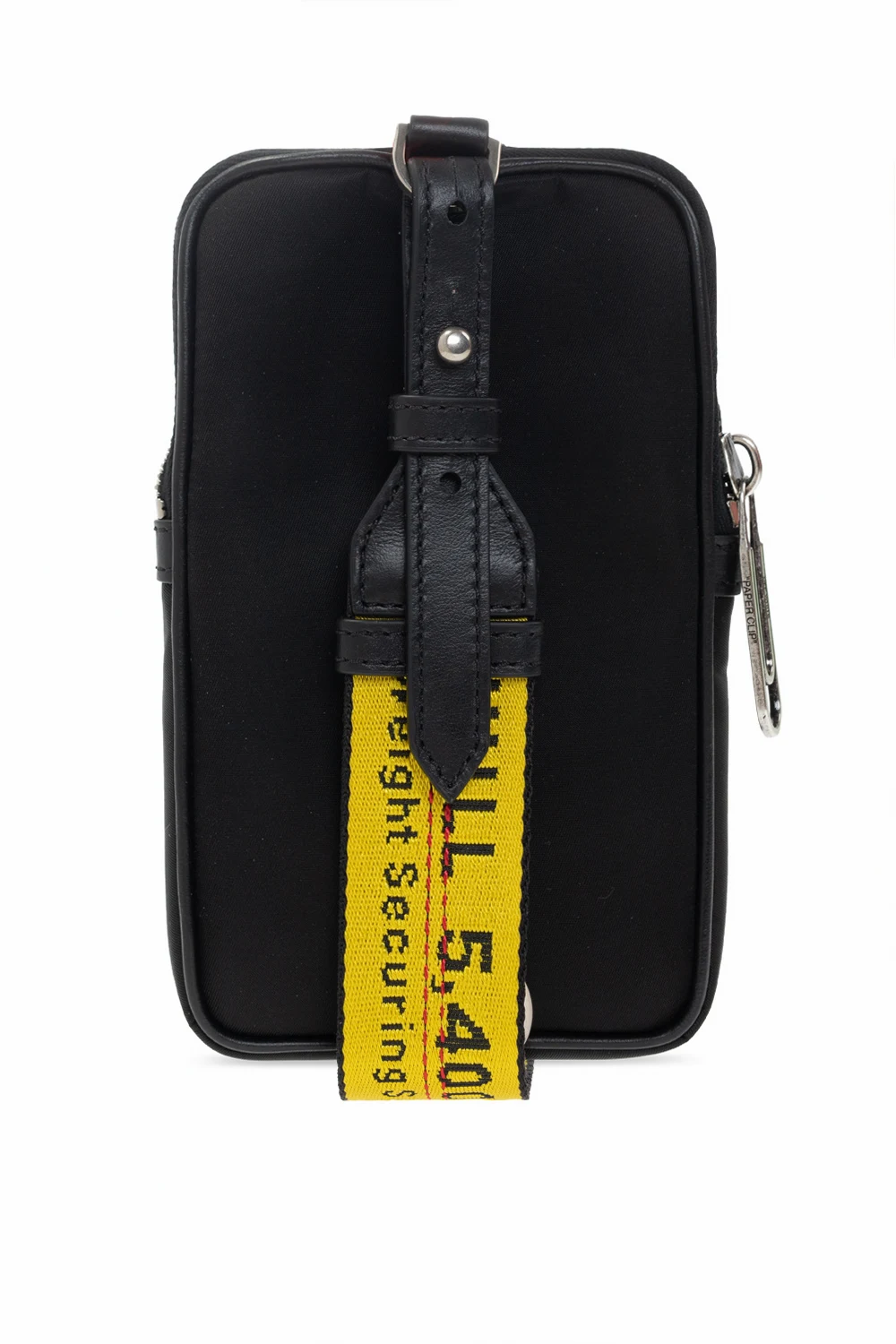 Black pouch from Off-White. Fastened with a zip, this garment features a front pocket, white logo print, keyring at the bottom, detachable yellow strap with a logo in black, red stitching details, silver-tone metal hardware and one internal compartment with one slip pocket.
