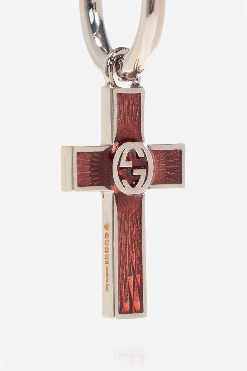 Silver-tone clip-on earring from Gucci. This item showcases a cross-shaped pendant with a red enamel finish and logo plaque.