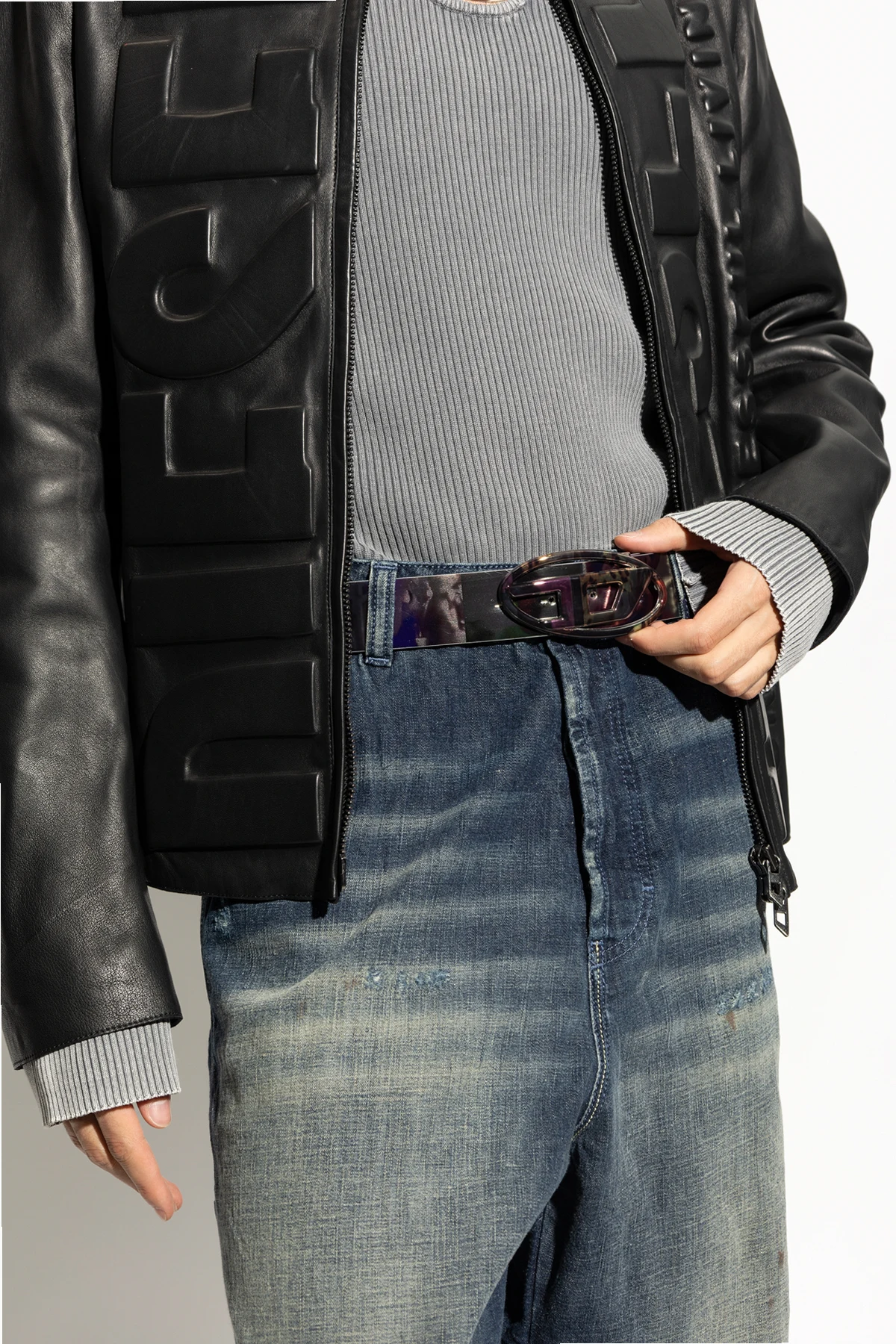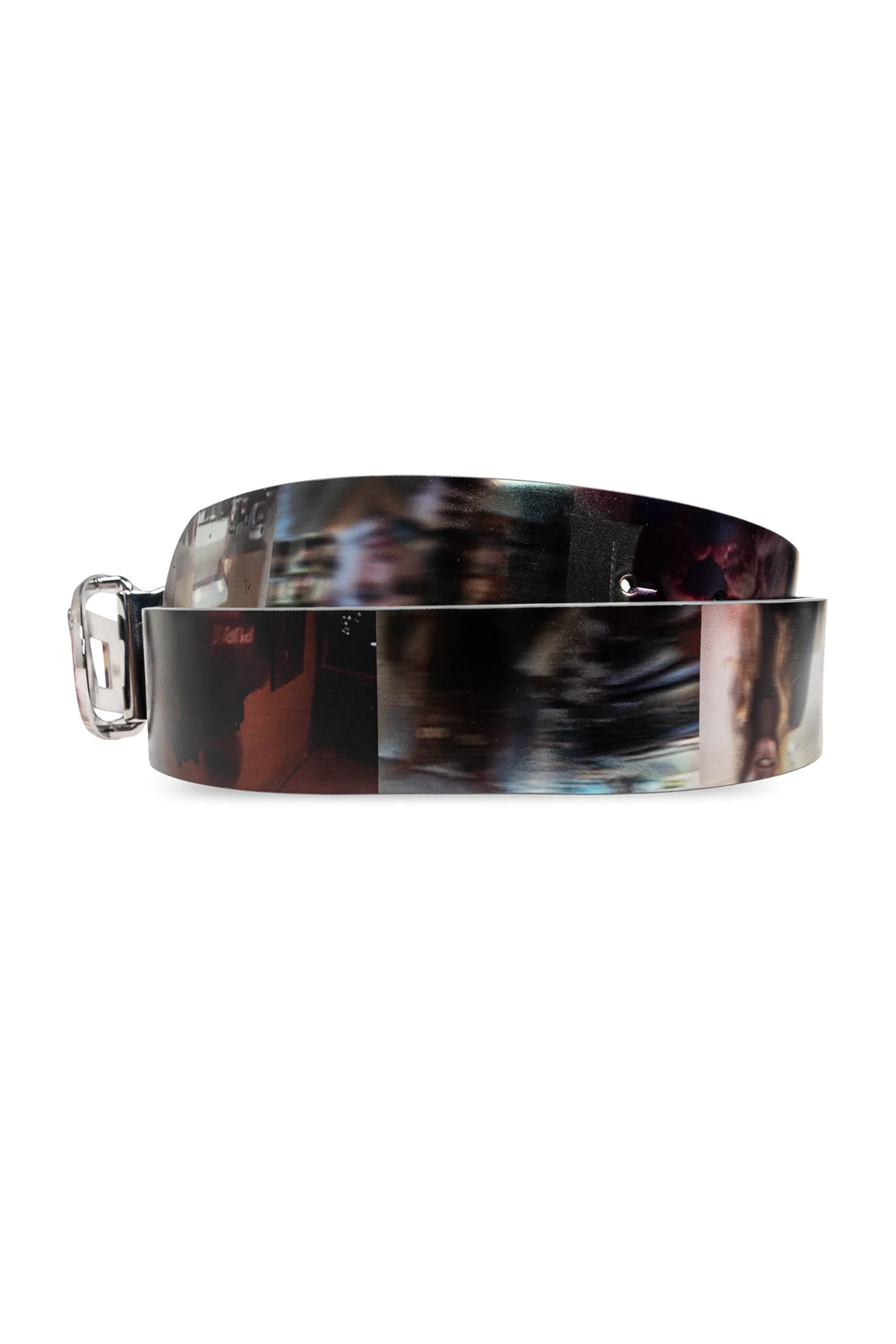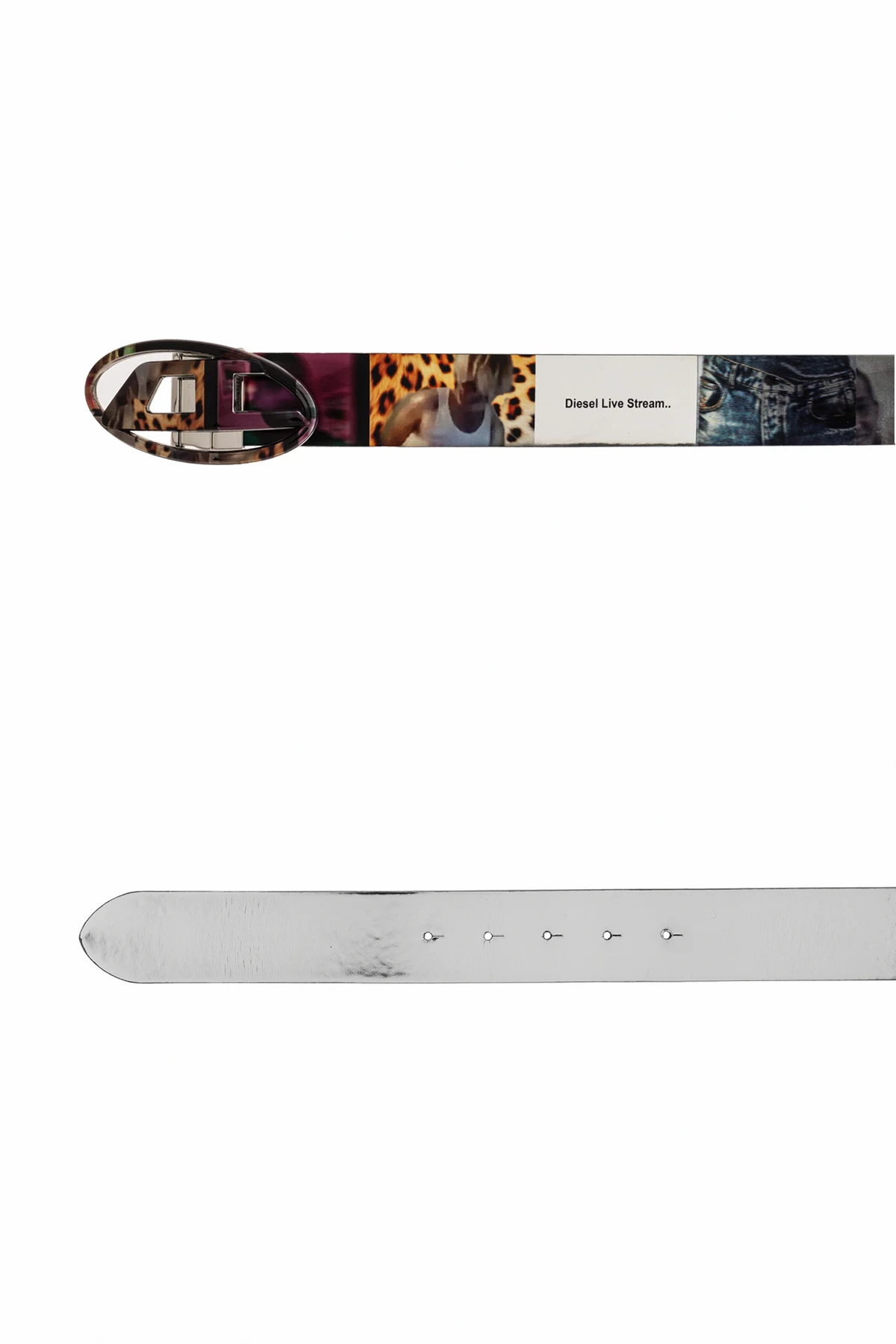Introducing the Reversible Belt \'OVAL\' from Diesel\'s exclusive collection. This unisex accessory epitomizes the perfect blend of artistry and elegance, designed to complement a variety of styles with its versatile nature. The belt features a classic wide shape, with one side showcasing a vibrant, multicolored collage of images and graphics, including dynamic animal prints such as leopards. The reverse side, in stark contrast, boasts a pristine white hue, offering duality in wearability. Crafted from premium leather or high-quality leather-like material, this belt promises both durability and a luxurious feel. The distinctive oval buckle, adorned with a prominent metallic centerpiece and designer initials or logo, adds a touch of prestige and serves as a signature element of the brand. Why Choose This Product? Versatile Design: Reversible with a multicolored graphic side and a plain white side. High-Quality Material: Made from premium leather or a leather-like material for durability and luxury. Distinctive Buckle: Features an elegant oval buckle with a metallic centerpiece and designer initials. Stylish and Universal: Suitable for both casual and elegant outfits. Unisex Appeal: Perfect for anyone looking to enhance their wardrobe with a sophisticated accessory.