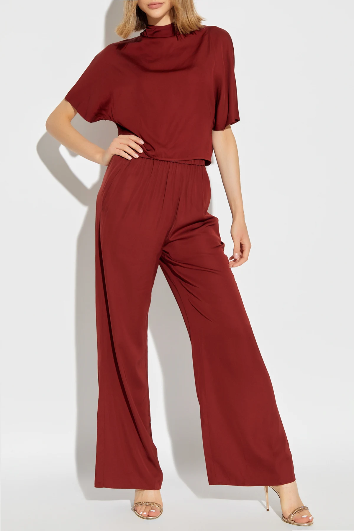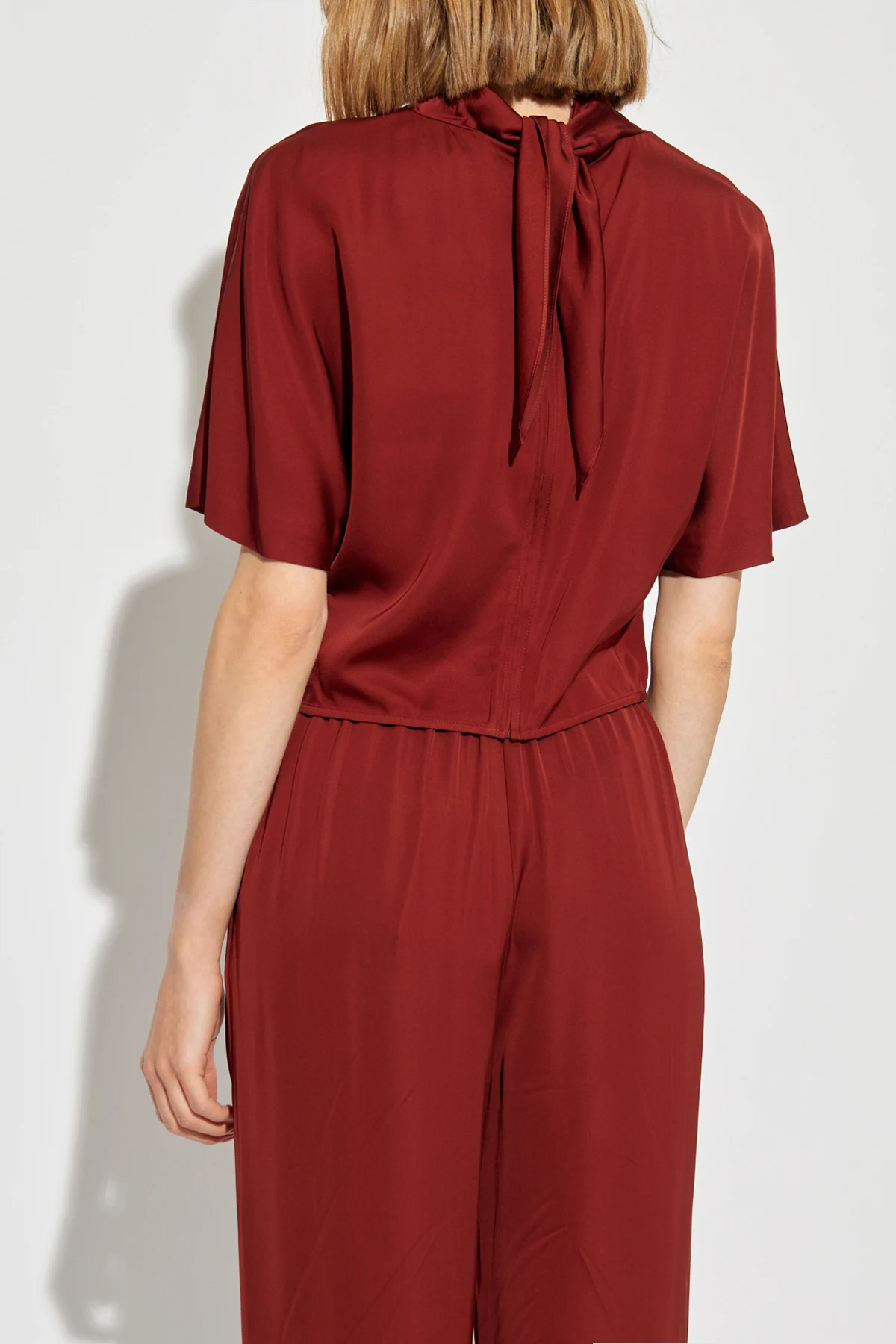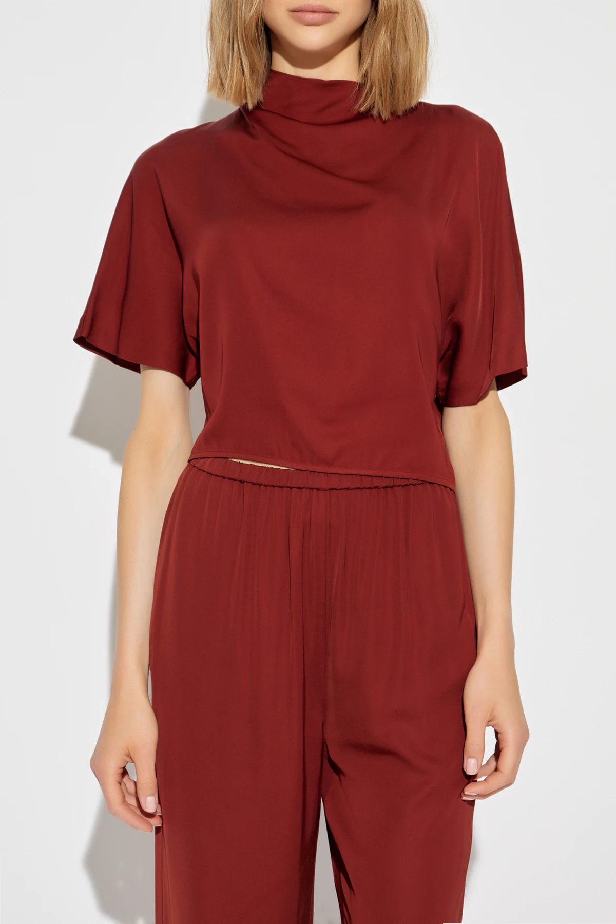 Introducing the Top \"Olympia\" by the renowned designer Diane Von Furstenberg, a piece that exudes elegance and comfort in equal measure. Crafted from the finest 100% Viscose, this top presents a sumptuous deep burgundy hue that captivates at first glance. The material\'s smooth texture not only assures a luxurious feel against the skin but also lends the garment a refined appearance. The silhouette of the Top \"Olympia\" is thoughtfully designed with a relaxed fit, ensuring utmost comfort without compromising on style. Its long sleeves gracefully end at the elbow, offering a relaxed form, while the high, draped collar adds a touch of sophistication, making this top a versatile addition to any wardrobe. Moreover, the subtle closure at the back of the collar, creatable into a delicate bow, enhances its elegance and provides an adjustable fit. With no visible logos or branding, the design focuses on a minimalist aesthetic, highlighting the garment\'s exquisite construction details such as its draping and unique back closure. This top is not only a testament to Diane Von Furstenberg\'s dedication to crafting wearable art but also an embodiment of discreet luxury. Why Purchase the Top \"Olympia\"? Exclusively designed by Diane Von Furstenberg, a name synonymous with high-quality and elegance. Made from 100% Viscose, offering a smooth, comfortable fit. Features a unique, adjustable closure at the back for a personalized and refined look. The relaxed fit and elegant draping ensure it is as comfortable as it is stylish. Its deep burgundy color and minimalist design make it a versatile piece suited for various occasions.