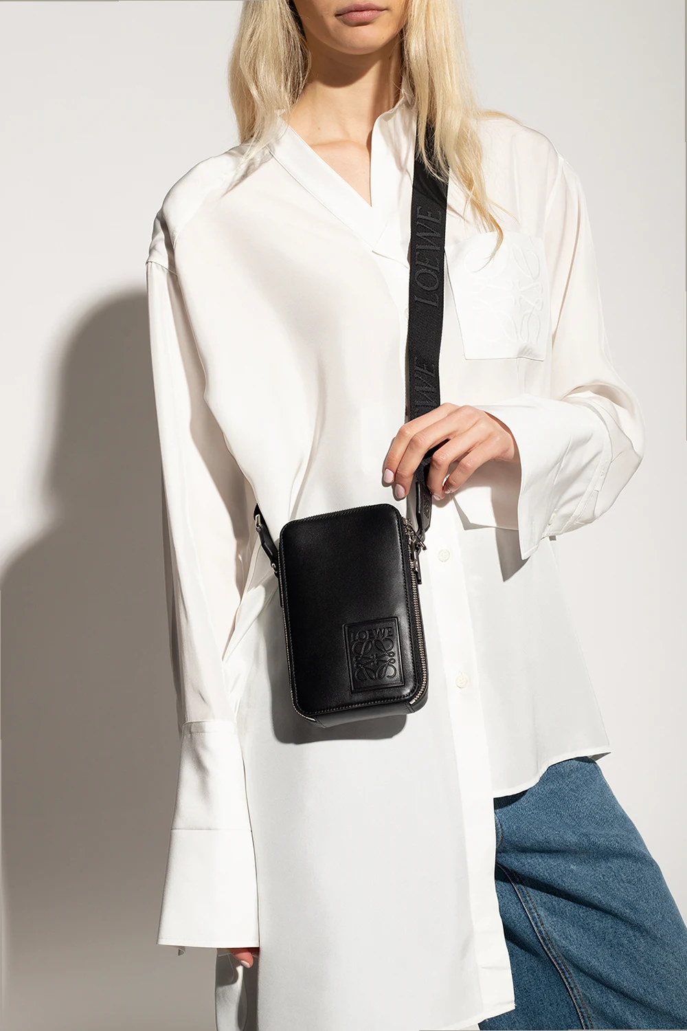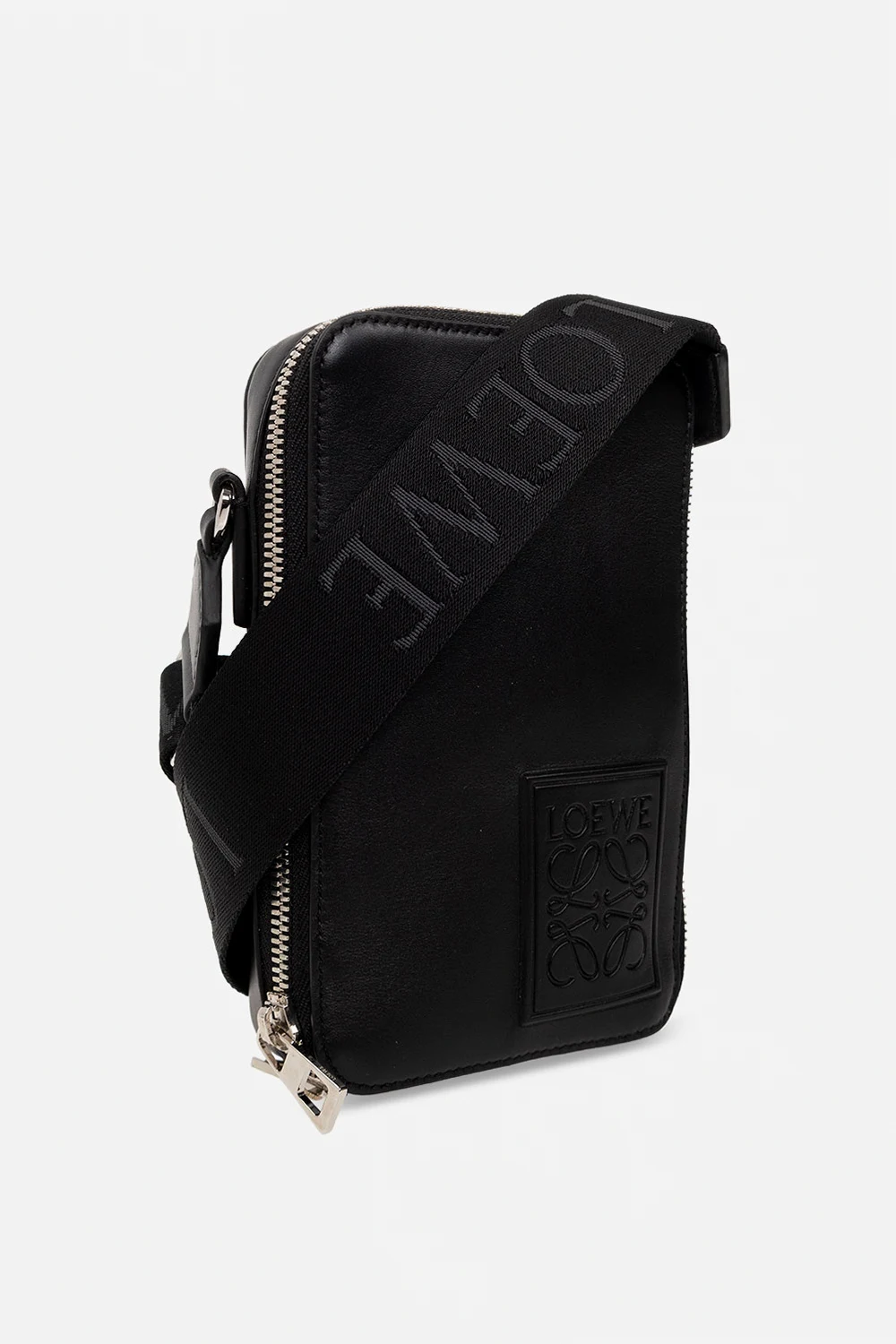 Black ‘Vertical’ shoulder bag from Loewe. Crafted from leather, this design fastens with a two-way zipper and showcases a logo-embossed patch, a shoulder strap, silver-tone metal hardware and one internal compartment.