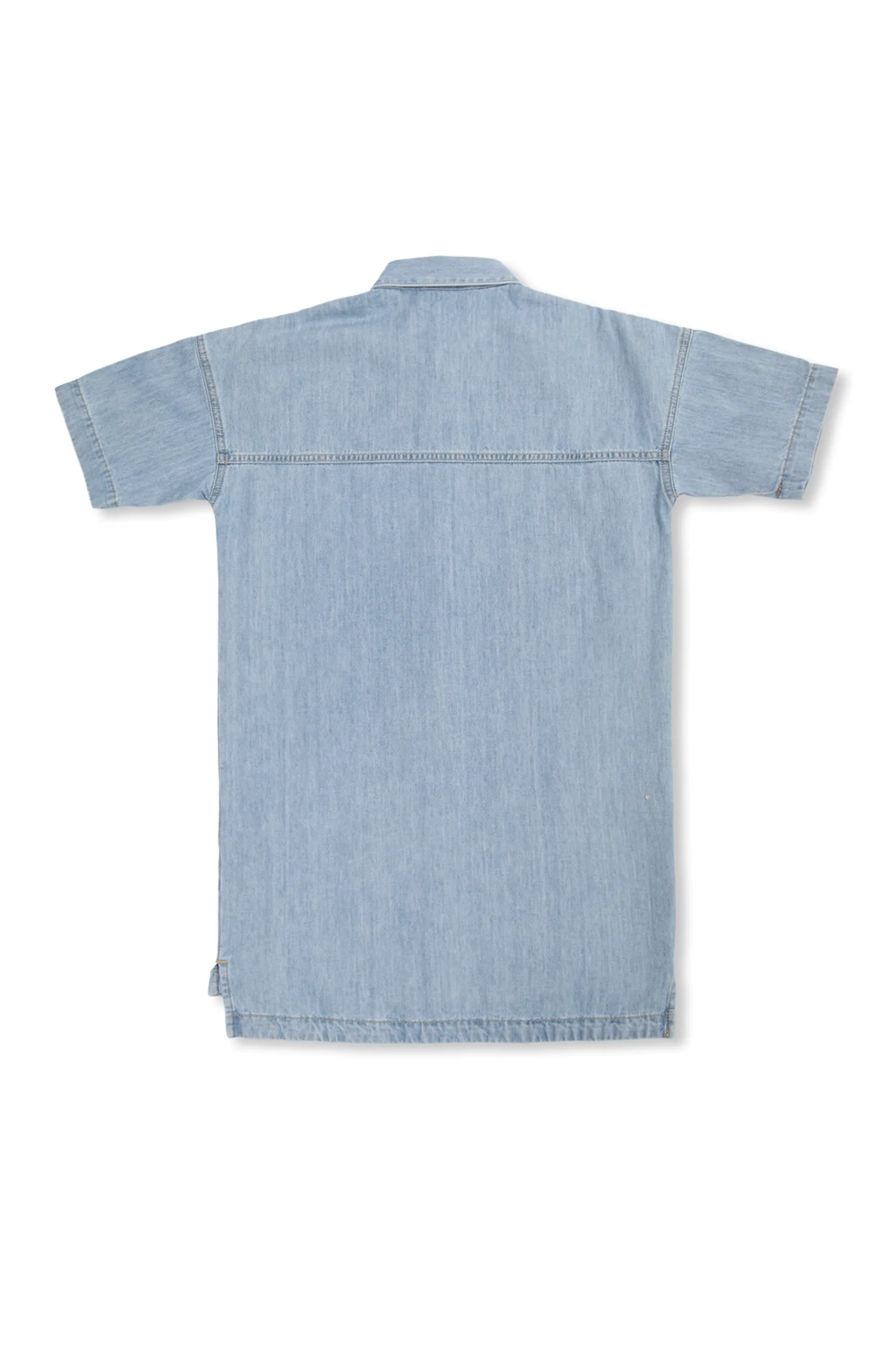 Blue denim dress from Palm Angels Kids. Cut with an elongated back hem, this style features a printed logo and one pocket on the front, button fastenings, side slits and short sleeves with cream and black taping.