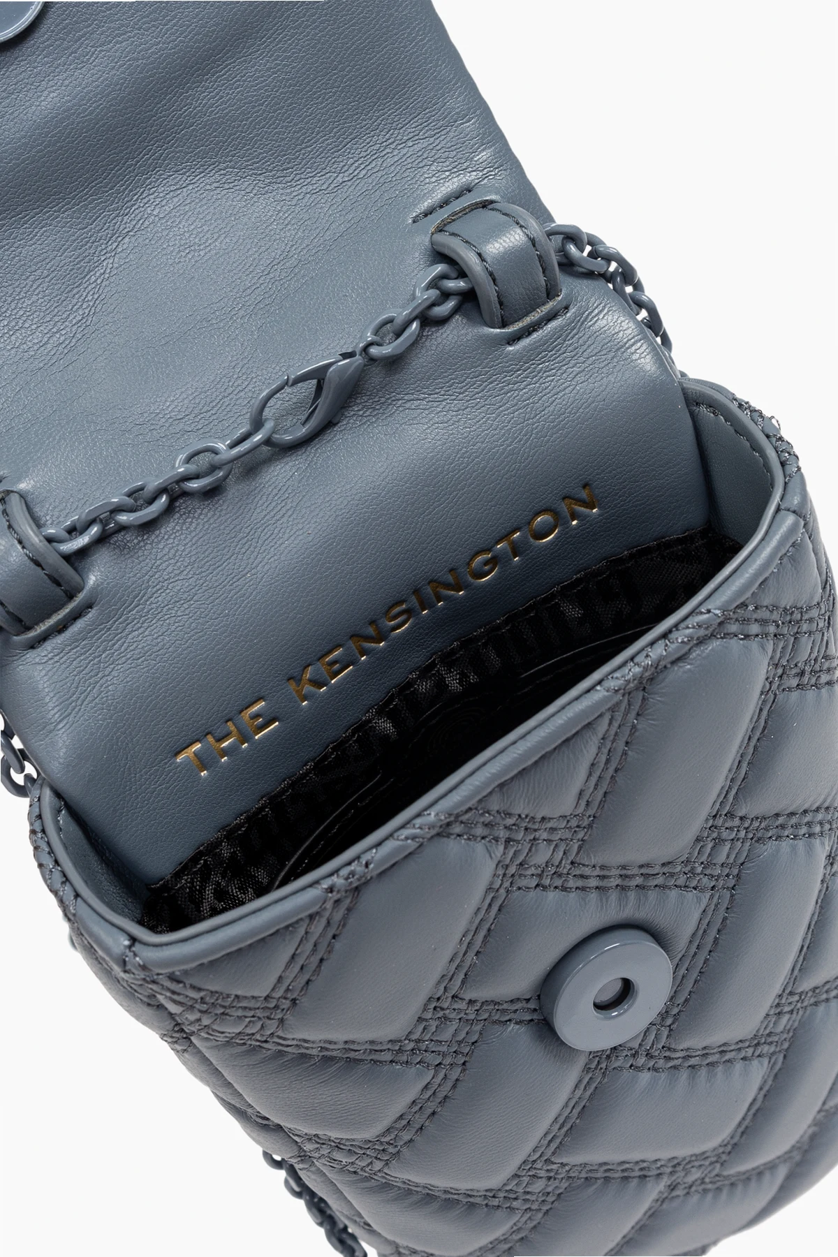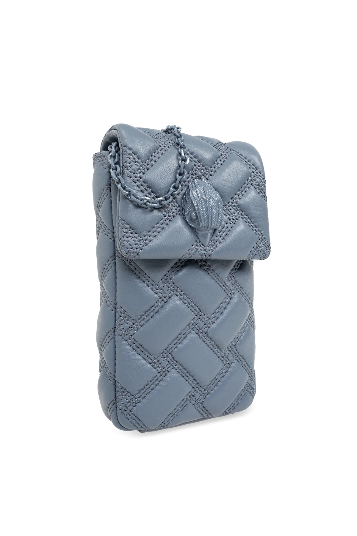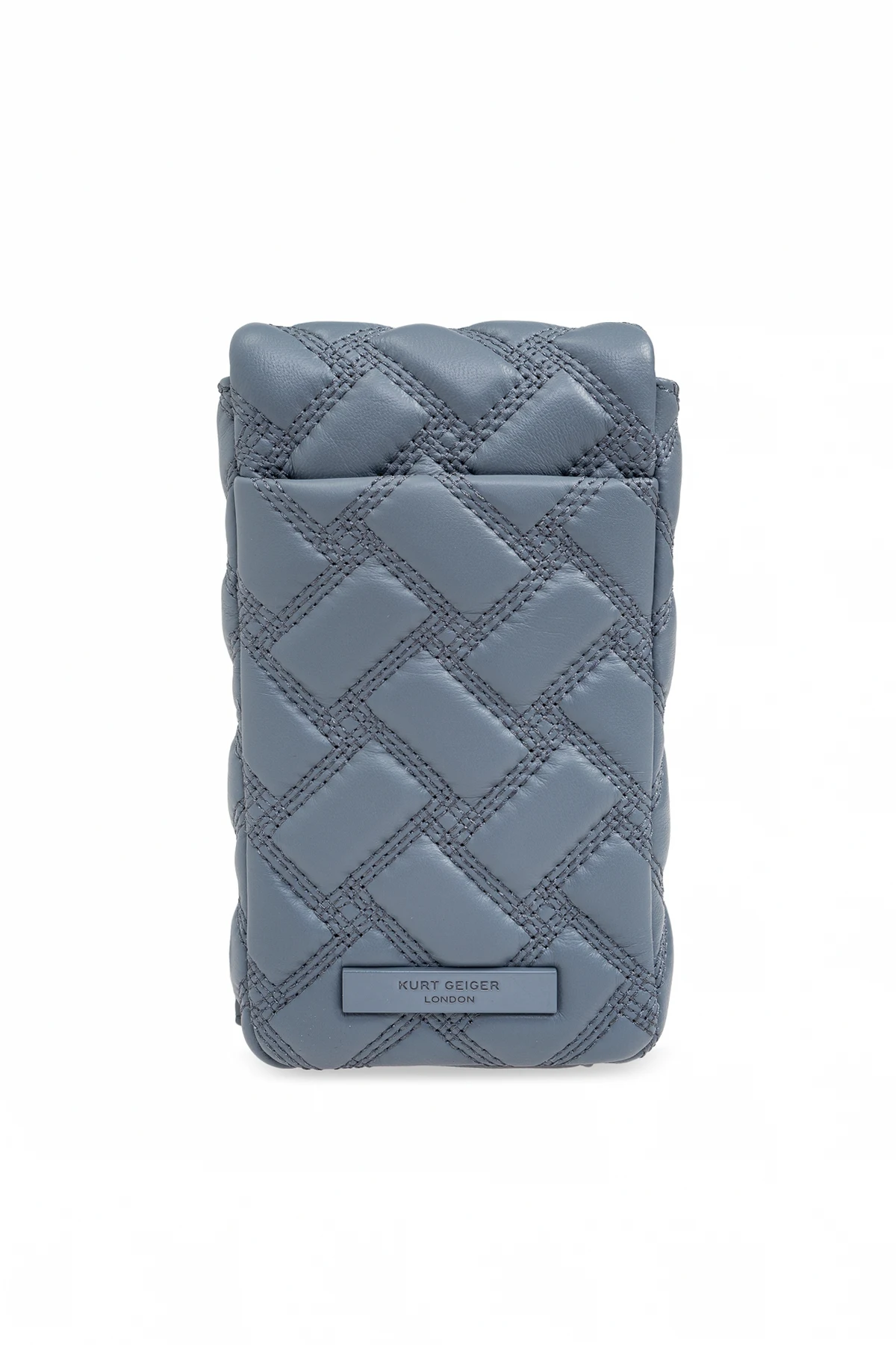 Introducing the epitome of refined luxury in mobile accessories - the `Kensington` Belt Phone Case by the renowned designer Kurt Geiger. Meticulously crafted from 100% genuine leather, this exquisite piece boasts a symmetrical quilted pattern that forms larger diamonds through its intersecting diagonal lines, emanating an aura of sophistication and elegance. The case\'s serene gray-blue shade serves as a testament to its understated elegance, making it a versatile addition to any ensemble. Its front is adorned with a decorative shield-shaped clasp featuring an embossed pattern, which not only adds to its aesthetic appeal but also secures your treasured device with a magnetic snap closure. For added functionality and style, the case includes a chain strap, allowing for shoulder or cross-body wear, perfect for the modern woman on the move. Noteworthy details include the embossed designer logo, subtly placed at the bottom of the case for brand recognition, and the engraved “THE KENSINGTON” on the metal element of the strap, echoing the collection\'s name. The interior is thoughtfully designed with a compartment and a card slot, ensuring your essentials are neatly organized. Why Purchase This Product? Elegant and luxurious quilted leather design. Versatile gray-blue color suitable for various occasions. Decorative and functional shield-shaped magnetic clasp. Chain strap for multiple wearing styles. Interior compartment and card slot for organization. Signature branding details for authenticity.