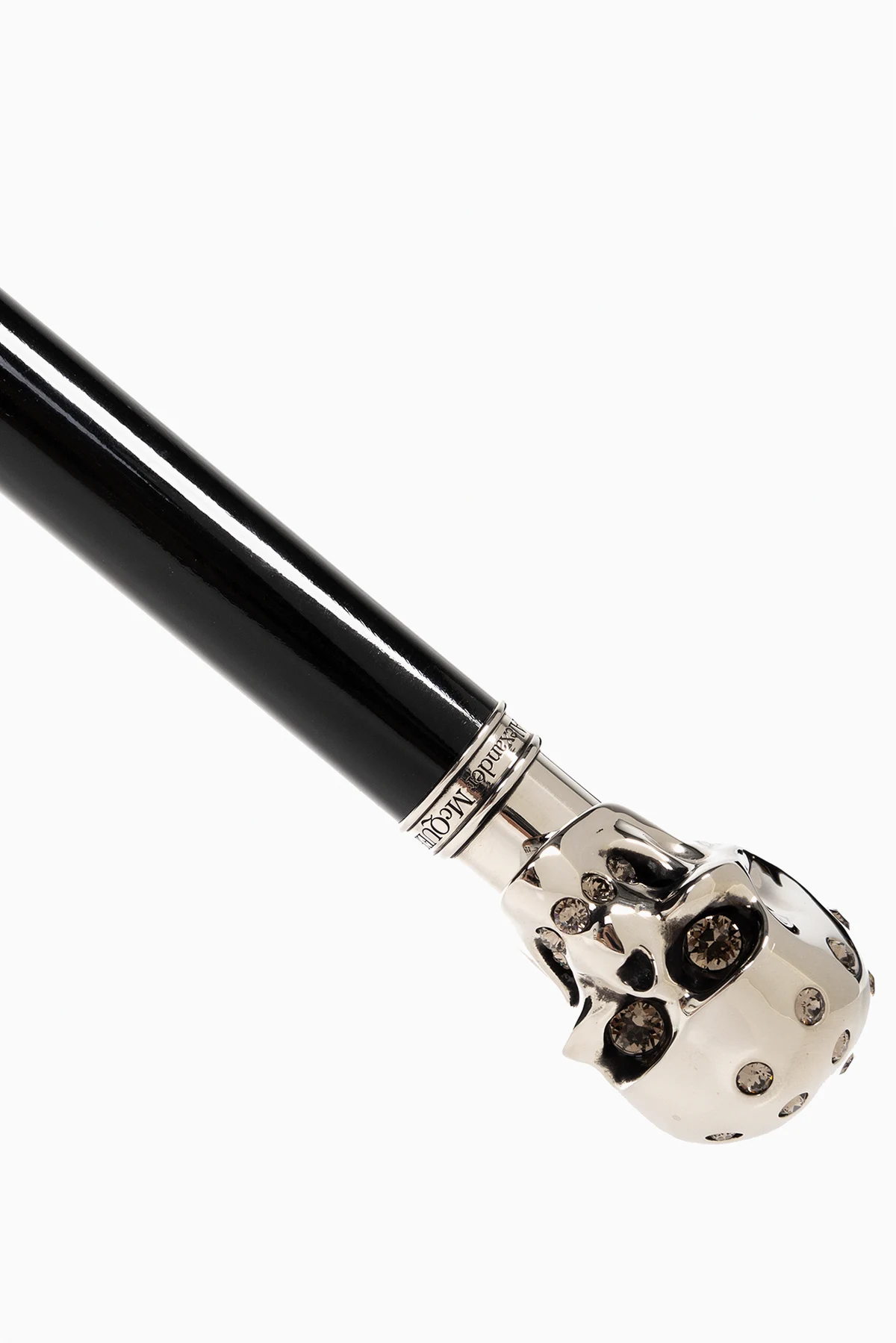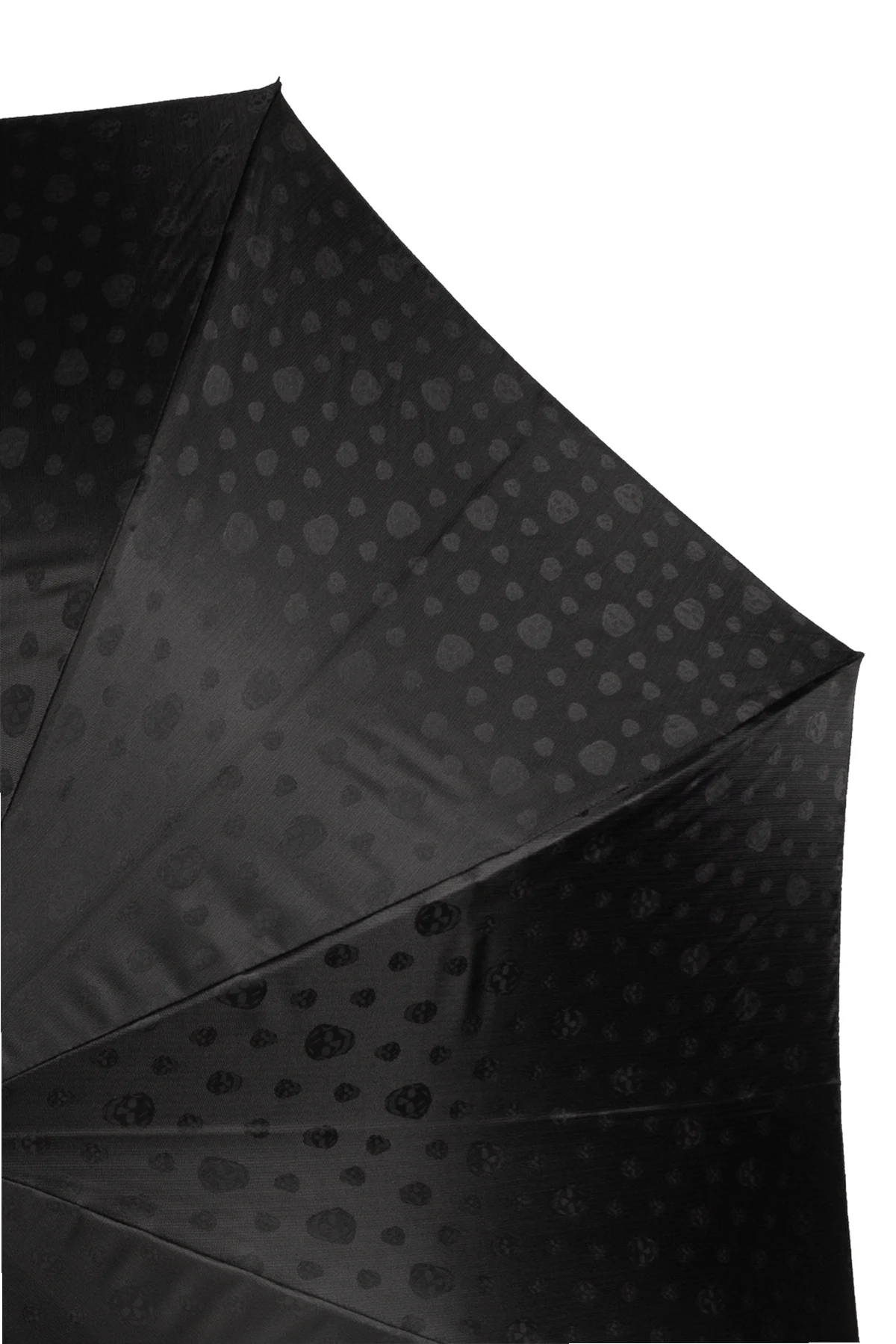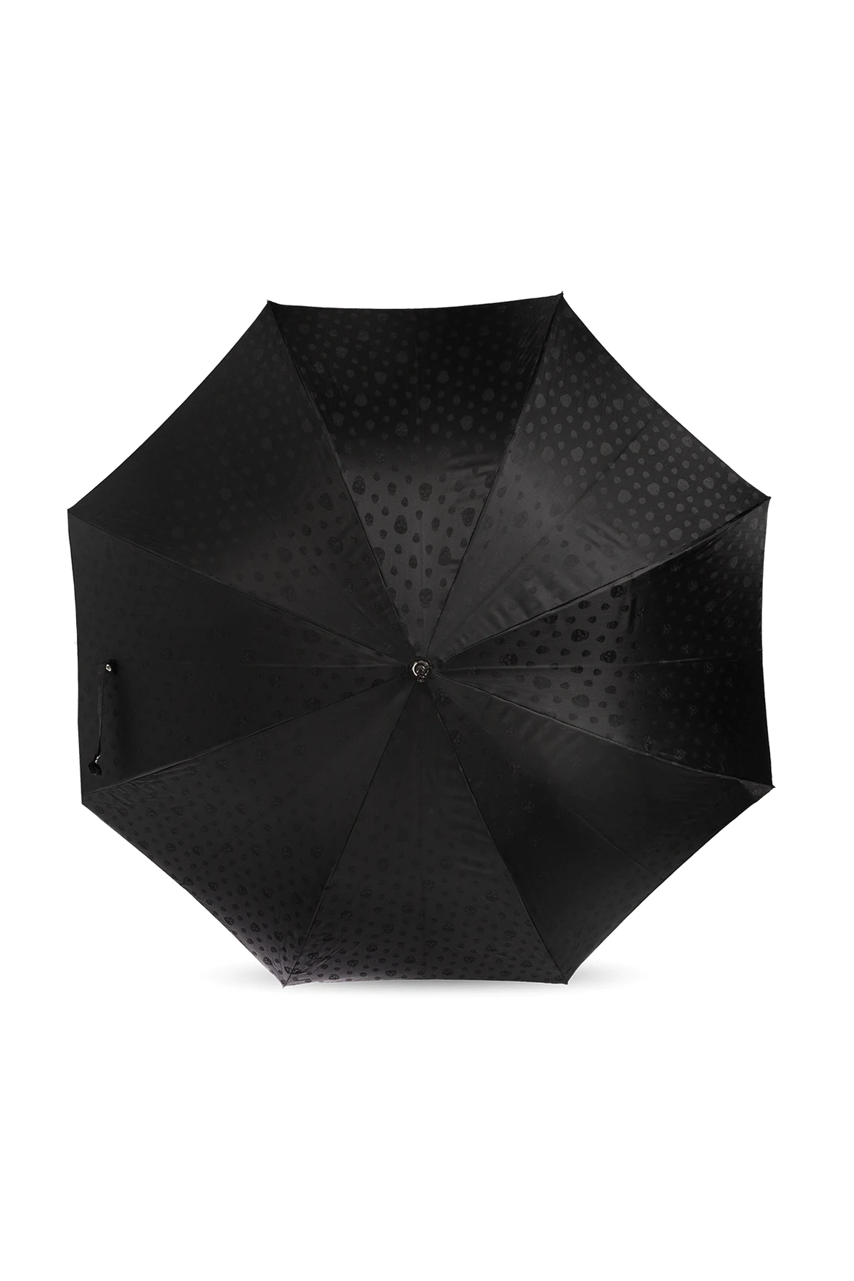 Black umbrella from Alexander McQueen. Made of monogram fabric, this design features a decorative handle with the brand’s signature skull embellished with crystals.
