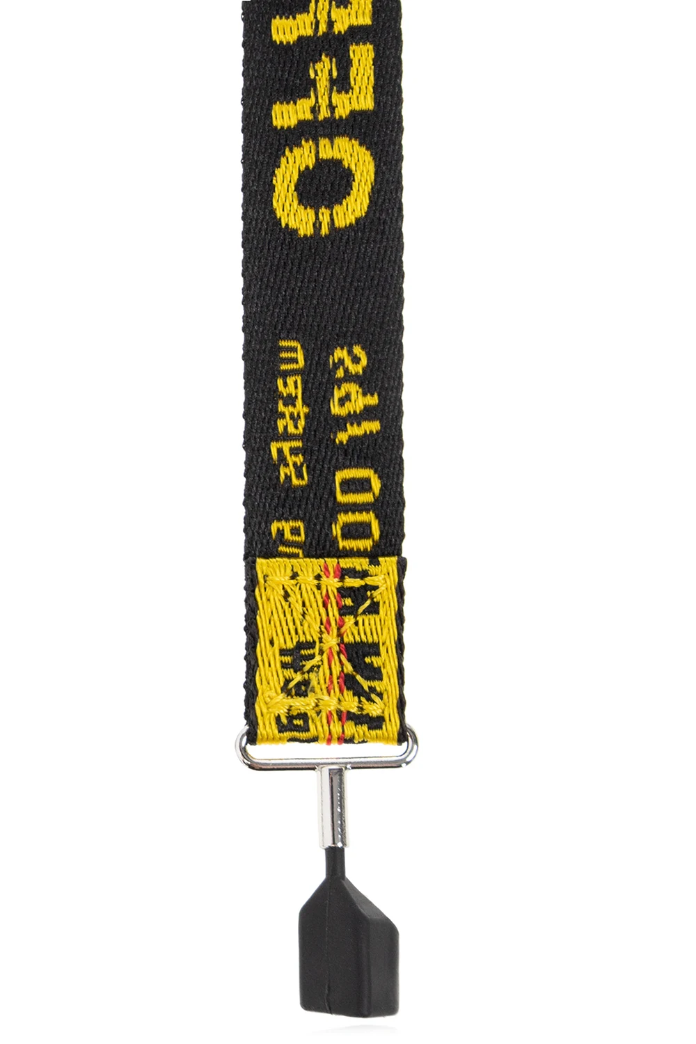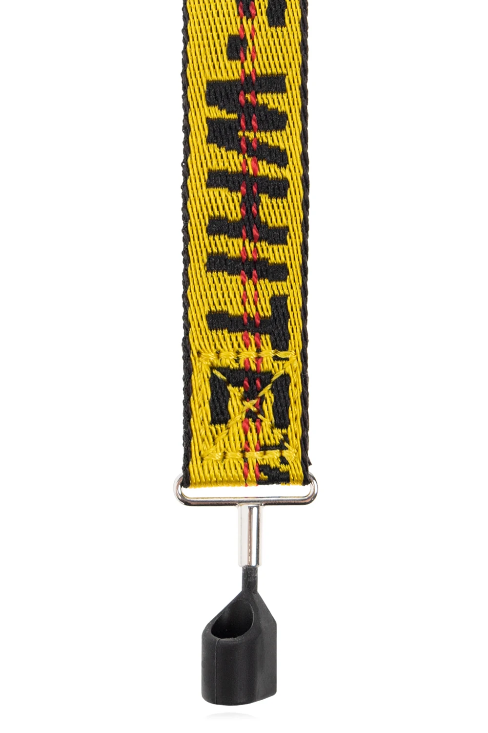 Yellow AirPods strap from Off-White. This design features a black logo embroidery, red stitching details and magnetic silicone AirPods holders.