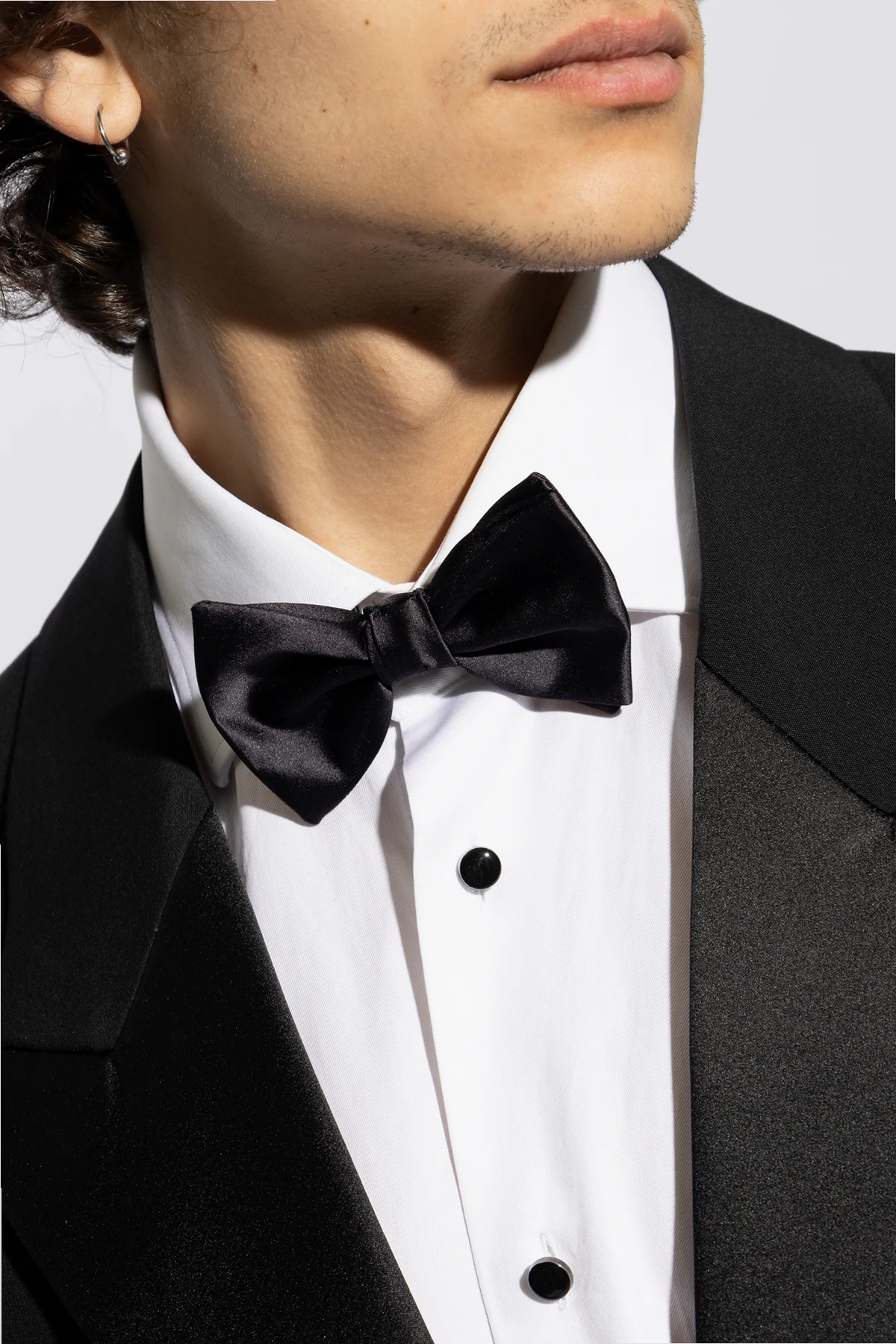 Introducing the quintessence of sartorial elegance: the Giorgio Armani Navy Silk Bow Tie. This exquisite accessory, crafted from the finest silk, radiates sophistication and luxury, making it an impeccable choice for formal occasions such as galas, weddings, and official gatherings. Featuring a classic butterfly shape with symmetrically aligned wings cinched at the center, this bow tie exudes a timeless appeal. The heart of the bow is delicately tapered, accentuating its form and enhancing its graceful elegance. The smooth and lustrous silk material underscores its luxurious quality, pleasing to the touch and visually stunning. The bow tie is equipped with an adjustable metal clasp, ensuring a perfect fit around the neck and showcasing the meticulous attention to detail and craftsmanship. The clasp is subtly adorned with the Giorgio Armani logo, serving as a hallmark of authenticity and designer prestige. Moreover, the deep navy hue of the bow tie offers versatility, effortlessly complementing a myriad of formal attire. Why Purchase This Product? Exemplifies luxury and elegance with its pure silk composition and classic design. Adjustable fit for optimal comfort and versatility. Features the esteemed Giorgio Armani logo, affirming its authenticity and designer quality. The navy color enhances its utility, making it a staple accessory for any formal occasion.