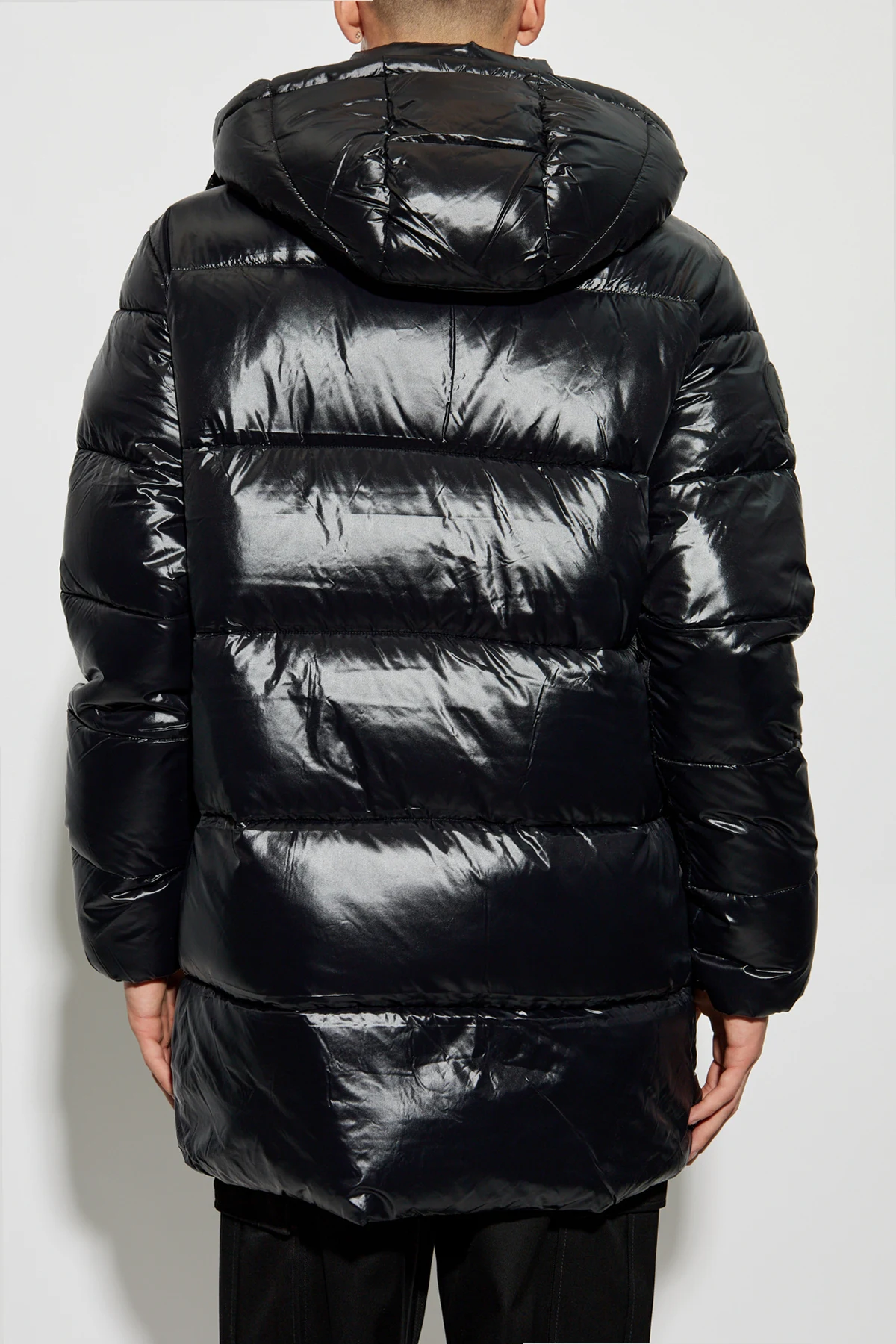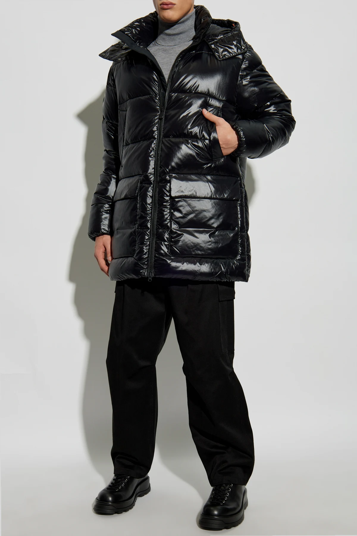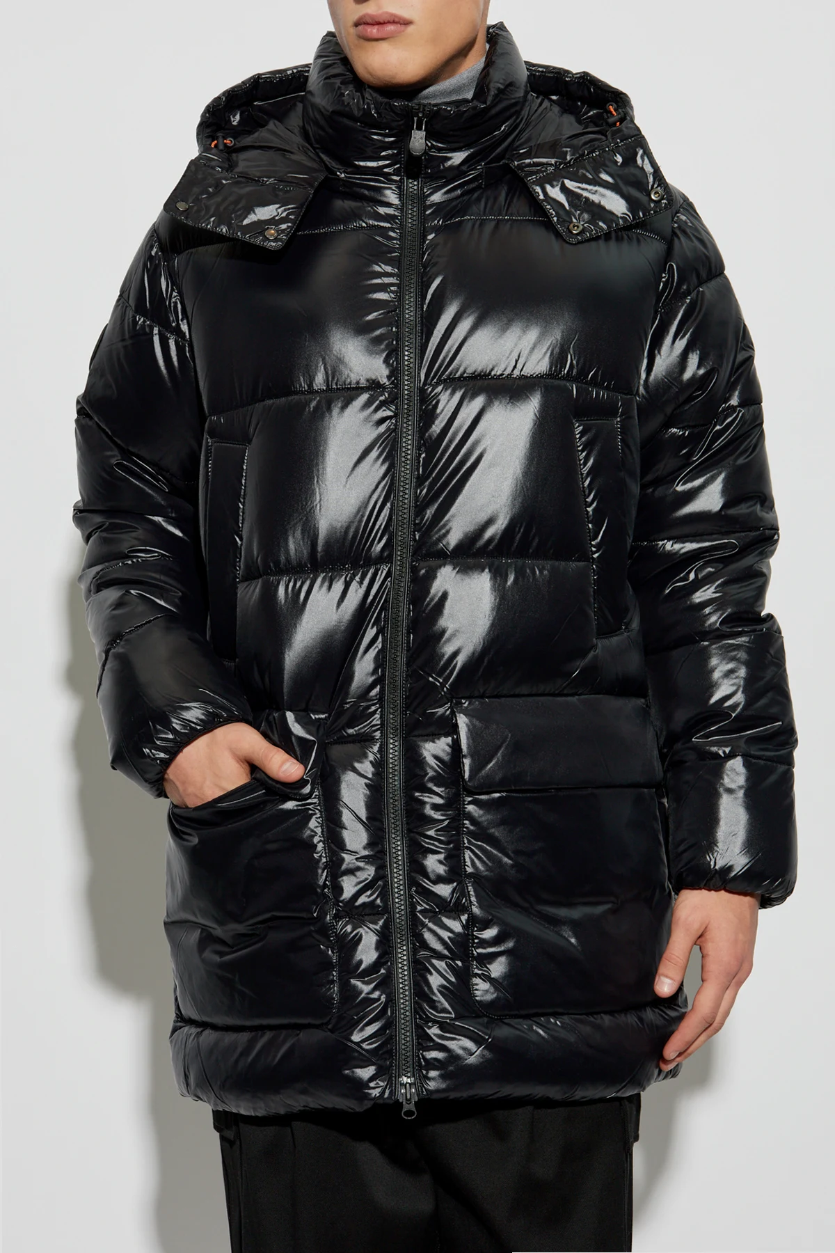 Introducing the Christian Puffer Jacket by the esteemed designer Save The Duck, an epitome of refined elegance and innovative craftsmanship. Cloaked in a lustrous black, this jacket is meticulously crafted from water-resistant nylon, offering an exquisite sheen and unparalleled protection against the elements. Its sleek silhouette is tailored with a slightly extended length and horizontal quilting, ensuring warmth and style in cooler climates. The jacket boasts four spacious, snap-button pockets, complemented by a centrally placed, dual-directional zipper, discreetly shielded for added resilience. Adorned with a detachable hood, it provides additional defense against wind and rain. A distinctive circular logo embossed on the sleeve signifies exclusivity and brand prestige. Why Choose This Product? Crafted with PLUMTECH® technology, offering animal-friendly warmth. Elegant design with functional features for everyday wear. Four practical pockets for ample storage. Exclusivity marked by the signature logo detailing.