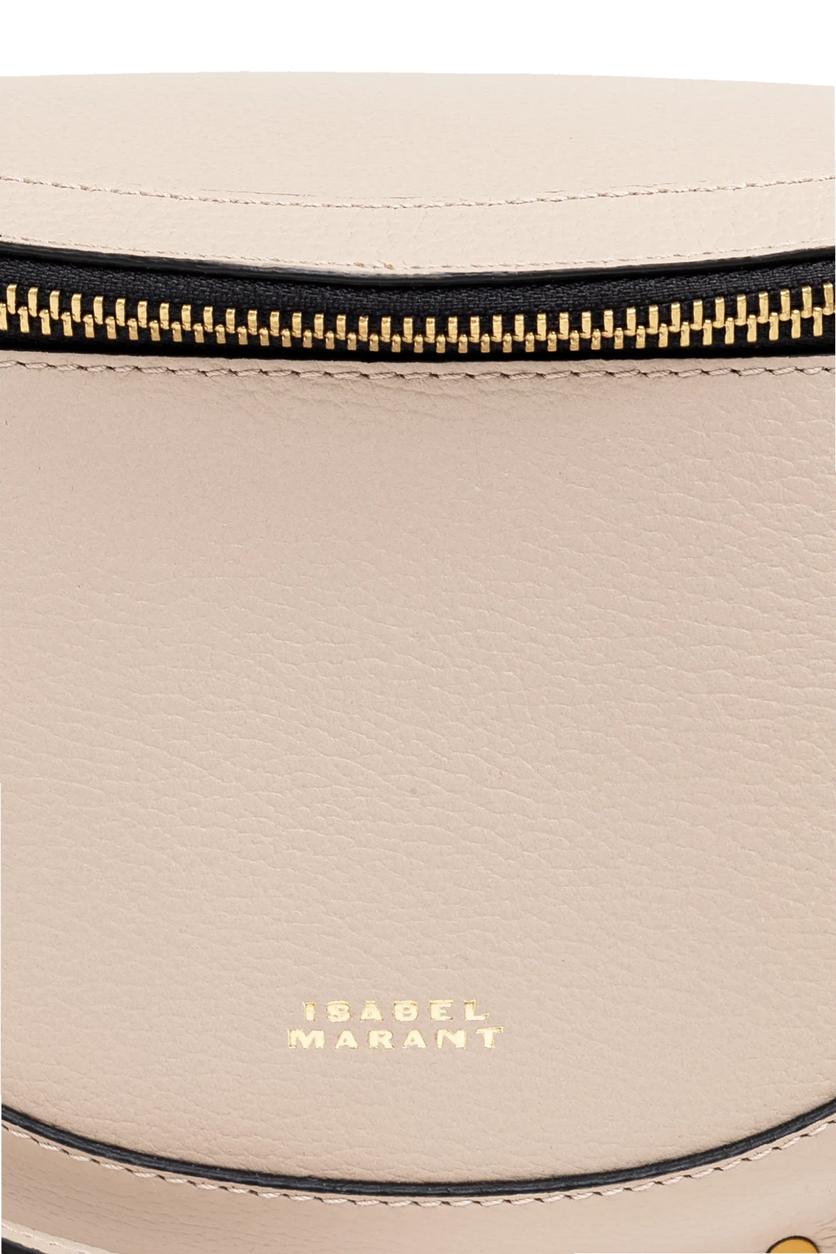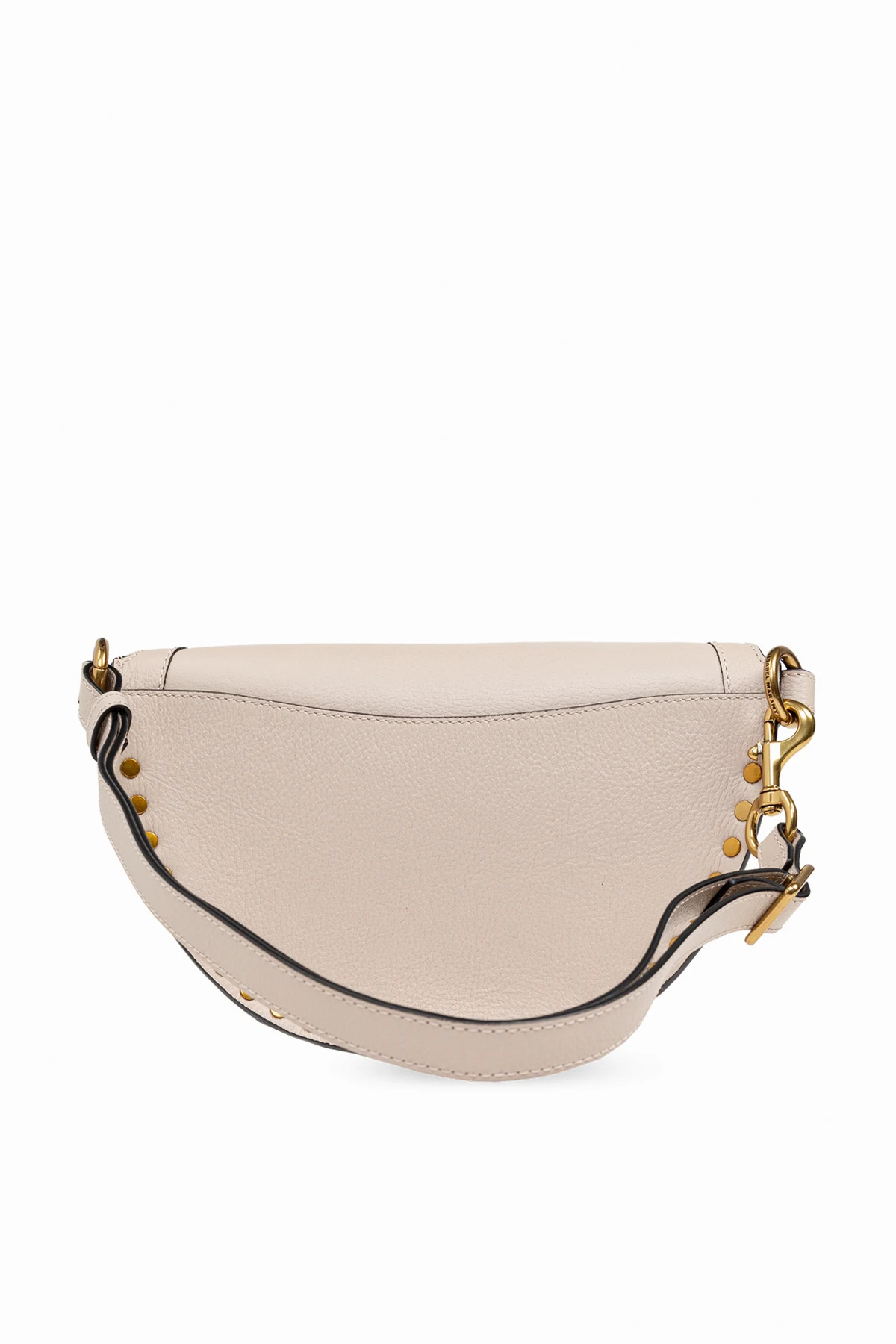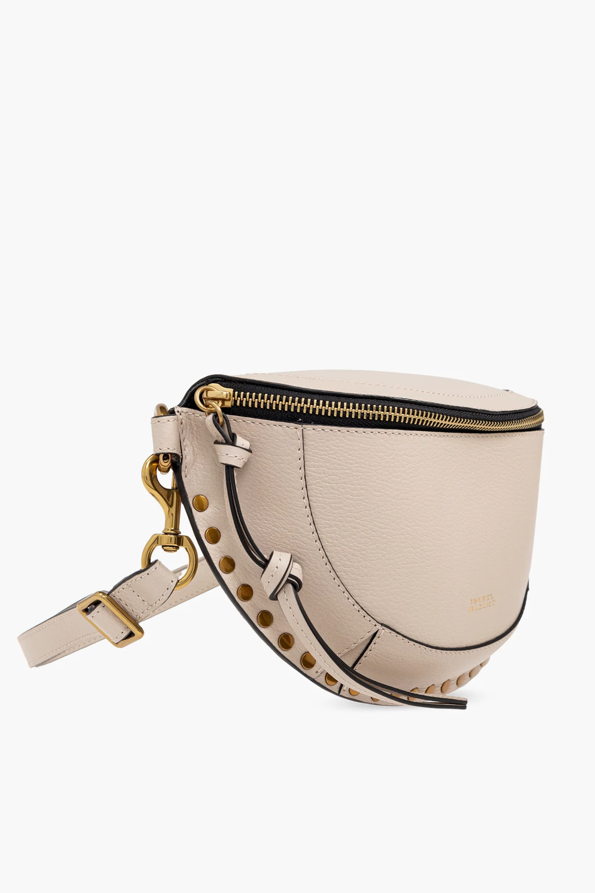Introducing the ‘Skano’ Belt Bag by Isabel Marant, a paragon of elegance and functionality. Crafted from 100% high-quality leather, this accessory boasts a unique crescent shape and a subtle texture that exudes sophistication. Its light beige hue is complemented by exquisite gold-tone hardware, including a secure zipper closure, decorative studs that encircle the front perimeter, and an adjustable strap that ensures a perfect fit. The Skano is not just about its alluring aesthetics; it’s designed for convenience and style. The inside features a contrasting dark leather pocket, adding an element of surprise and practicality to its sleek design. A delicately embossed logo above the zipper and a subtle gold logo on the front further enhance its exclusivity, making it a must-have accessory that transitions seamlessly from day to night. Why Choose the ‘Skano’ Belt Bag? Unparalleled Craftsmanship: 100% premium leather construction with meticulous attention to detail. Distinctive Design: Crescent shape with gold-tone accents and decorative studs for a touch of glamour. Versatility: Suitable for everyday wear and special occasions alike. Functionality: Features an internal pocket for added utility, keeping essentials secure and organized.