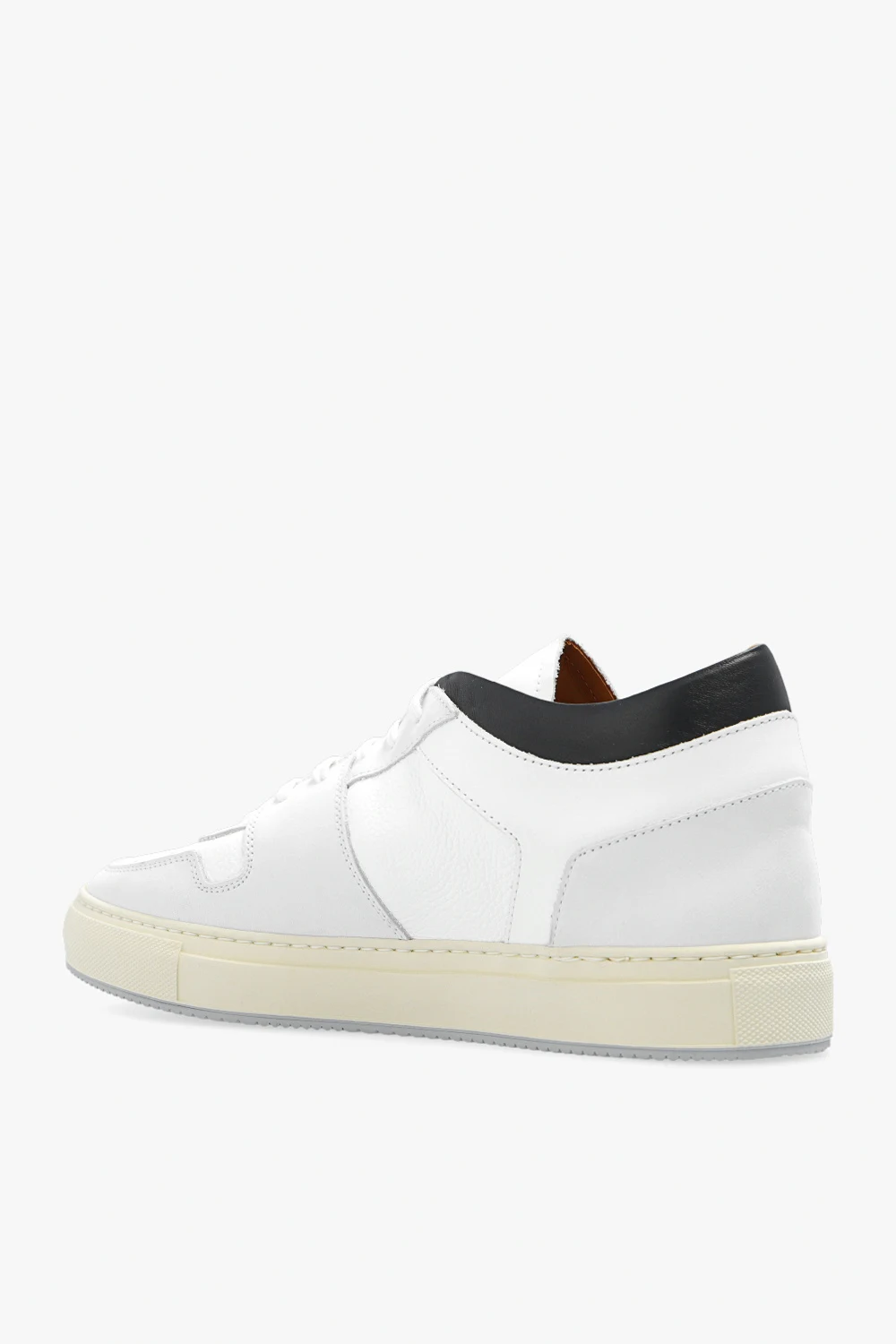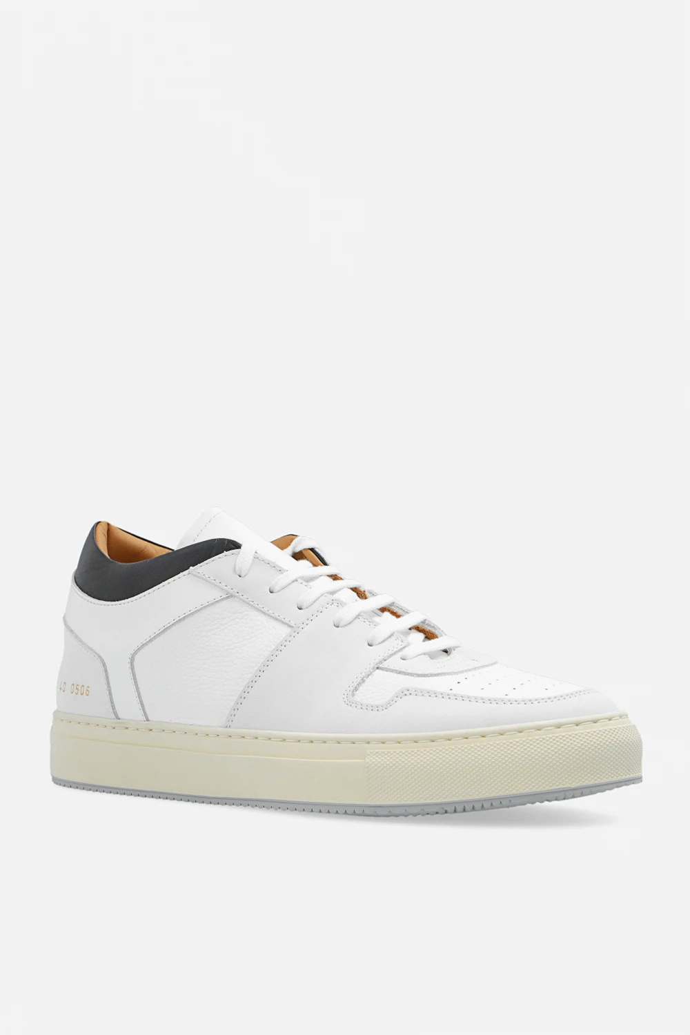 White ‘Decades Mid’ sneakers from Common Projects. Made of leather, this lace-up pair features a gold-tone print, perforations on the front, dark green trims and rubber sole in cream and grey. Comes with swappable shoelaces.