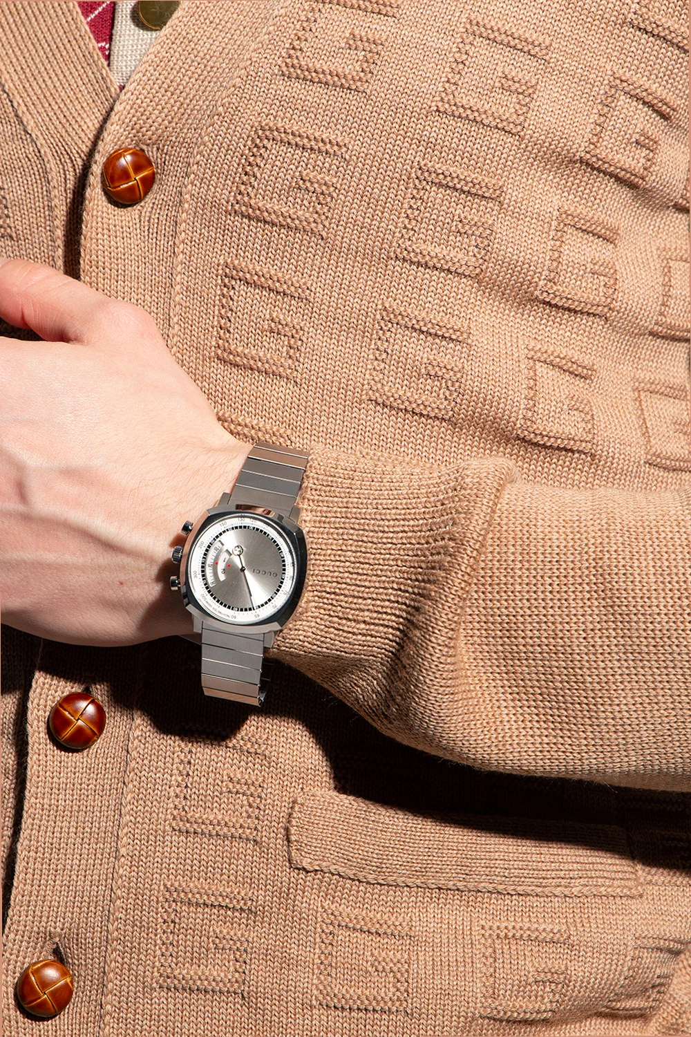 Silver-tone ‘Grip’ quartz watch from Gucci. Made of stainless steel, this item features a white and silver-tone logo on the dial, decorative hand, sapphire glass with antireflective coating, chronometer and adjustable strap. Waterproof up to 30 m.