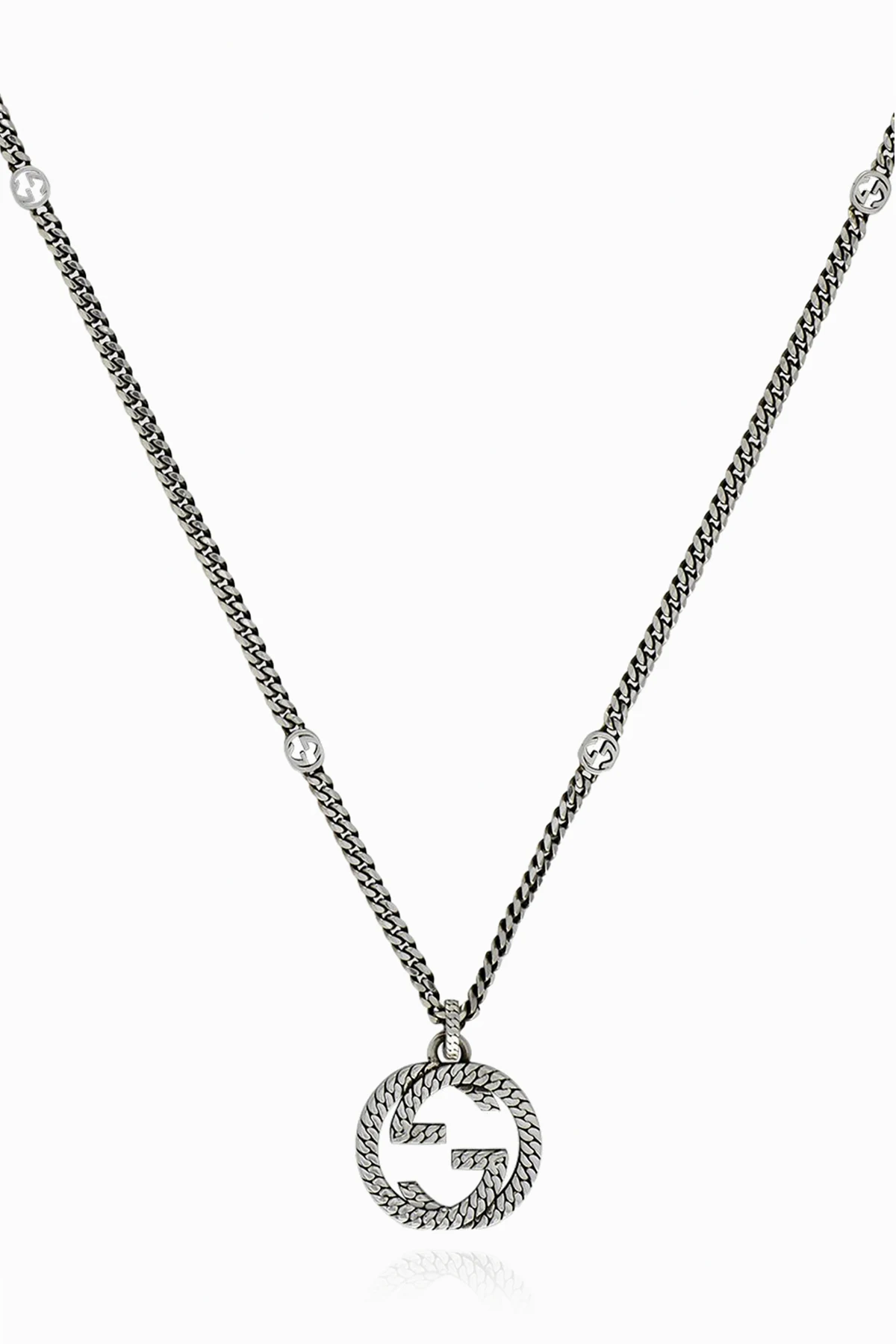 Introducing the quintessence of sophistication and elegance: the Gucci Logo Necklace. Crafted with precision from 925 sterling silver, this exquisite piece epitomizes luxury and finesse. The necklace features a delicate chain adorned with subtle decorative details, seamlessly blending classic charm with contemporary design. At the heart of this magnificent accessory lies a stylized, round pendant, interweaving the iconic Gucci logo into a recognizable symbol that immediately draws the eye. This distinctive logo, meticulously crafted and positioned centrally, serves not only as a hallmark of authenticity but also as a statement of refined taste. The necklace\'s shimmering, polished finish accentuates its allure, making it a captivating addition to any ensemble. Designed with versatility in mind, it boasts a standard closure that allows for effortless adjustability, ensuring a perfect fit and easy wearability. Whether draped elegantly around the neck to accentuate the décolletage for evening affairs or paired with casual daytime attire, this logo necklace adds a touch of glamour and sophistication to any look. Why Purchase This Product? Exemplary Craftsmanship: Made from 100% 925 sterling silver, ensuring durability and lasting shine. Iconic Design: Features Gucci\'s recognizable logo, offering a blend of luxury and identity. Versatile Elegance: Perfect for enhancing both day and evening outfits with its sleek design and polished finish. Adjustable Comfort: Equipped with a standard closure for easy wearability and a customizable fit.